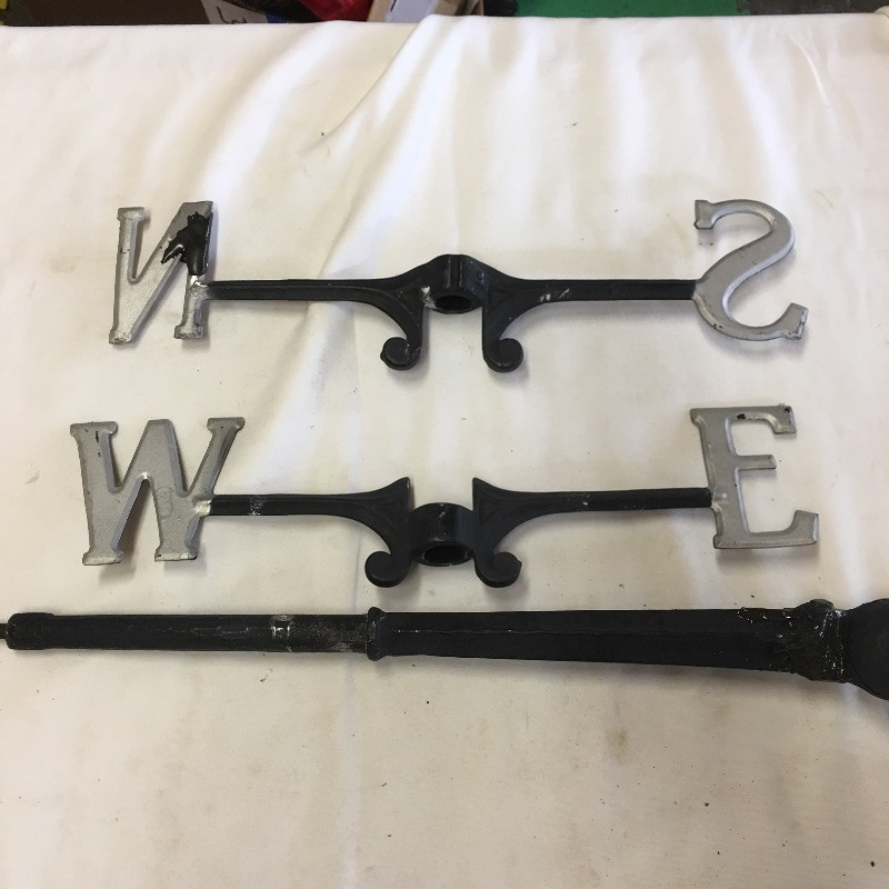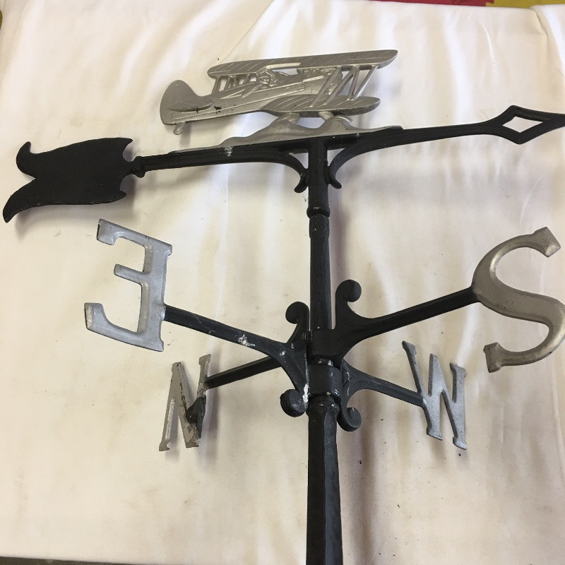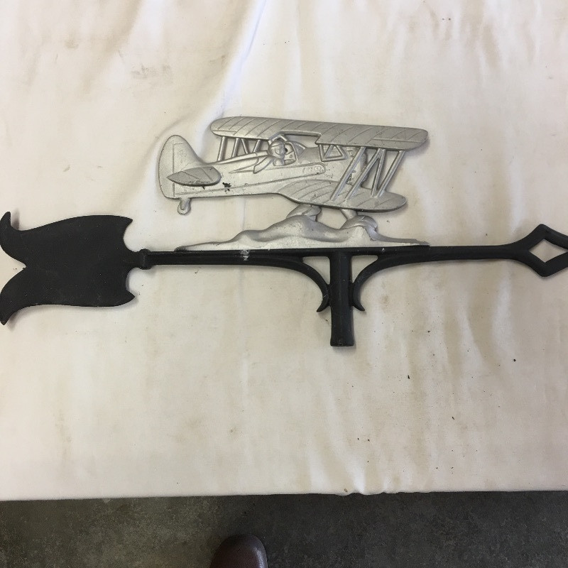 Handsome black metal weather vane with a biplane mounted on the top. Plane and N,E,S, W are a silver colored metal. This item may have seen the odd repair to it but appears to be very sturdy and up to handling the elements, see images. Measures 28” tall and 23” at widest point.