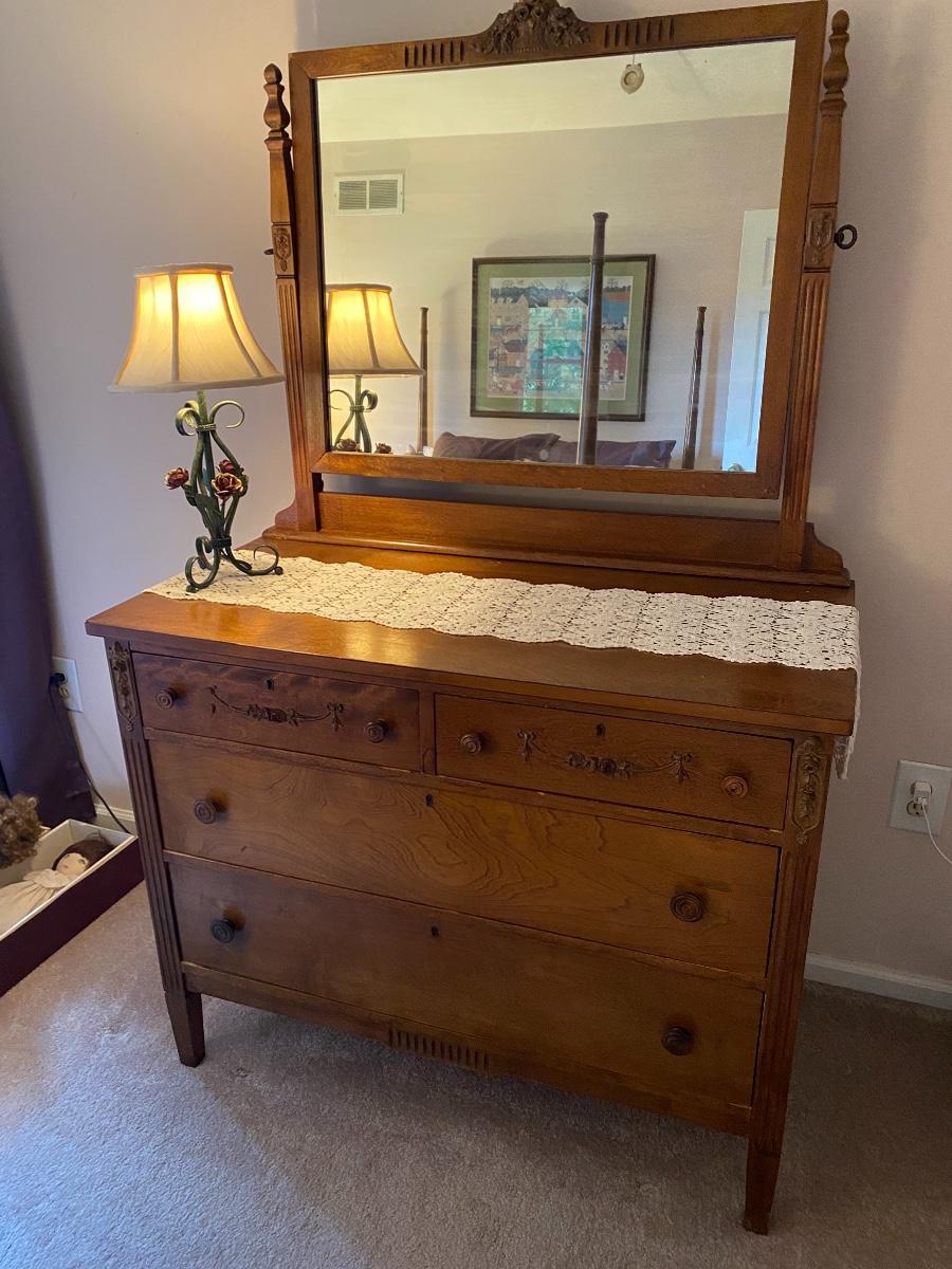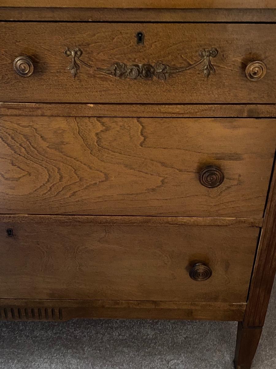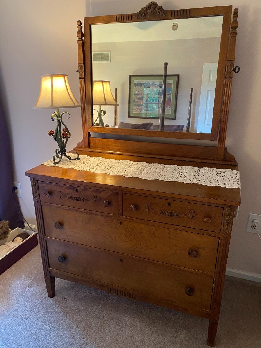 Lot 310: Antique Oak Mirrored Dresser with Carved Accents.