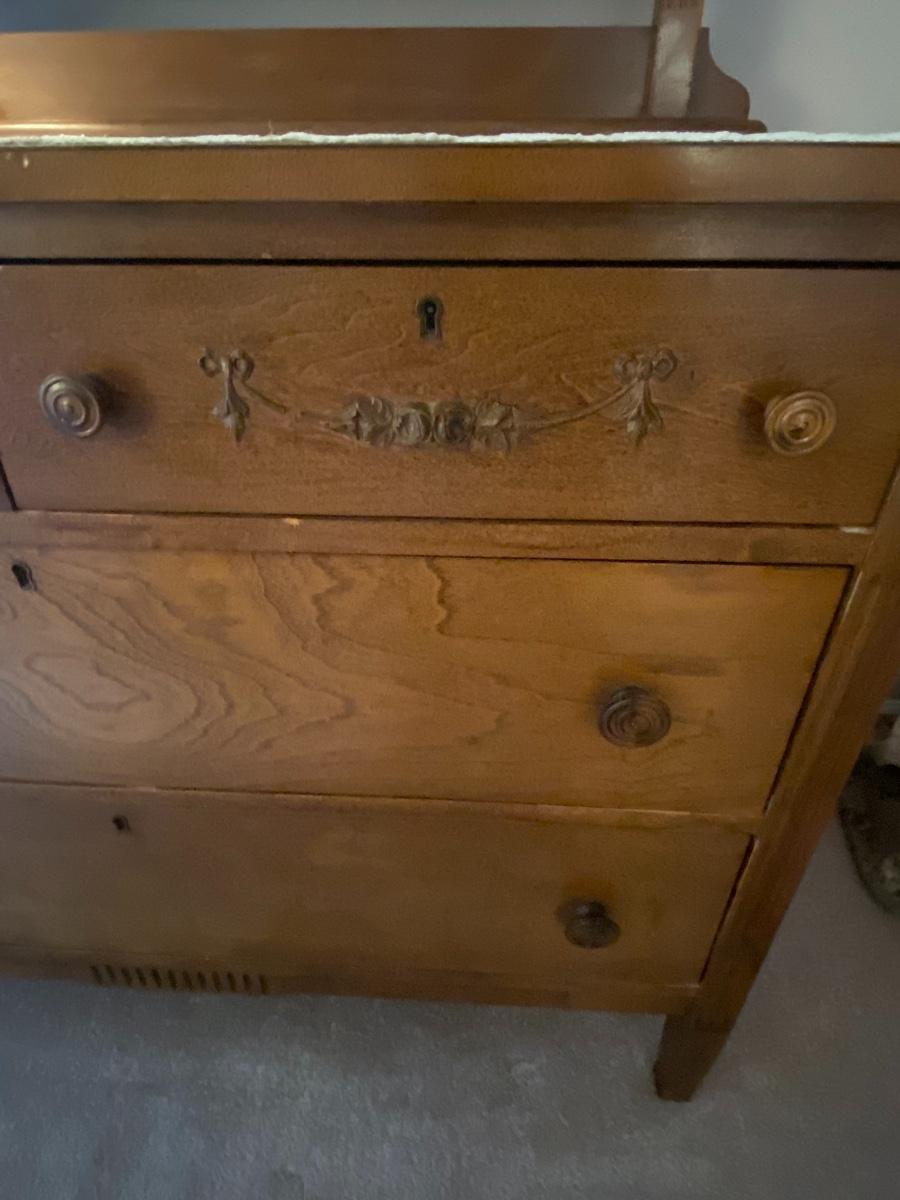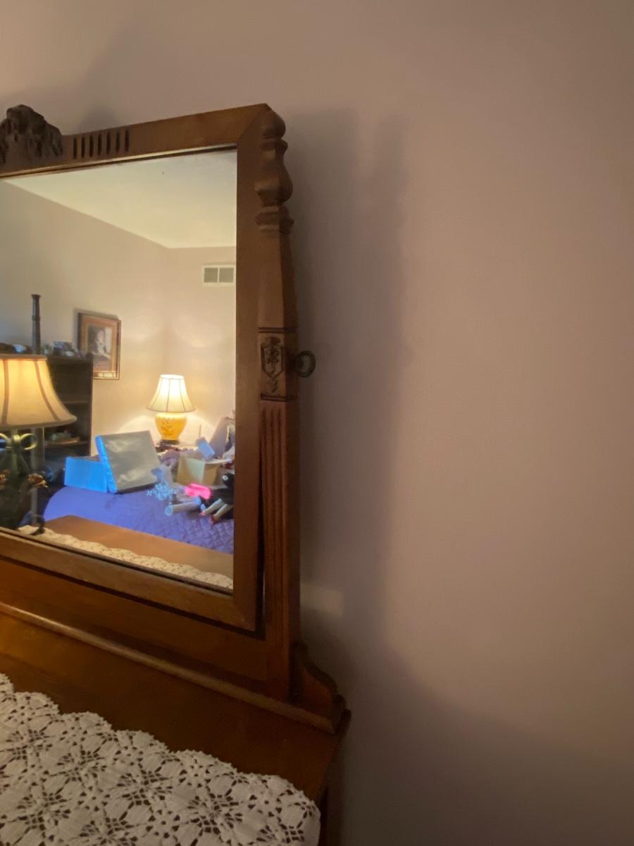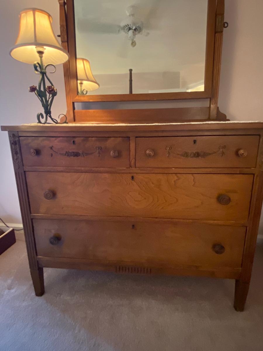 Lot 310: Antique Oak Mirrored Dresser with Carved Accents.