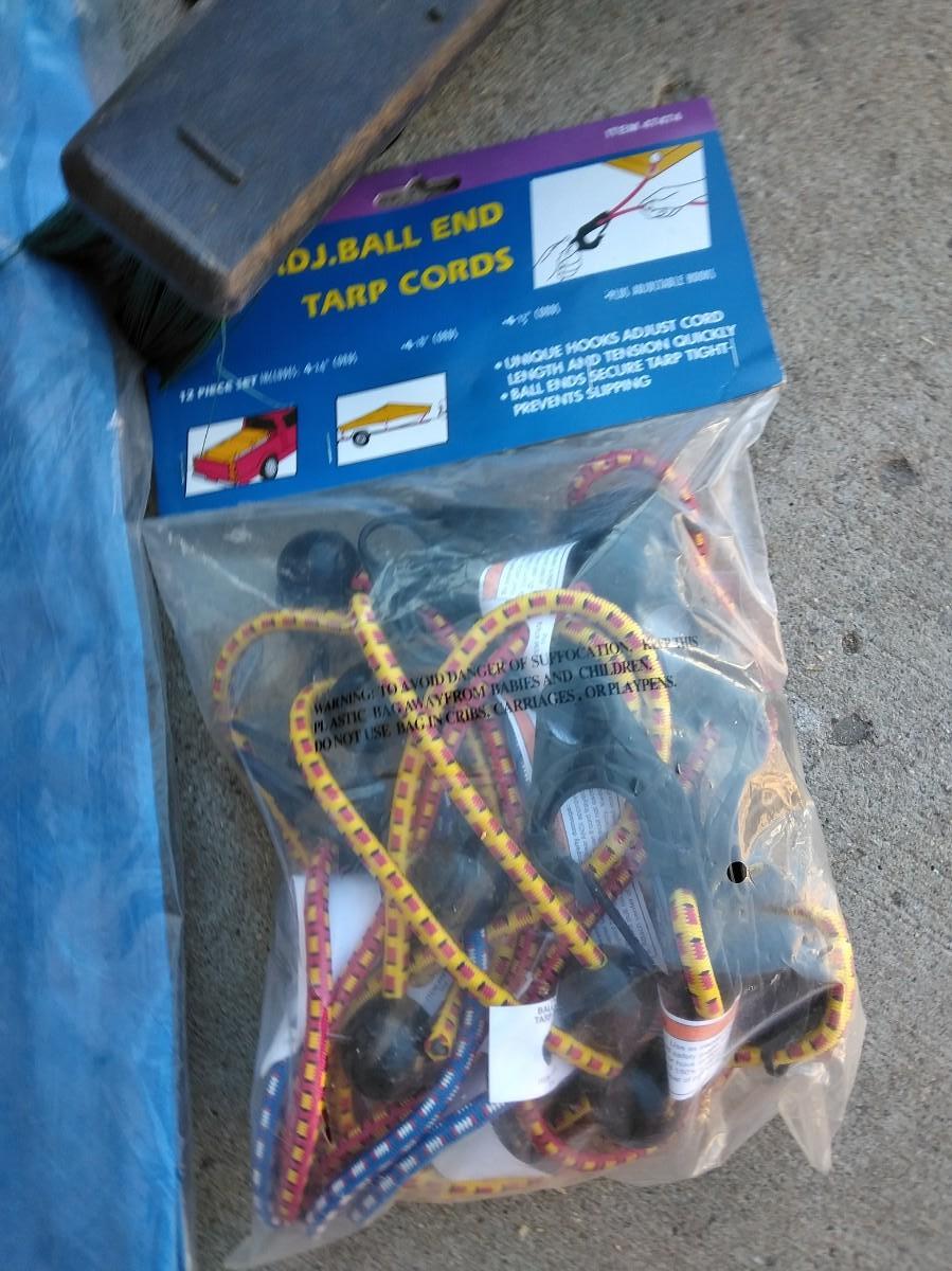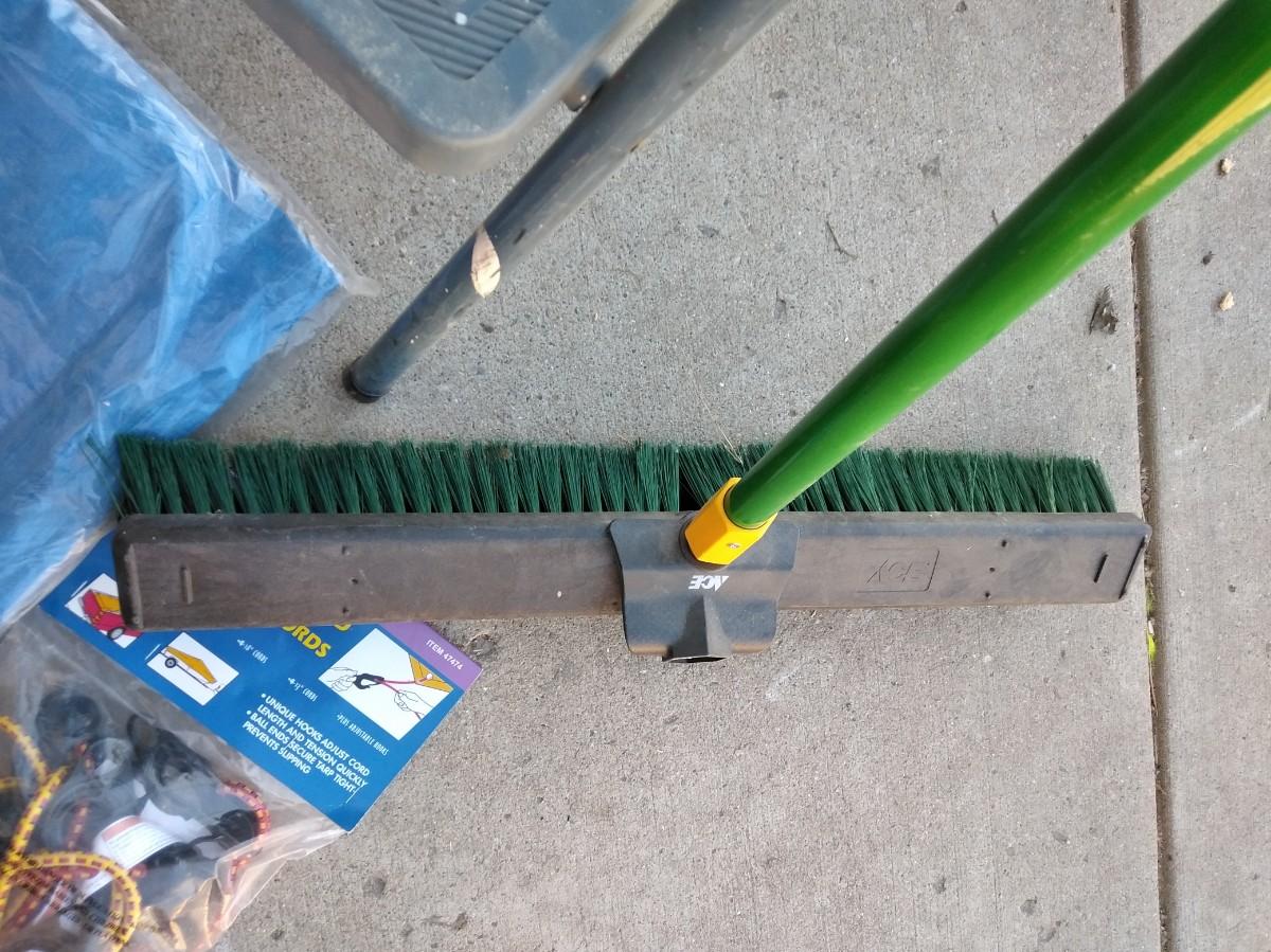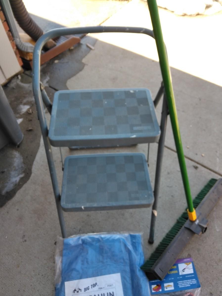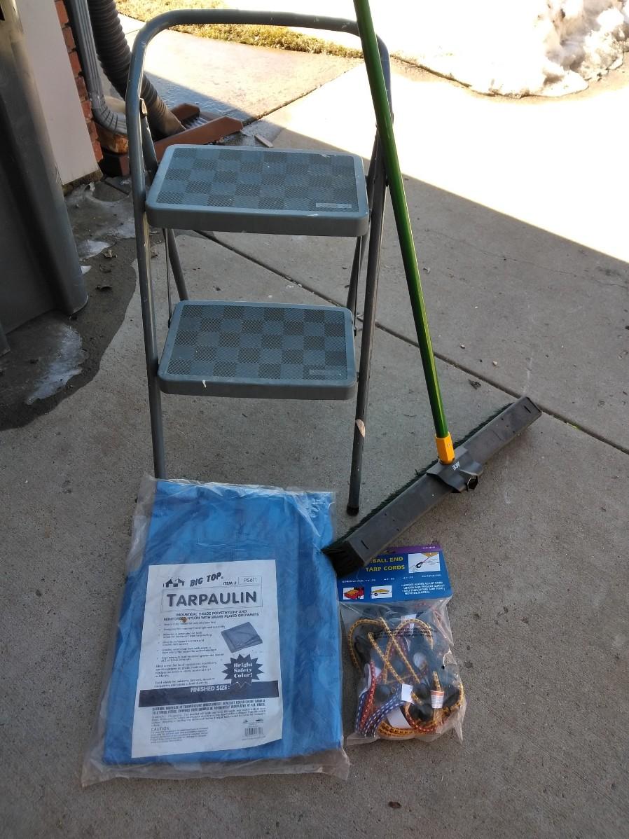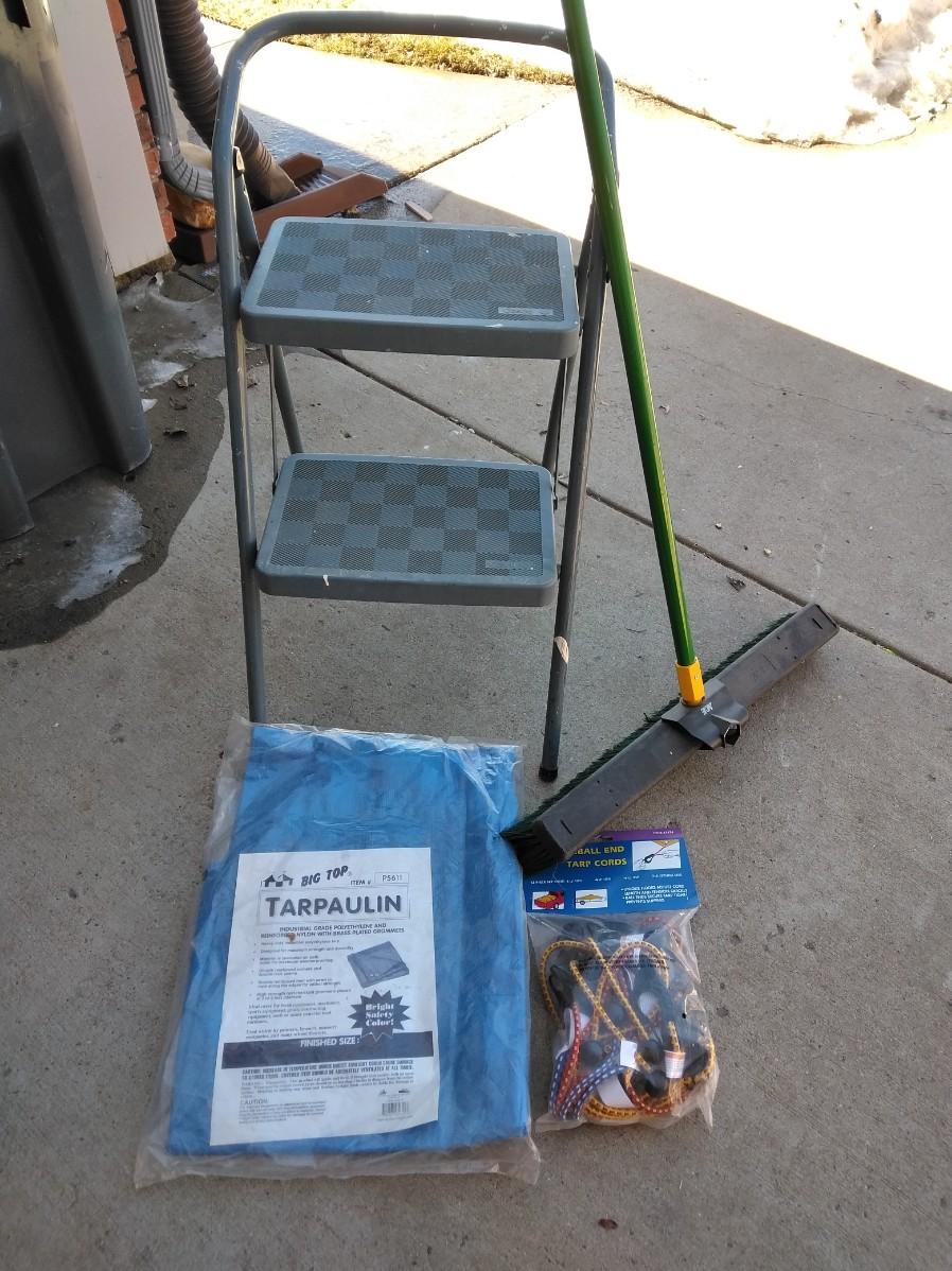 STEP STOOL, PUSH BROOM, NEW TARP AND BUNGEE CORDS