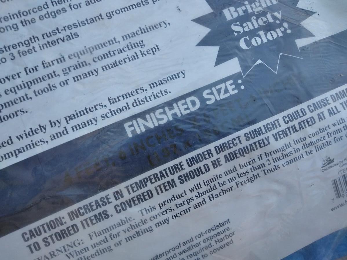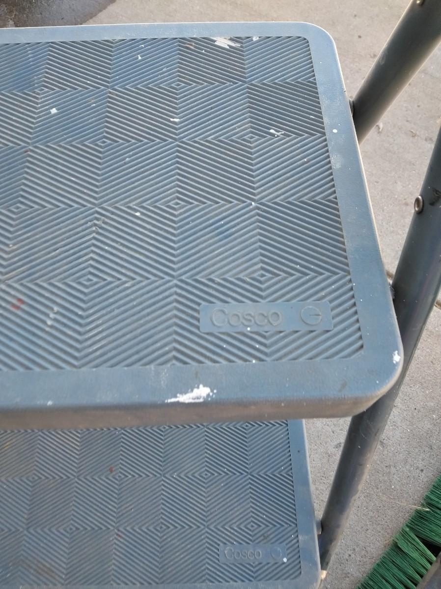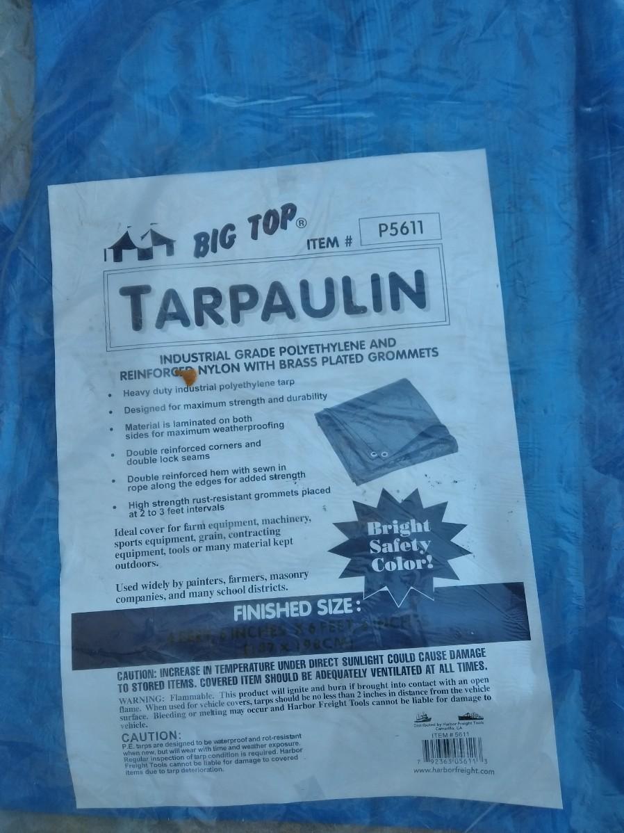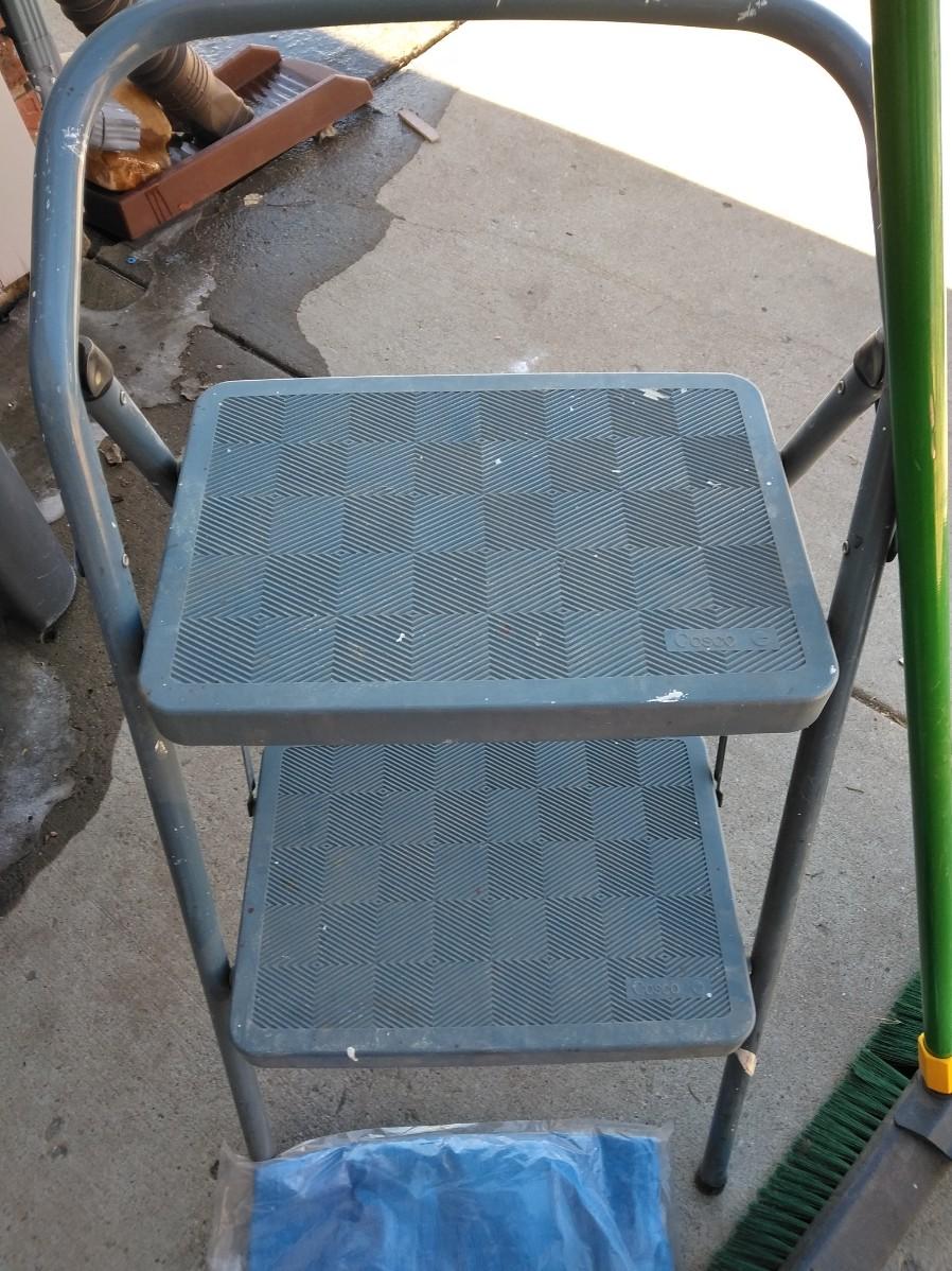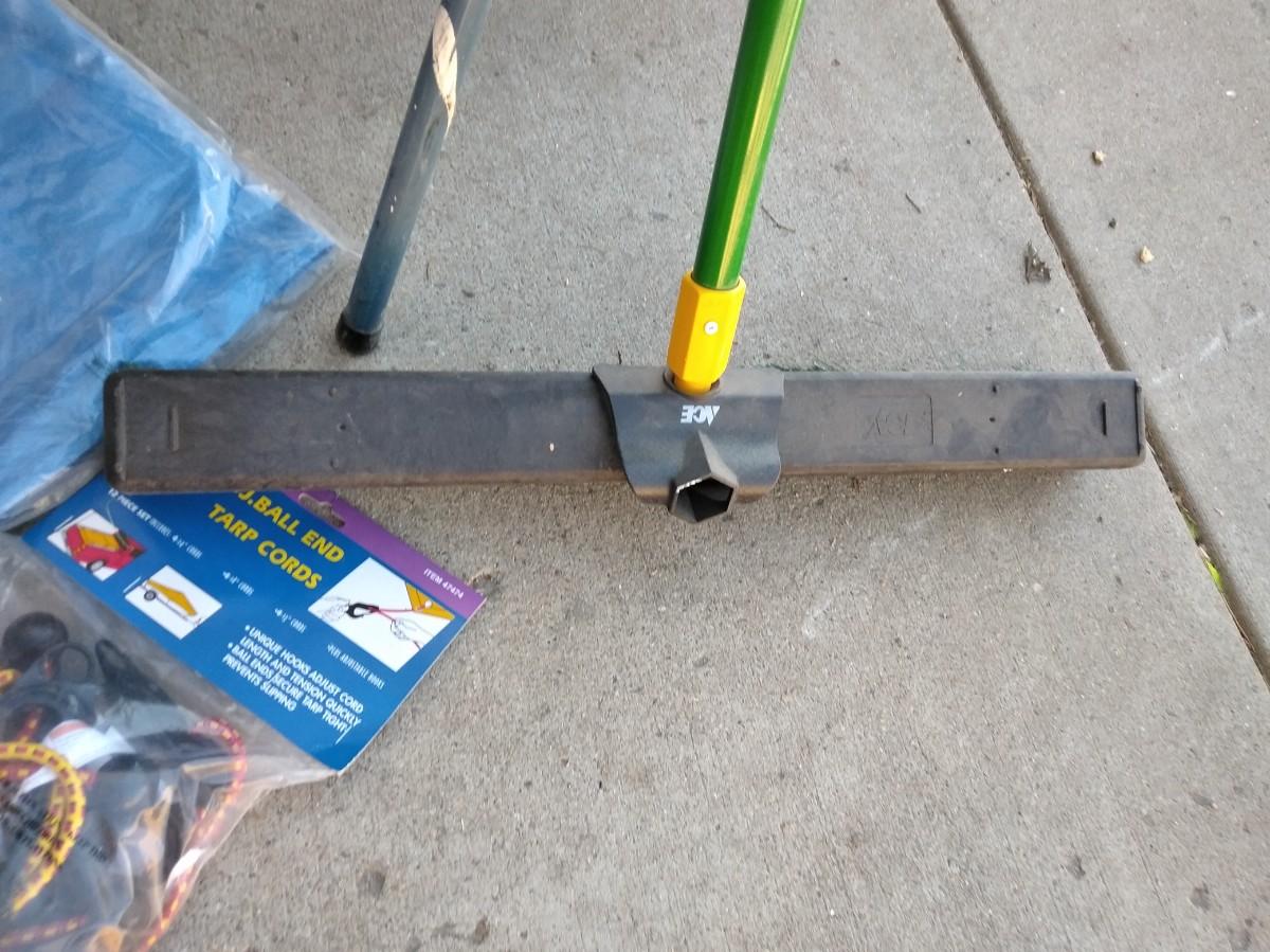 STEP STOOL, PUSH BROOM, NEW TARP AND BUNGEE CORDS