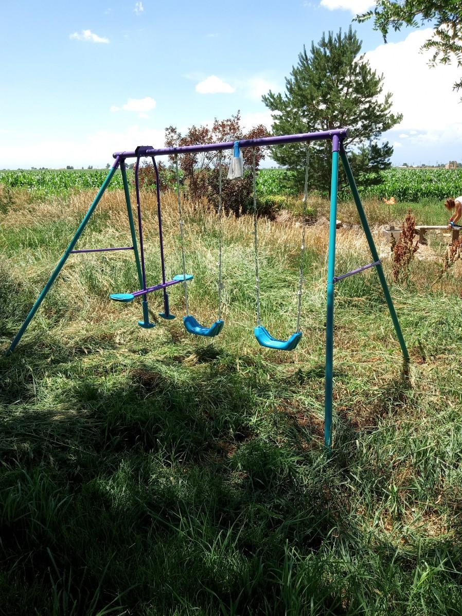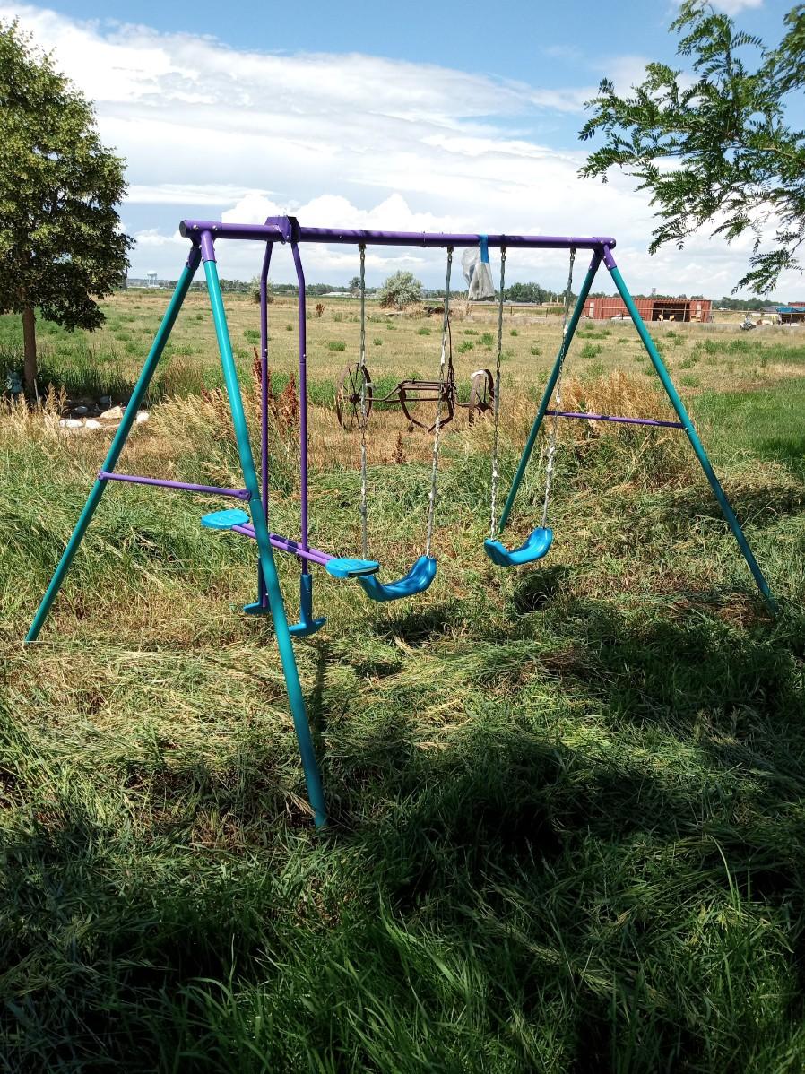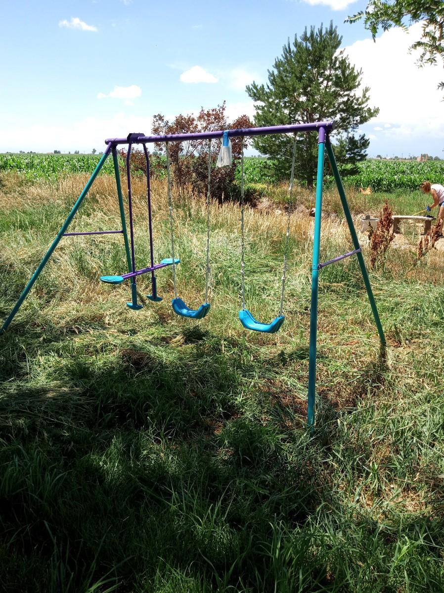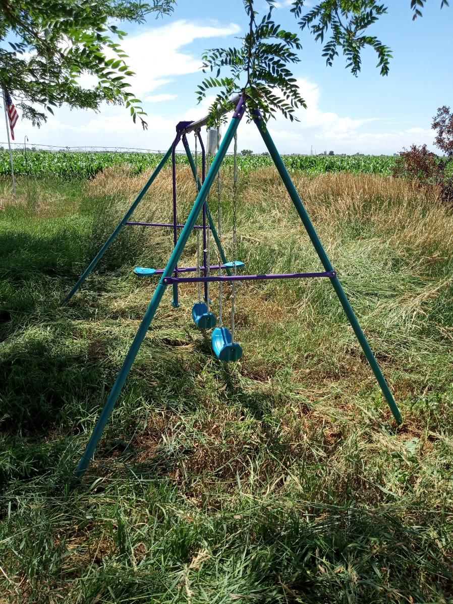 SWING SET IN VERY GOOD SHAPE, IT IS STAKED DOWN (NOT CEMENTED) SO IT SHOULDN'T BE HARD TO FREE IT