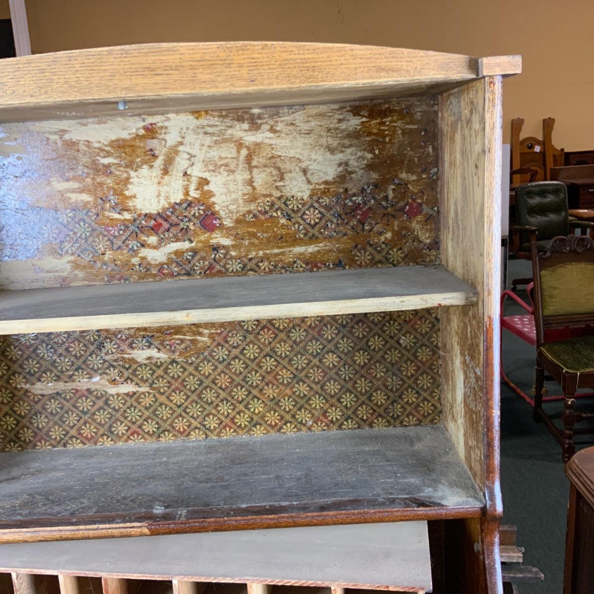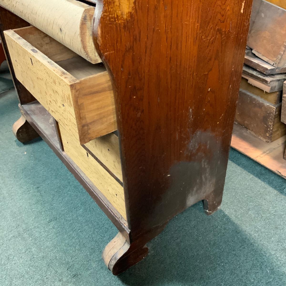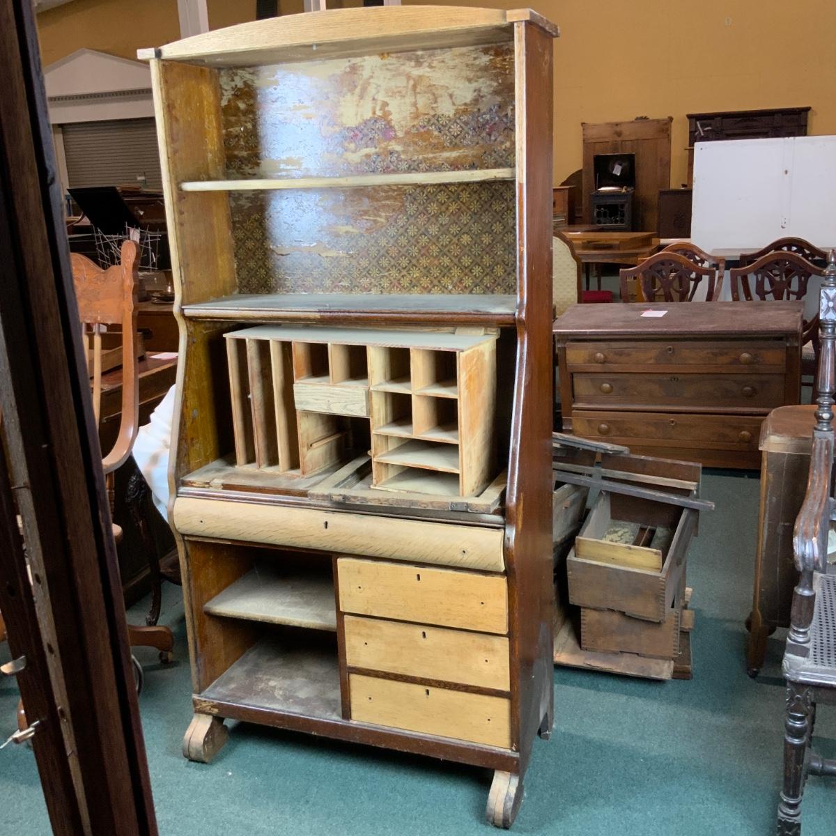 Oak Secretary. Simple style that could make a big impact with a bit of work. //::\\ Please see photos for details and condition. No attempt has been made to hide any imperfections. All items listed in this auction are warehouse items, and need to be cleaned. A majority of the items need restoration as well. All items are sold AS IS and WITHOUT GUARANTEE. If you are uncertain about an item, DO NOT BID. Due to the nature of this online auction in-person inspection is HIGHLY recommended. All Sales are FINAL. Pick Up Times are FIRM. Please confirm with your own schedule that you can pick up in the scheduled times listed in the Terms and Conditions. Any questions please message the auctioneer. DO NOT Contact The Harp Gallery.