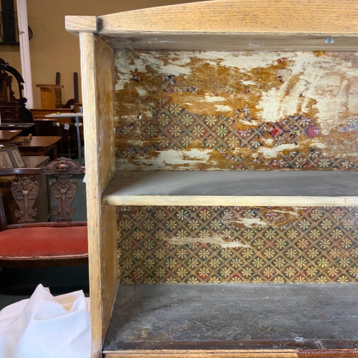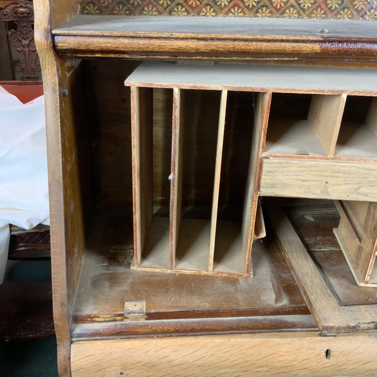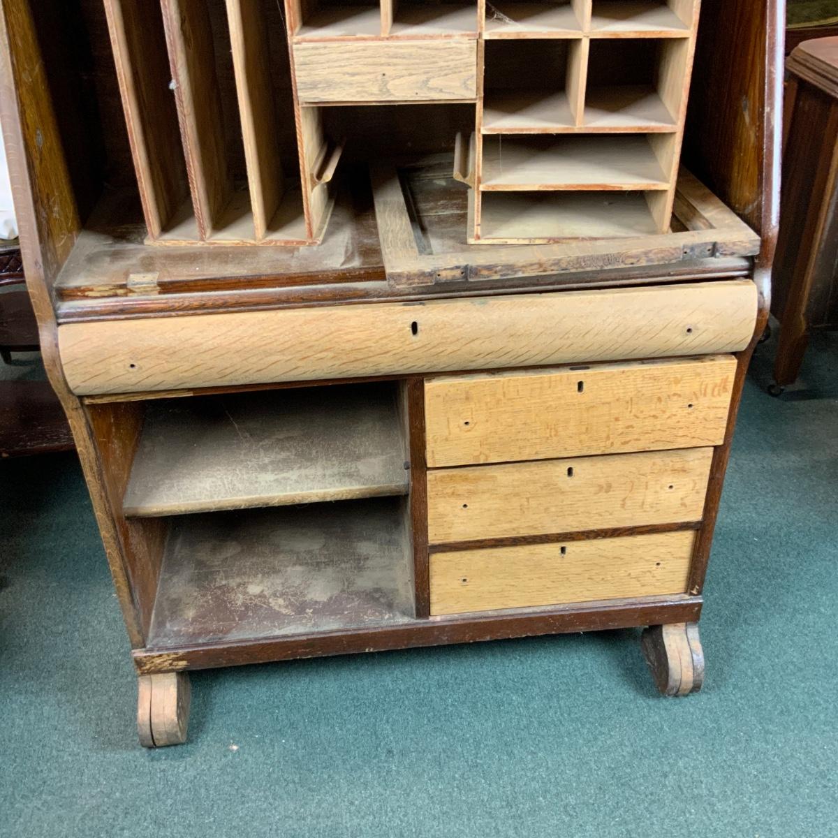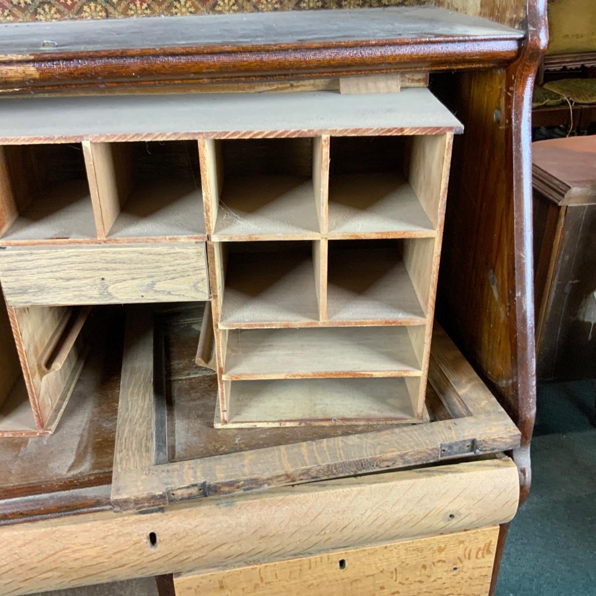 Oak Secretary. Simple style that could make a big impact with a bit of work. //::\\ Please see photos for details and condition. No attempt has been made to hide any imperfections. All items listed in this auction are warehouse items, and need to be cleaned. A majority of the items need restoration as well. All items are sold AS IS and WITHOUT GUARANTEE. If you are uncertain about an item, DO NOT BID. Due to the nature of this online auction in-person inspection is HIGHLY recommended. All Sales are FINAL. Pick Up Times are FIRM. Please confirm with your own schedule that you can pick up in the scheduled times listed in the Terms and Conditions. Any questions please message the auctioneer. DO NOT Contact The Harp Gallery.