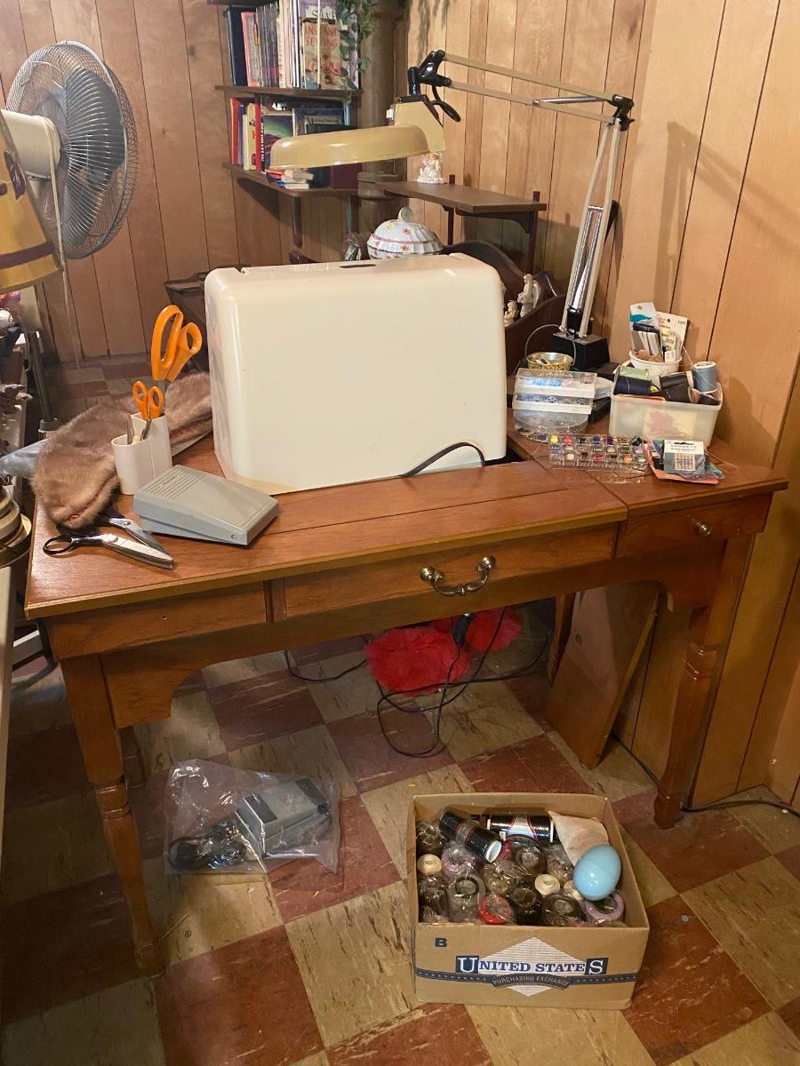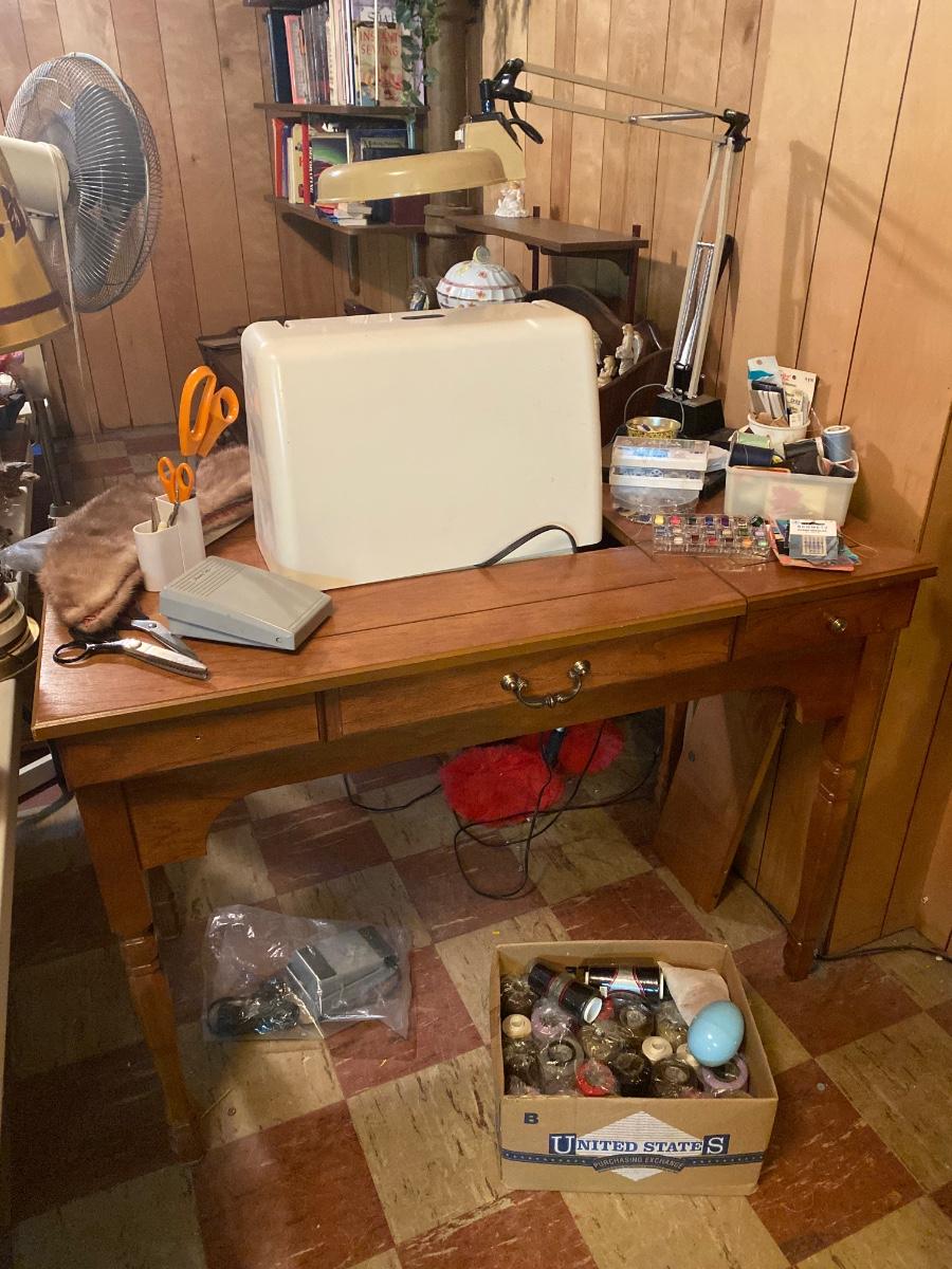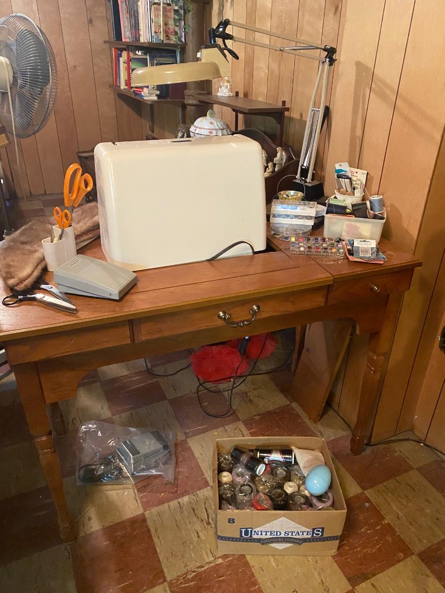 Large lot including New Home sewing machine, table, magnifying light and more. Please see all pictures as they are the best representation of the items. The pictures show condition, measurements if taken, and what is included in the lot. Due to the large amount that we photograph and the time frame, we are not always able to take measurements. All items unless noted, are pre-owned and have been used. If you purchased furniture, you must bring help. We do not allow one person to carry large furniture out on their own. Bring help, tools and a truck for the safety of our client’s homes, and your personal safety. Any damages that result to the property including walls, and floors due to moving of the furniture will be charged to the buyer. Company policy. Thank you