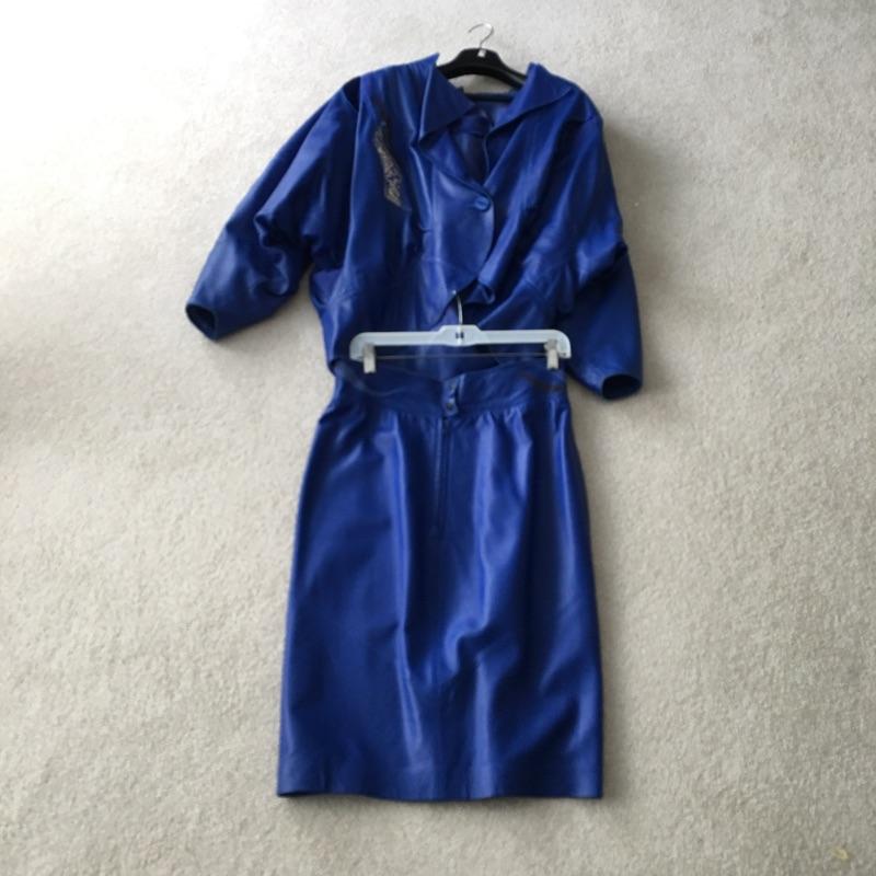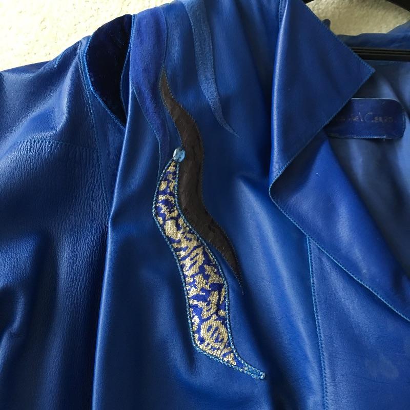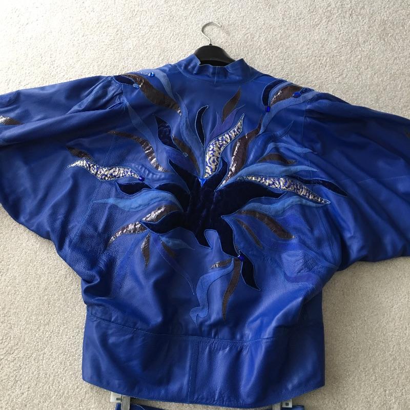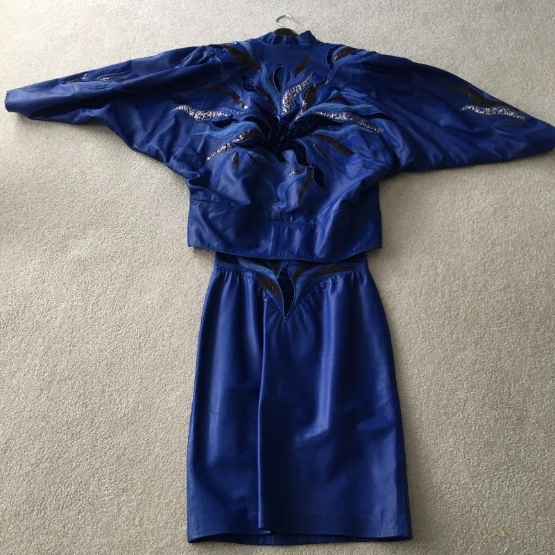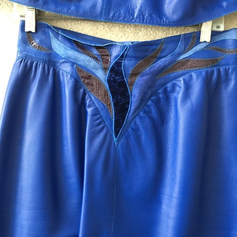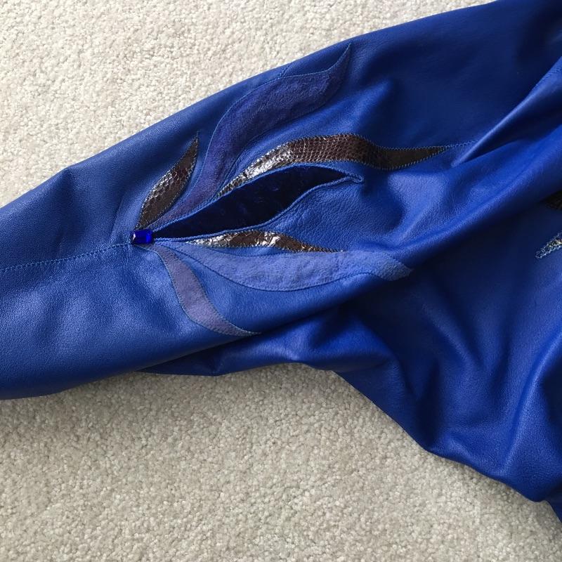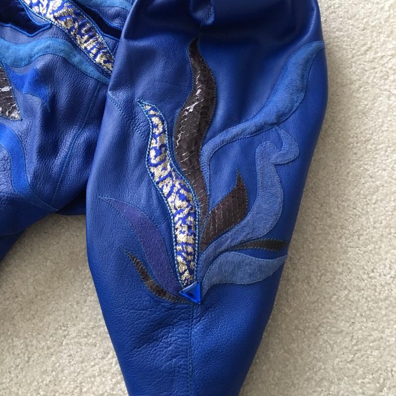 Wow take a look at this blast from the past and still gorgeous Sofia del Cerro leather outfit in an electric blue with unique designs. Pictures do not do this outfit justice, don’t miss out.