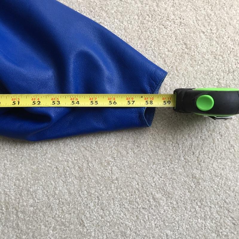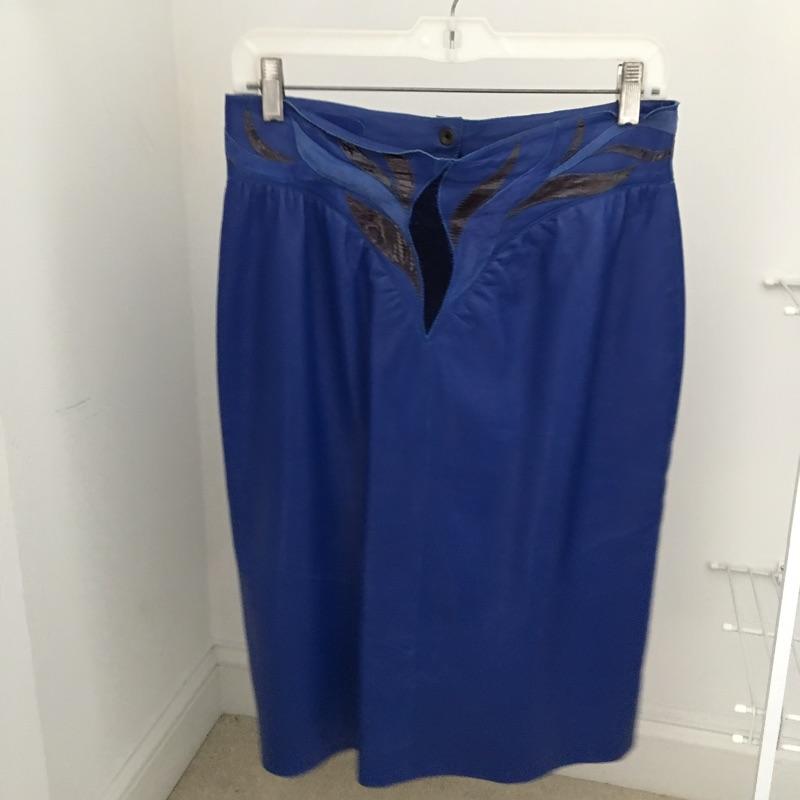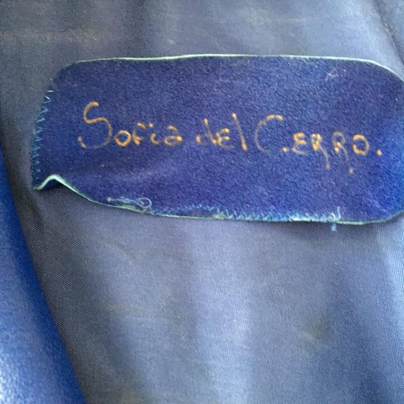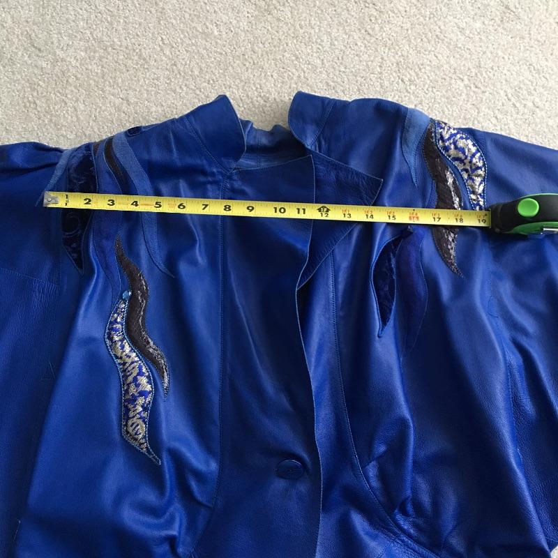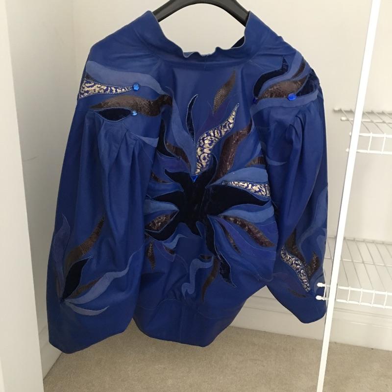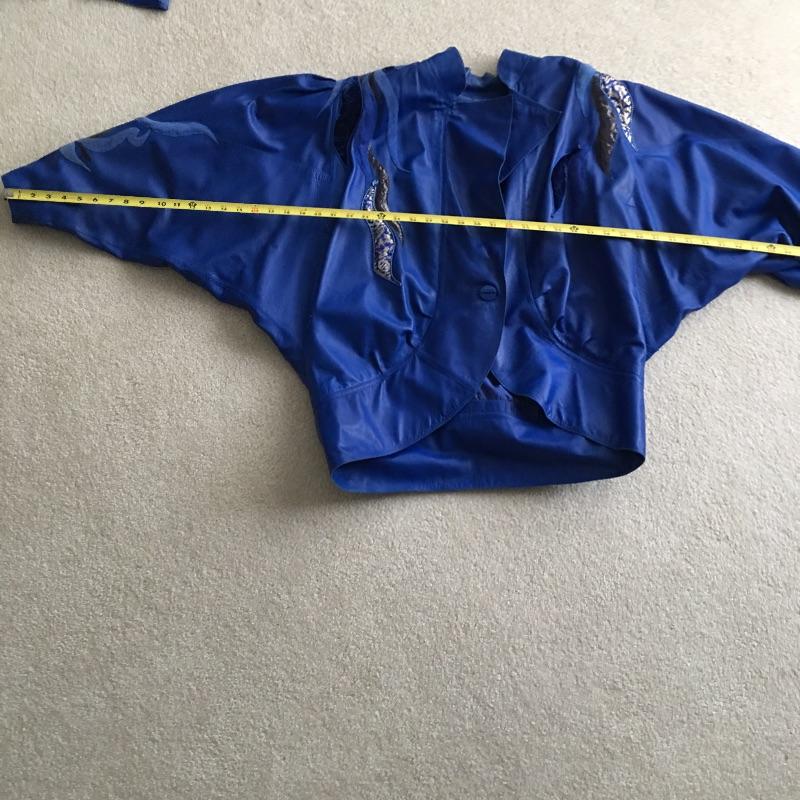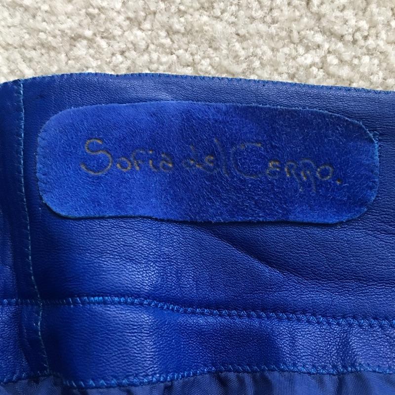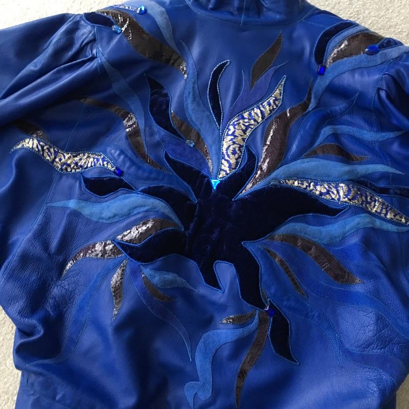 Wow take a look at this blast from the past and still gorgeous Sofia del Cerro leather outfit in an electric blue with unique designs. Pictures do not do this outfit justice, don’t miss out.