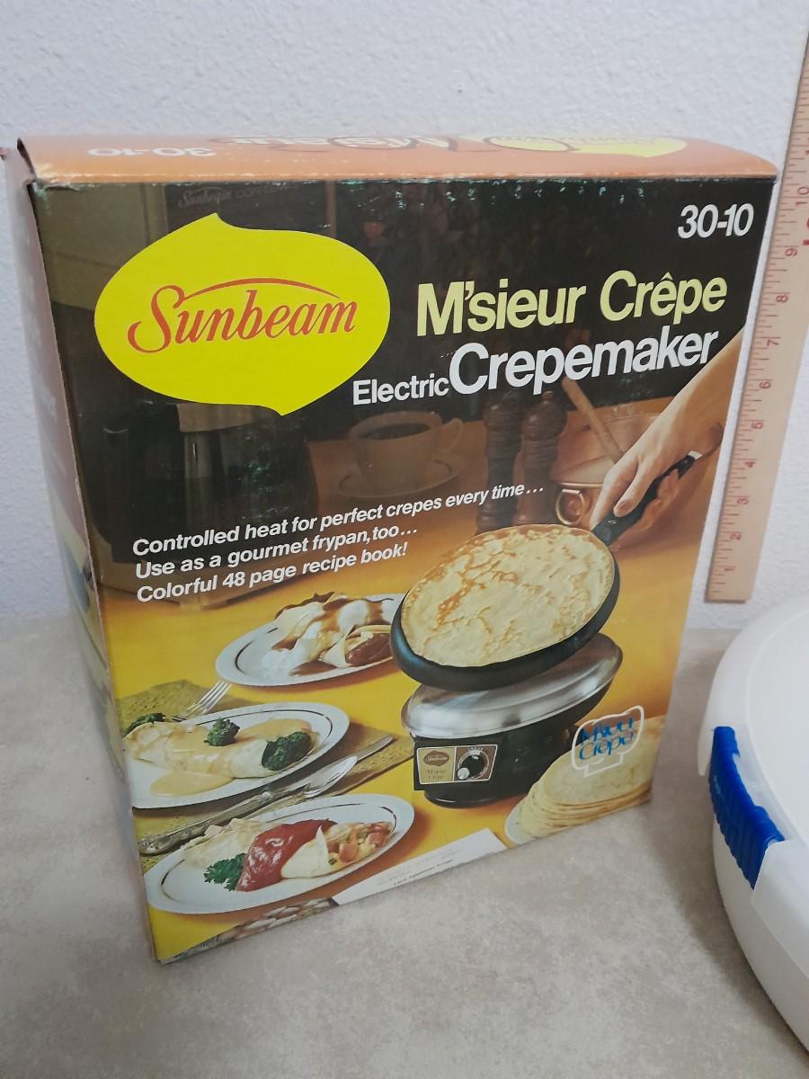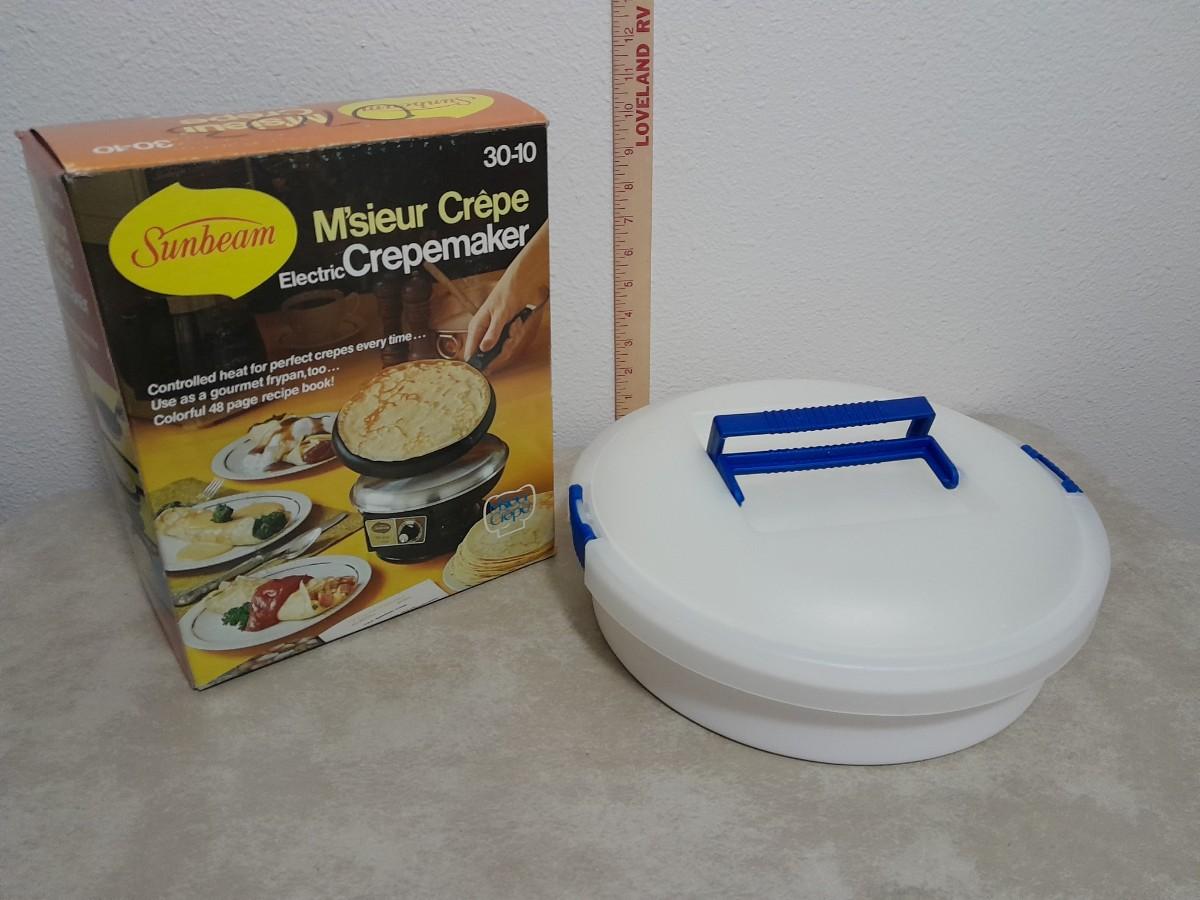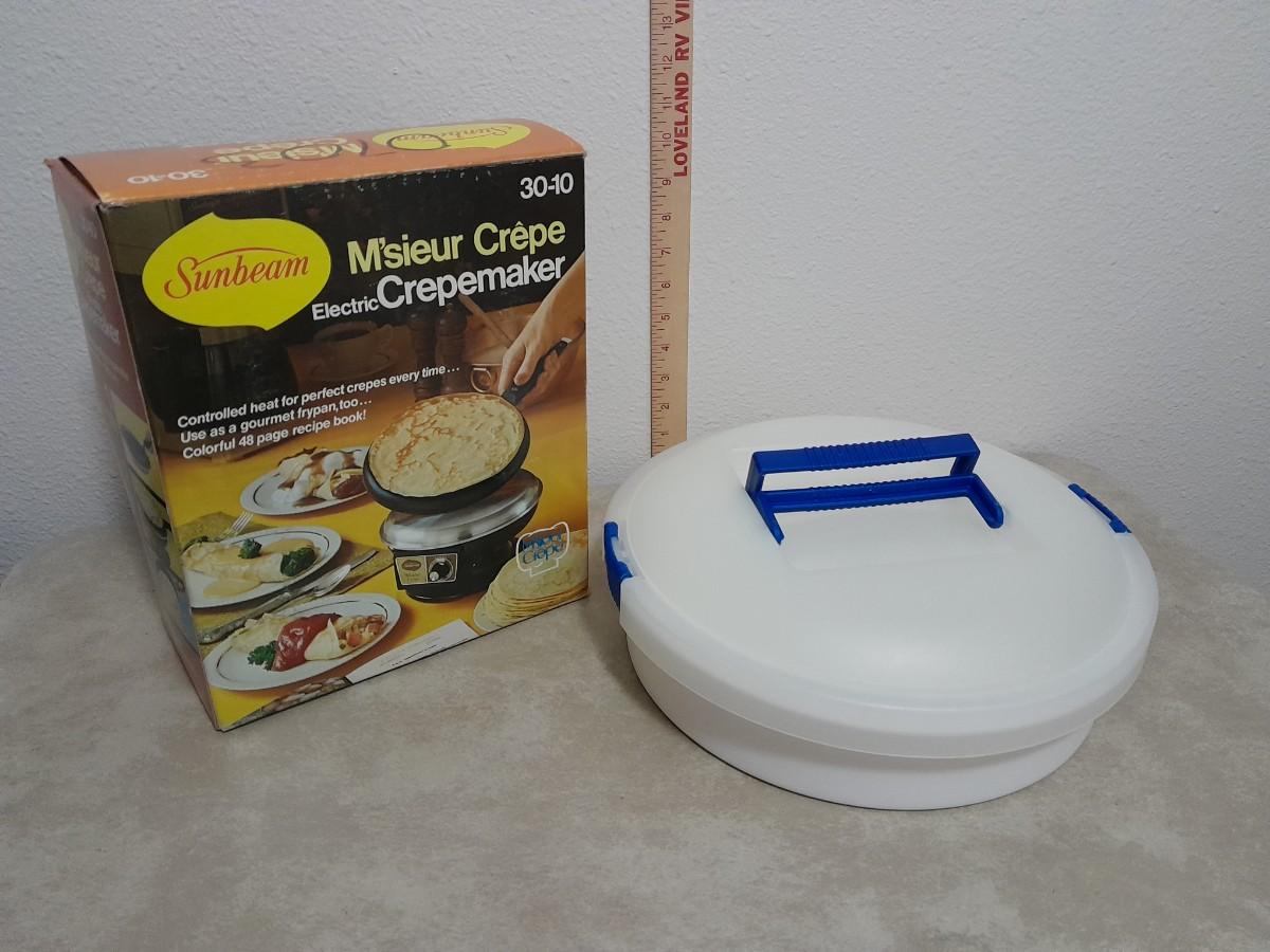 SUNBEAM M'SIEUR CREPE ELECTRIC CREPE MAKER AND PLASTIC EGG STORAGE CONTAINER