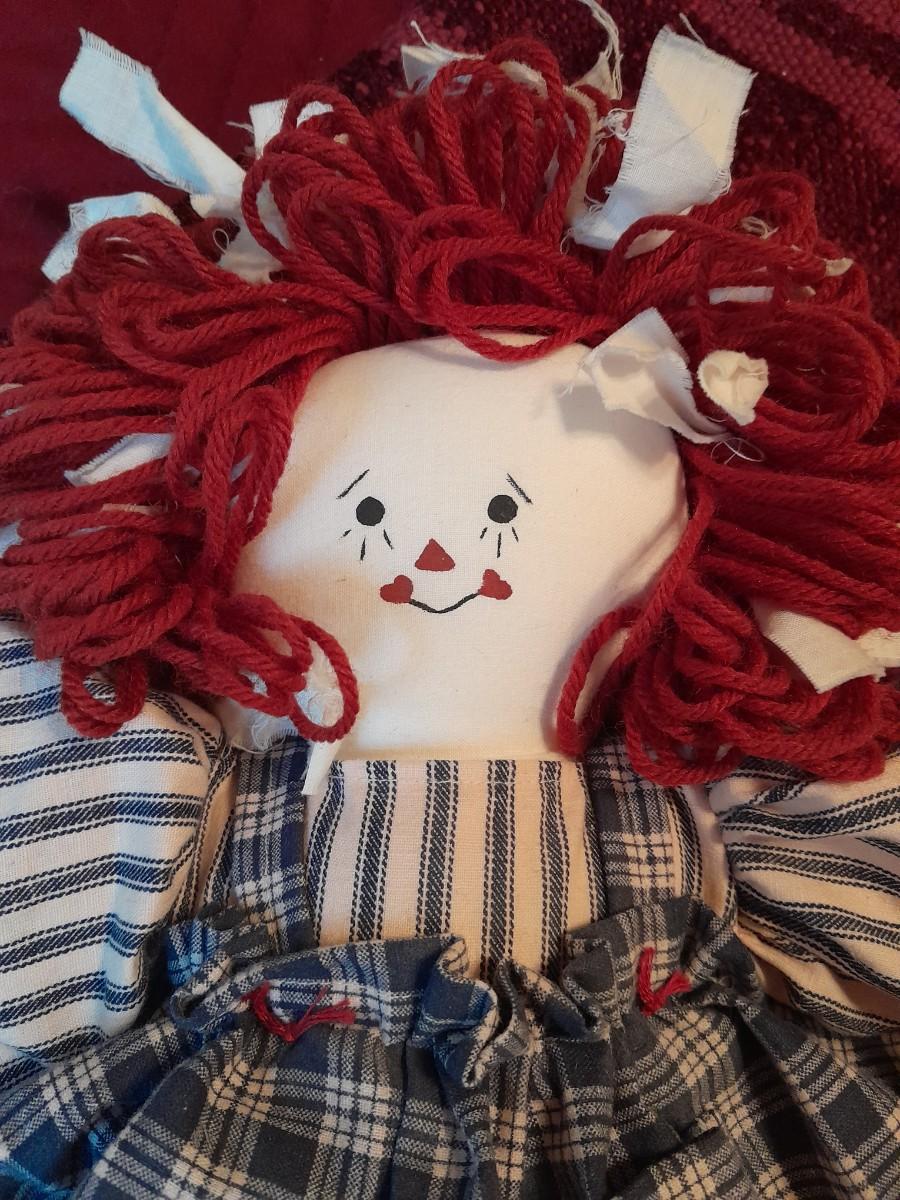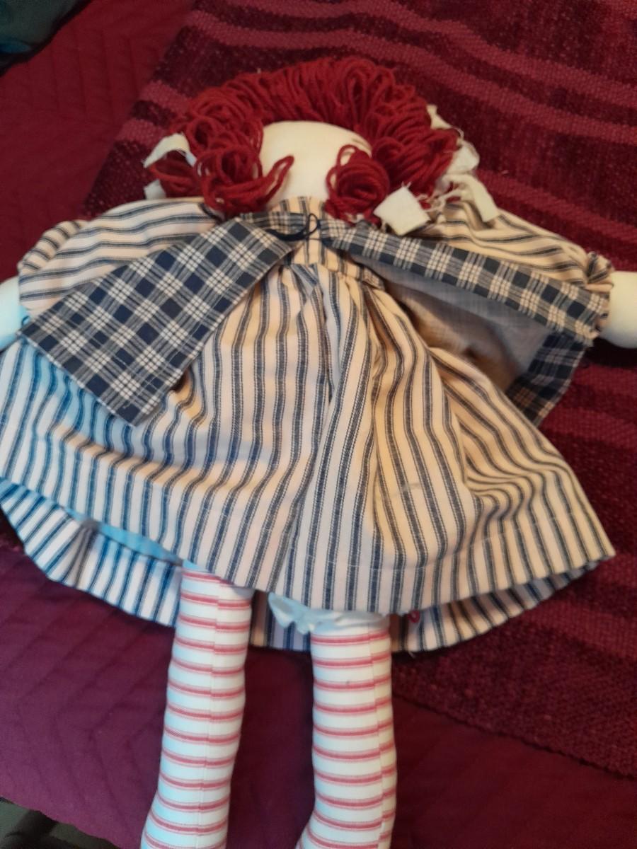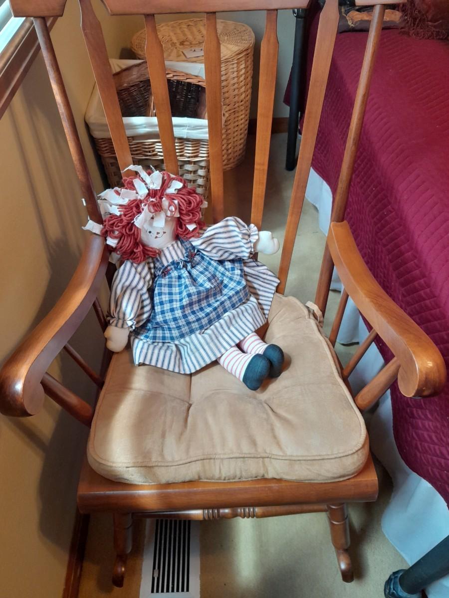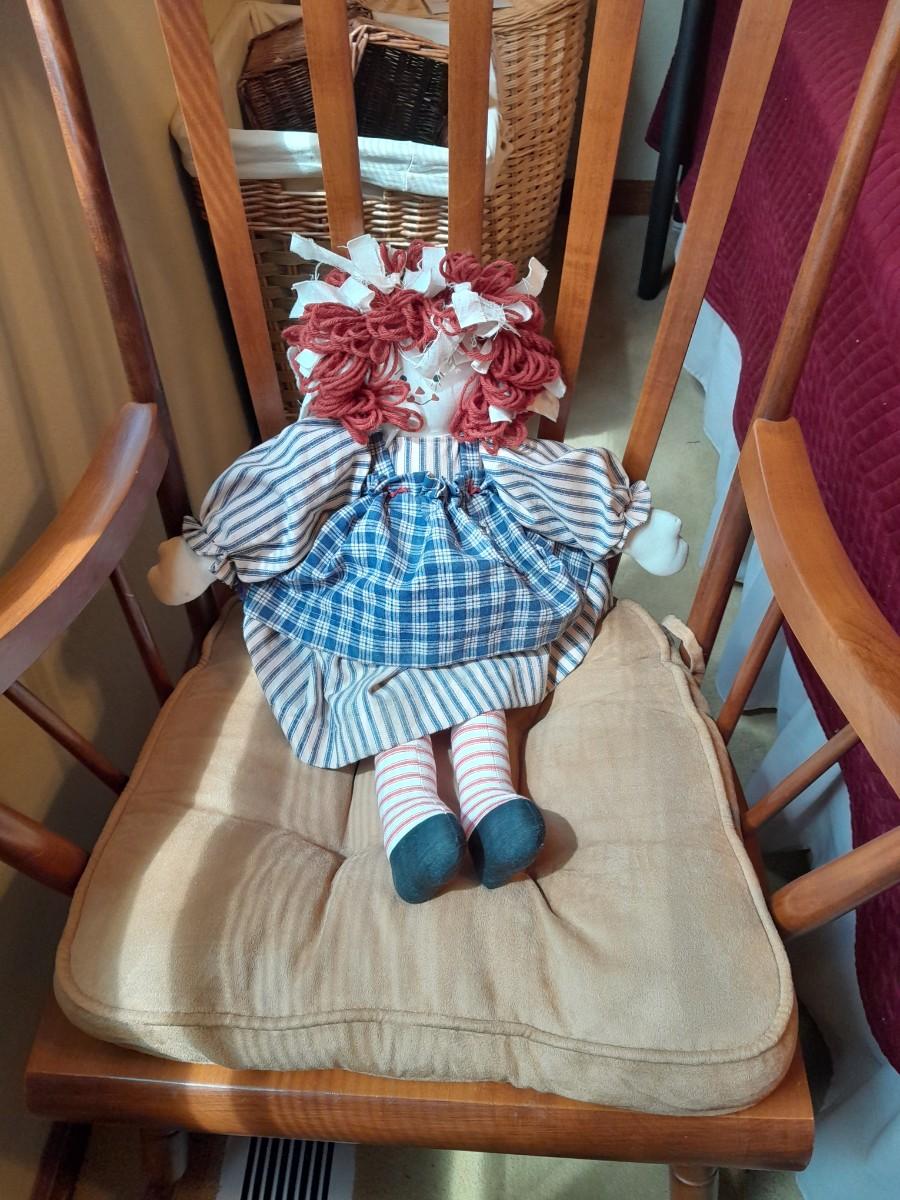 WOODEN ROCKING CHAIR WITH SEAT CUSHION AND RAGGEDY ANN DOLL