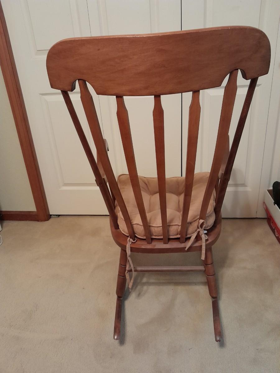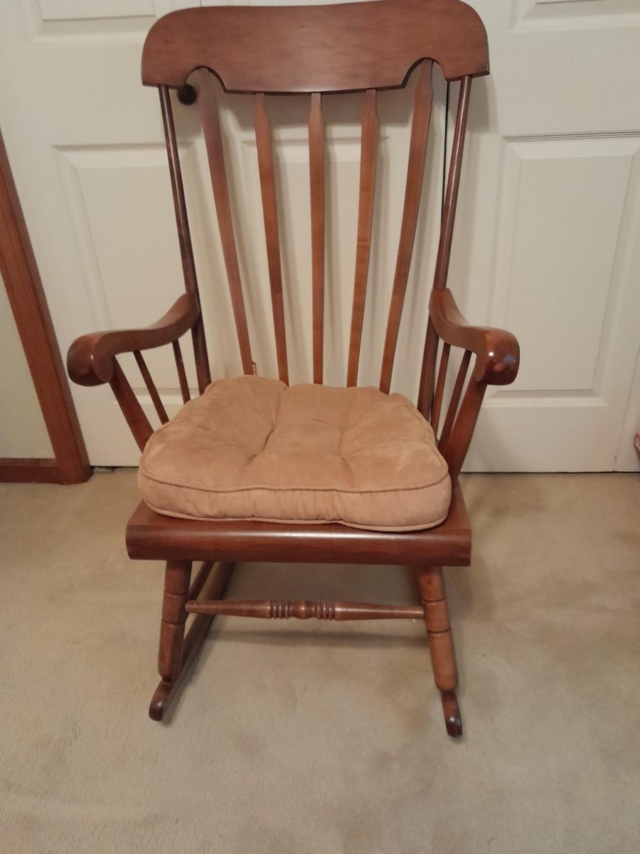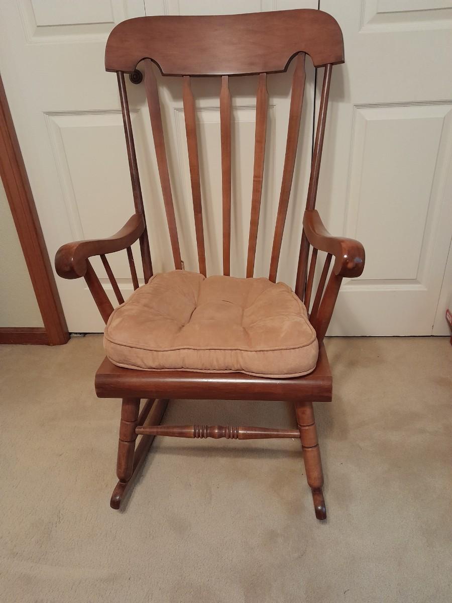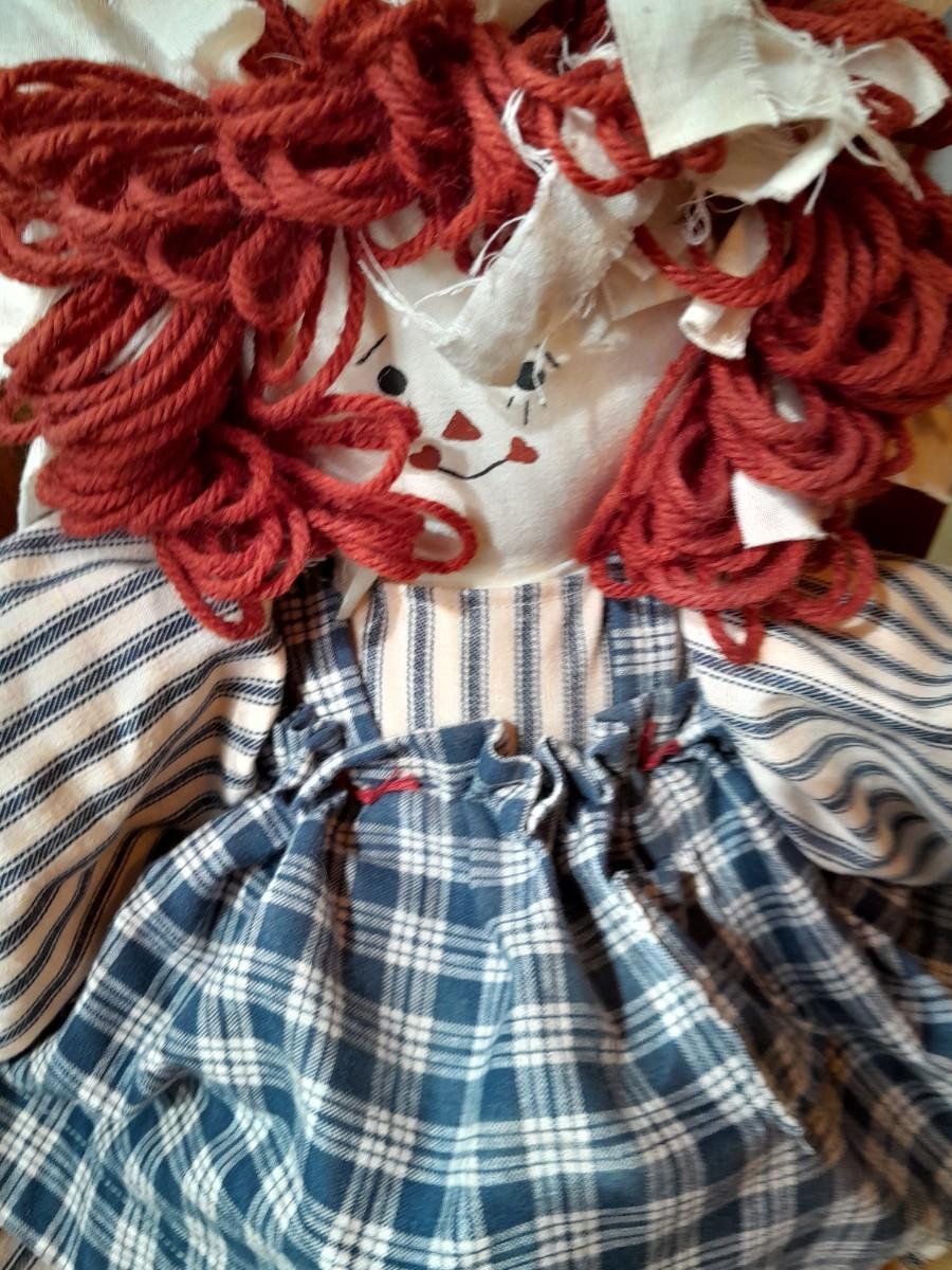 WOODEN ROCKING CHAIR WITH SEAT CUSHION AND RAGGEDY ANN DOLL