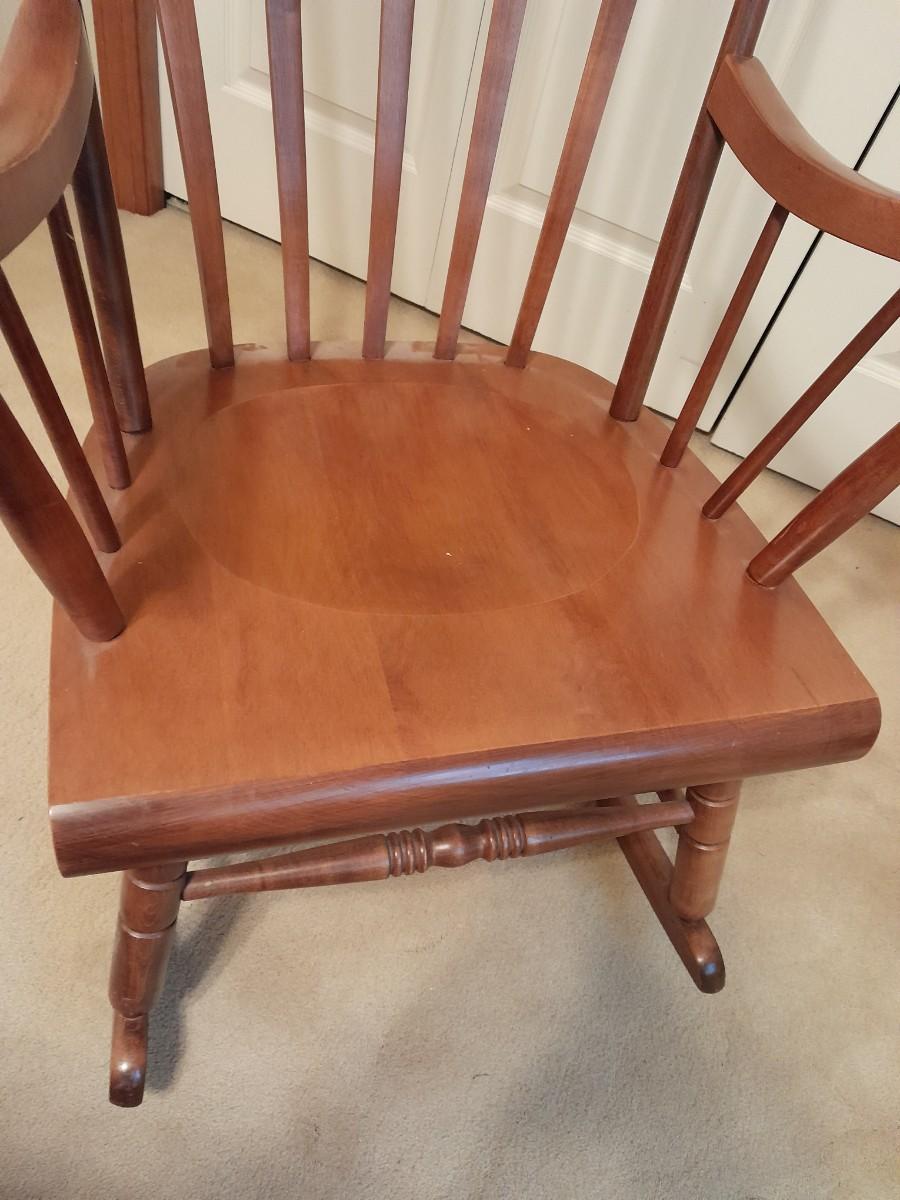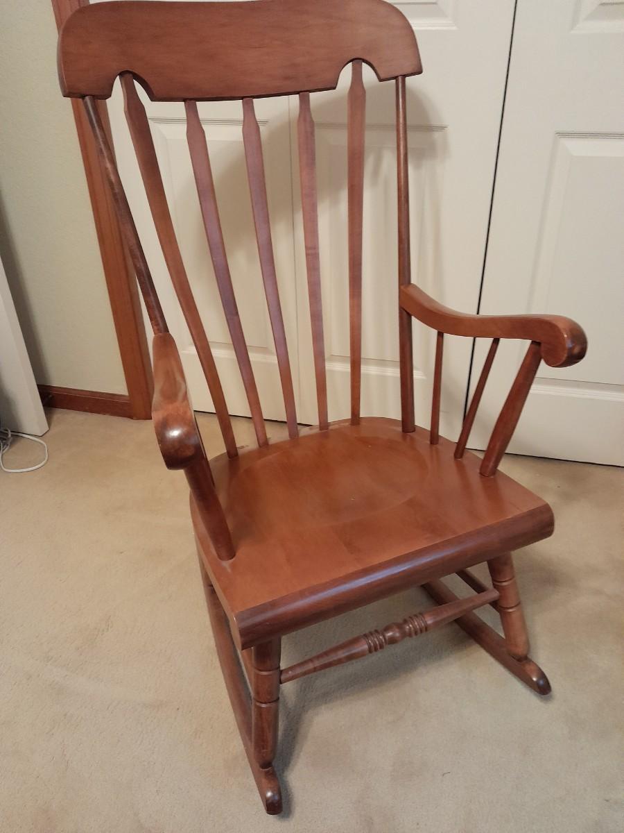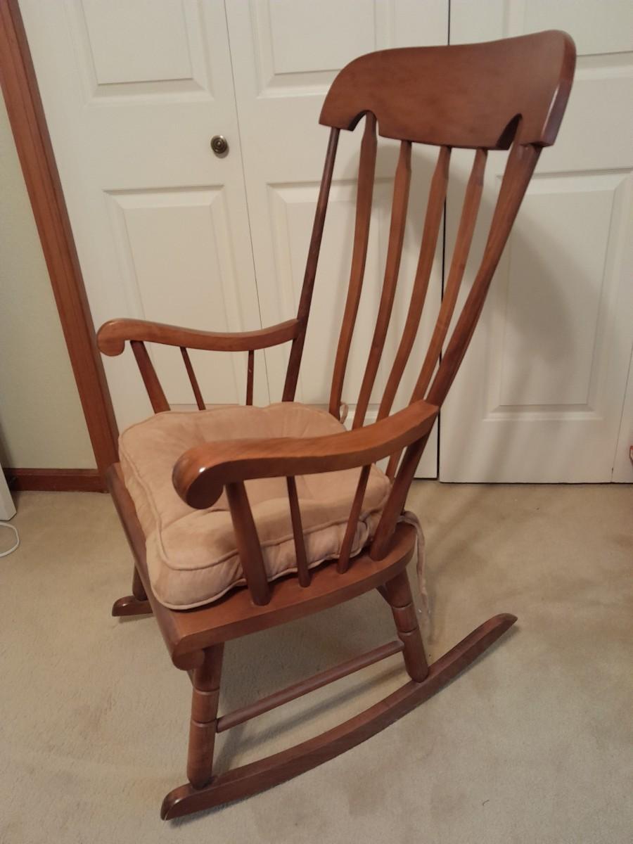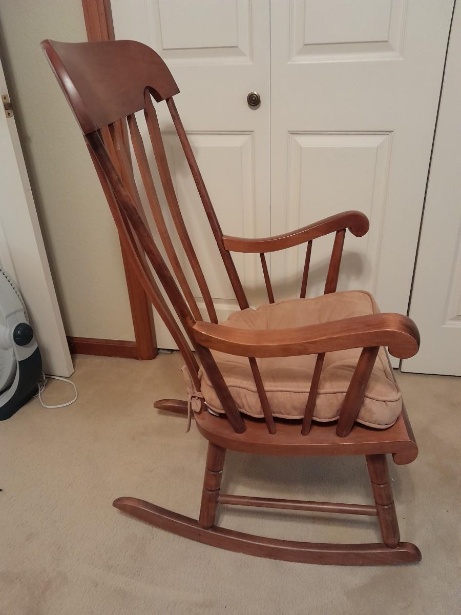 WOODEN ROCKING CHAIR WITH SEAT CUSHION AND RAGGEDY ANN DOLL