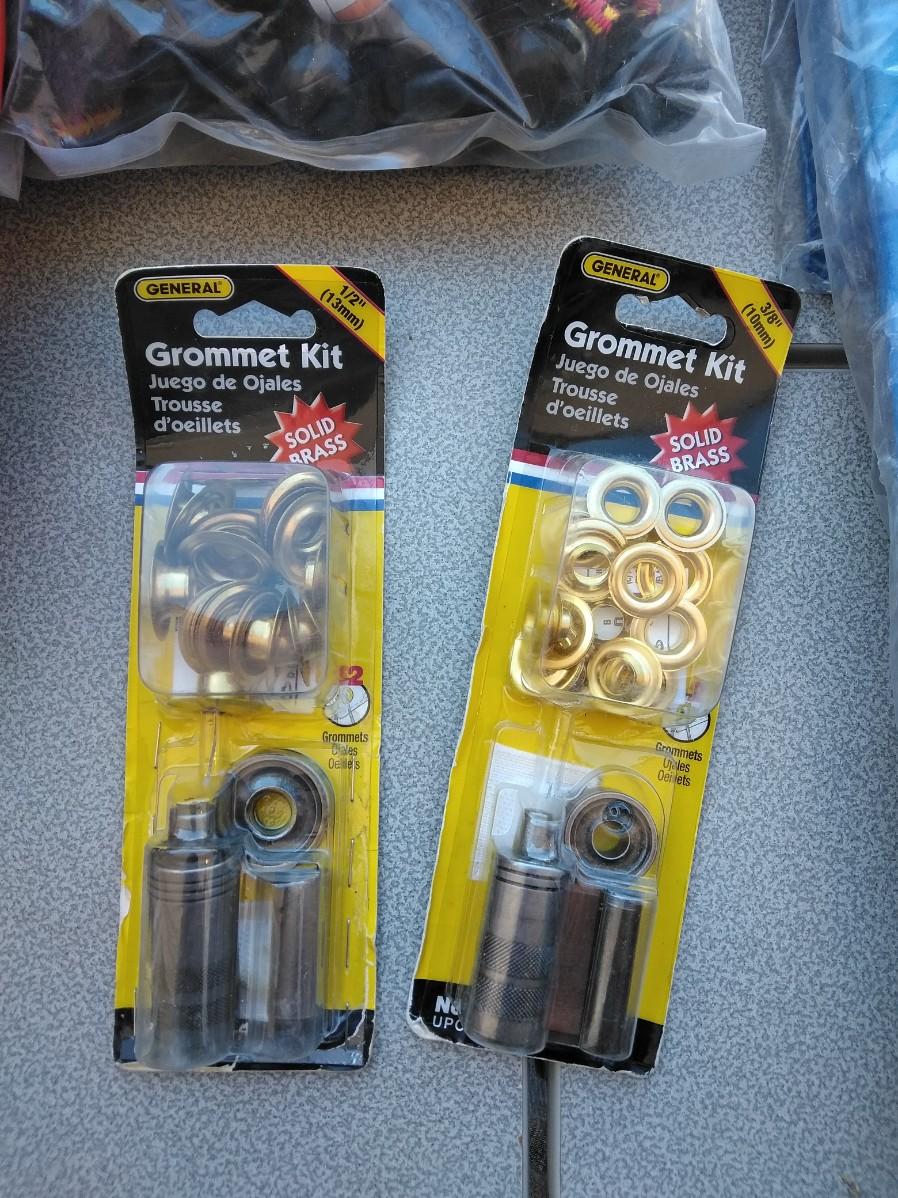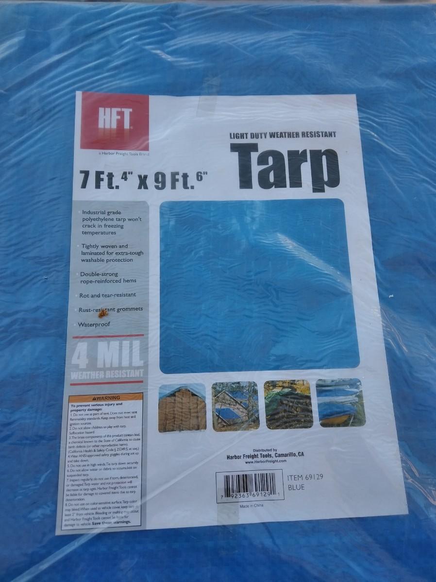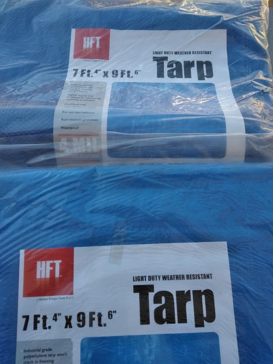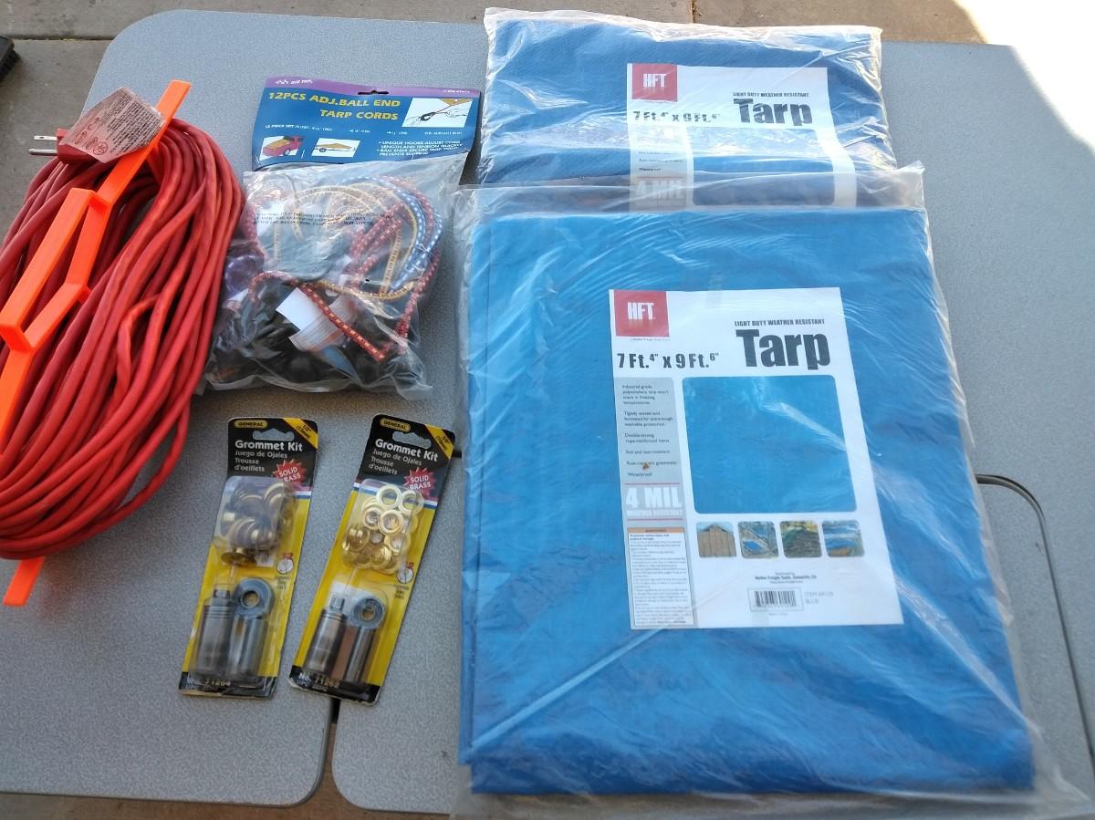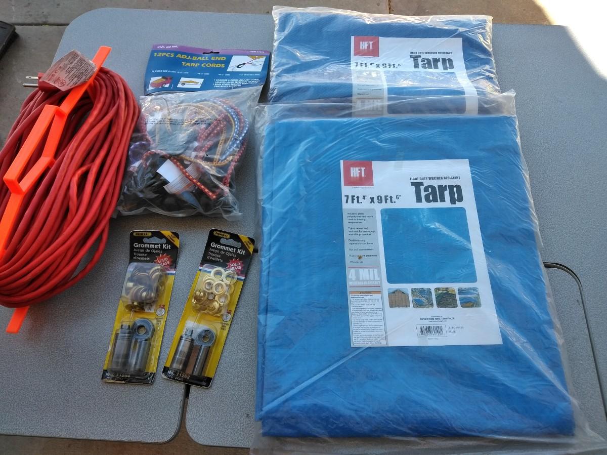 2 - 7' X 9' TARPS, 2 NEW GROMMET KITS, LONG EXTENSION CORD AND NEW BUNGEE CORDS