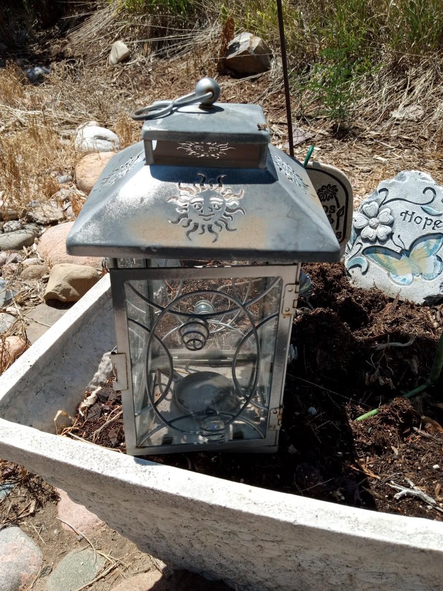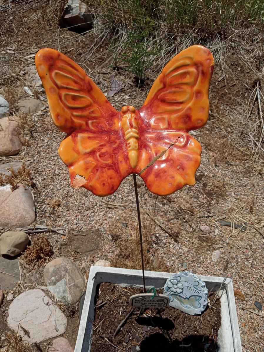 CERAMIC BUTTERFLY ON A ROD (IT HAS BEEN REPAIRED), GLASS PANED LANTERN, METAL ROTATING FLOWER