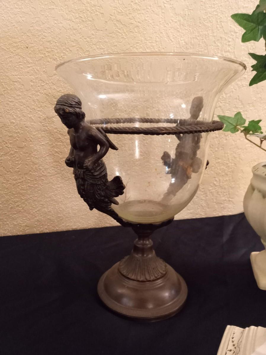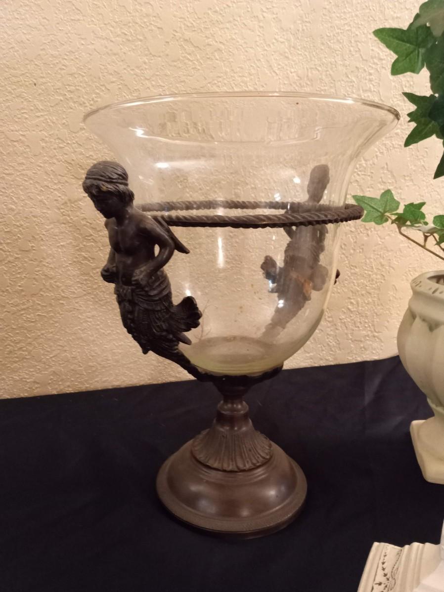 GLASS BOWL IN A CAST IRON FRAME WITH CHERUBS ON EACH SIDE