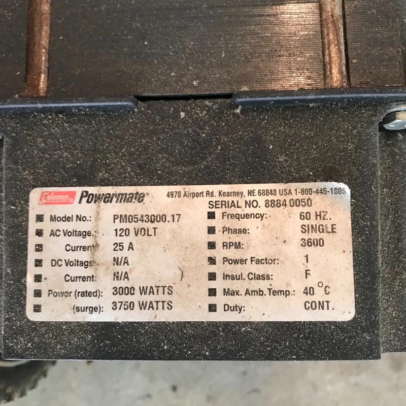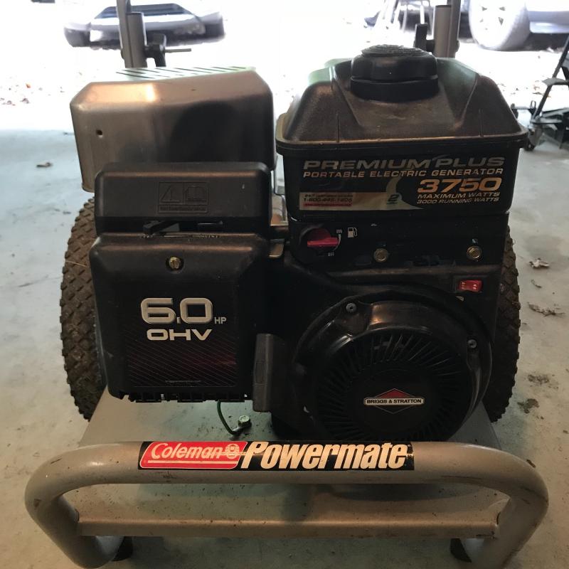 Coleman Powermate 3000 rated watts, 3750 surge watts. Appears to be in fine shape. Fuel tank is empty, therefore working condition unknown. See photos. Local pick up only.