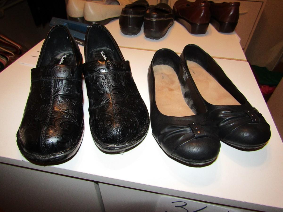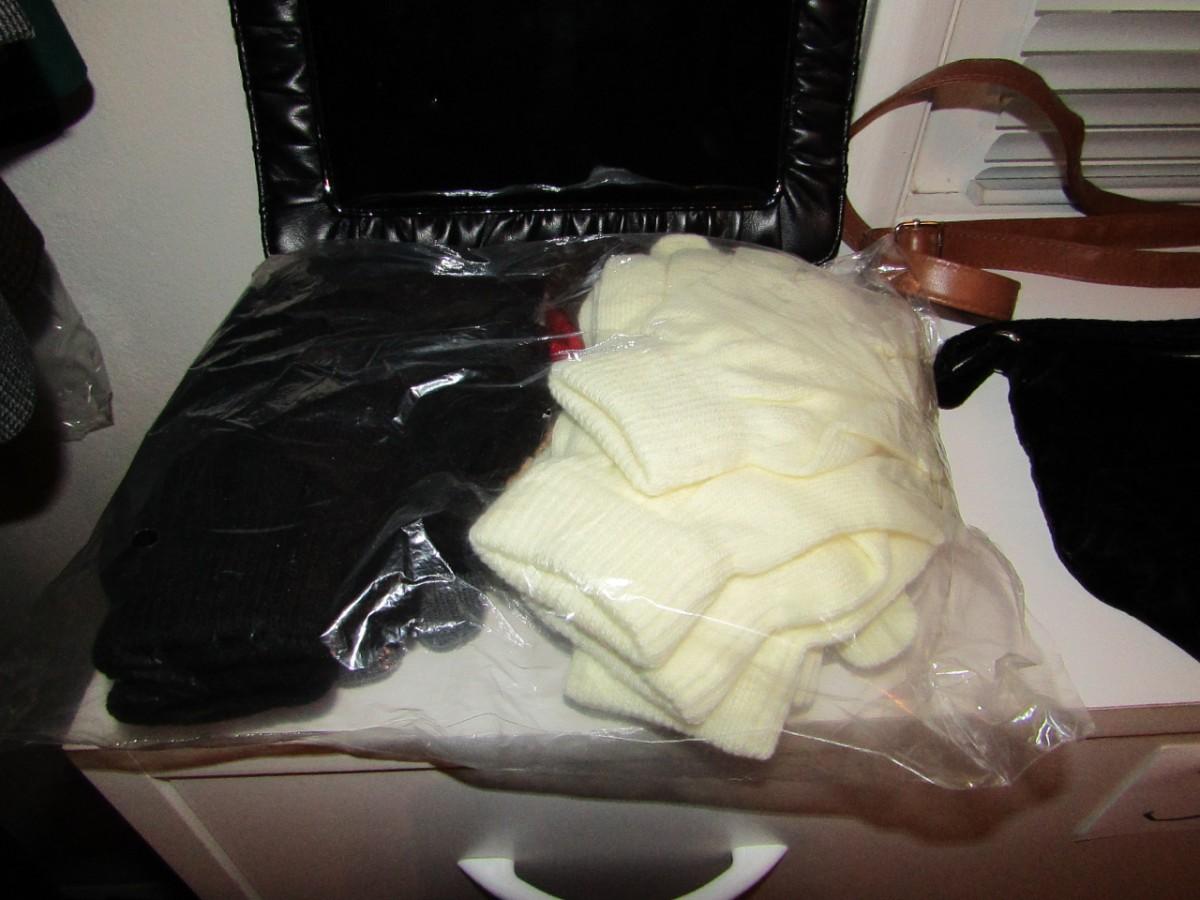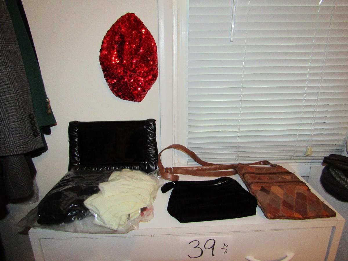 LADIES SHOES SIZE 11, 12 NEW KNIT GLOVES, 3 PURSES AND A RED SEQUIN HAT