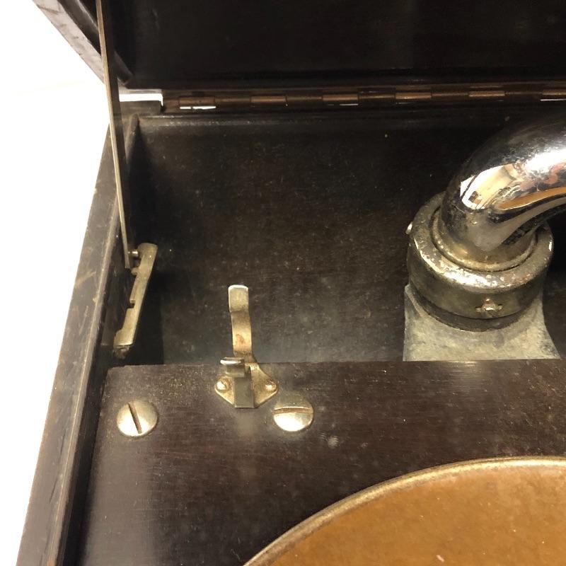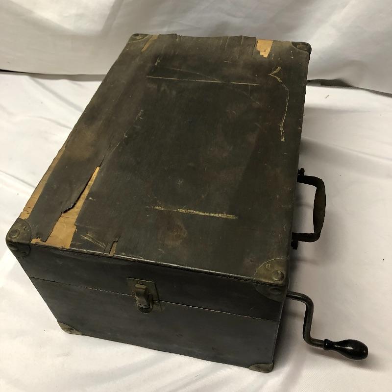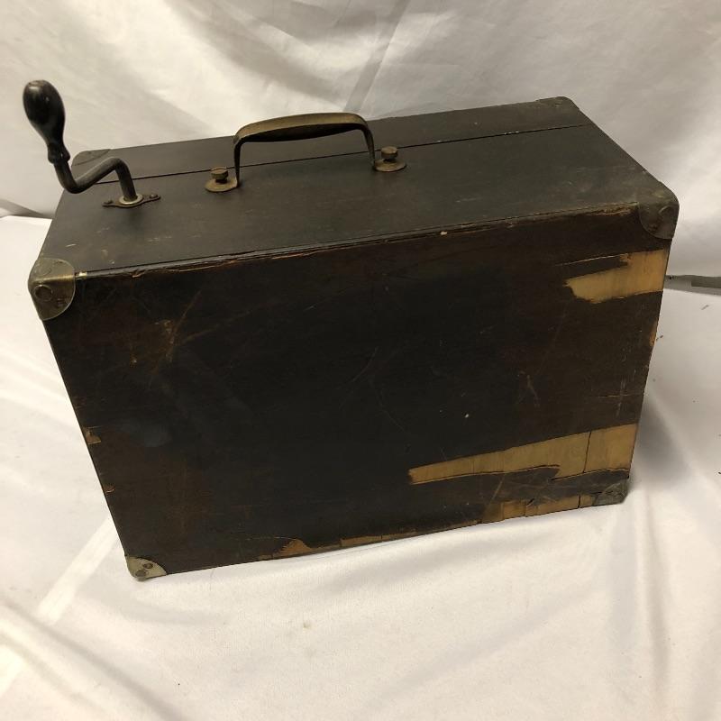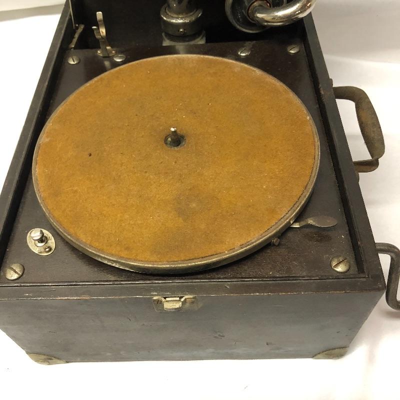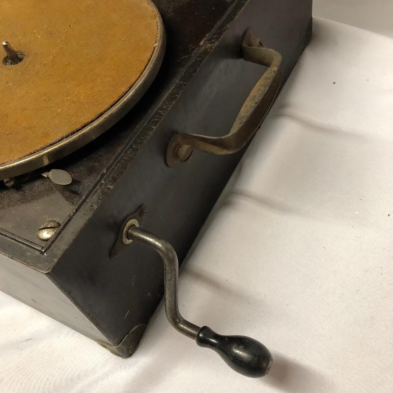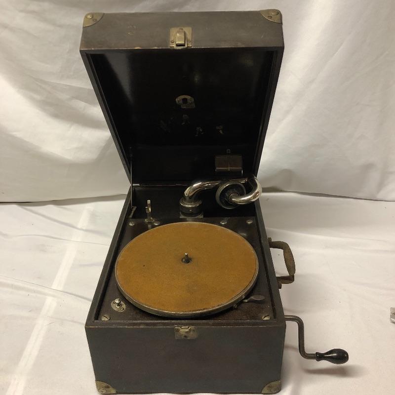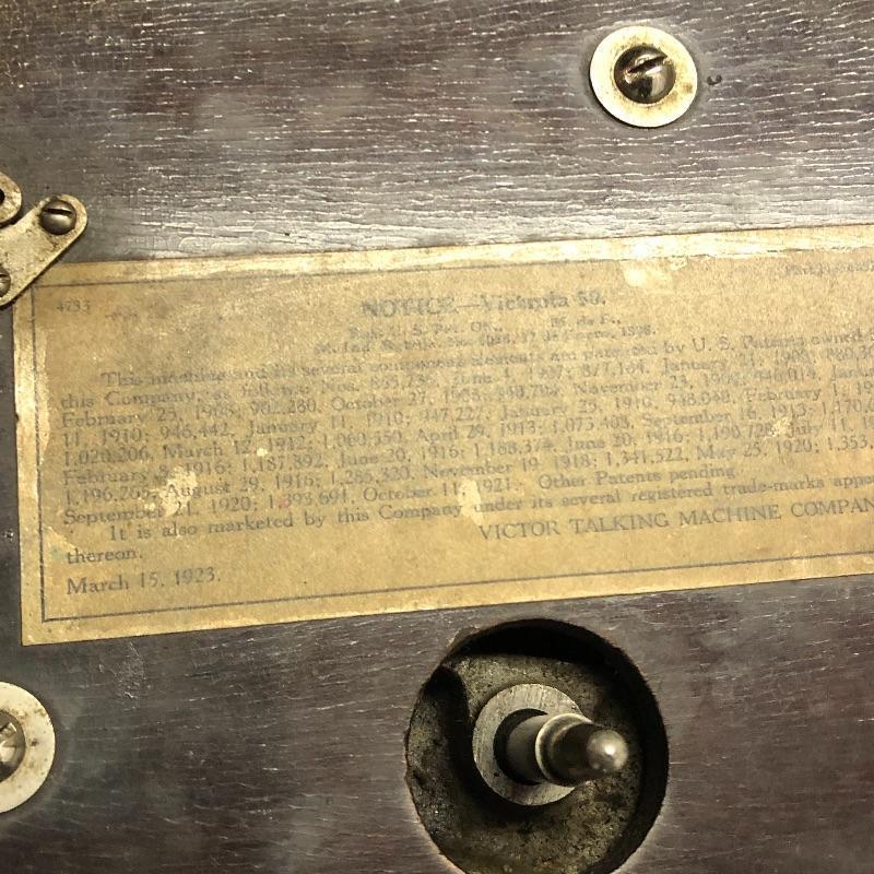 This phonograph is a Victrola 50/Victor Talking Machine, March 15, 1923. The case is wood and the turntable spins when cranked. This VV-50 Portable Record Player was considered one of the first "Suitcase" models by this company. The lot also includes a label for a VV-50 machine. We are unsure if it goes with this exact machine or not.