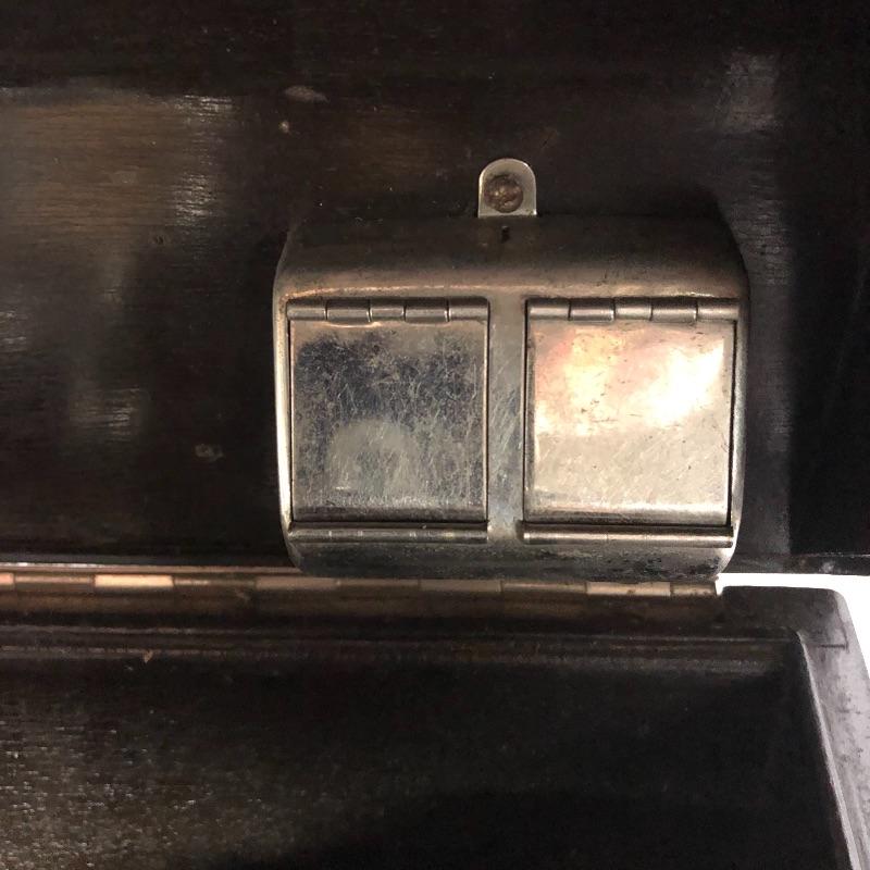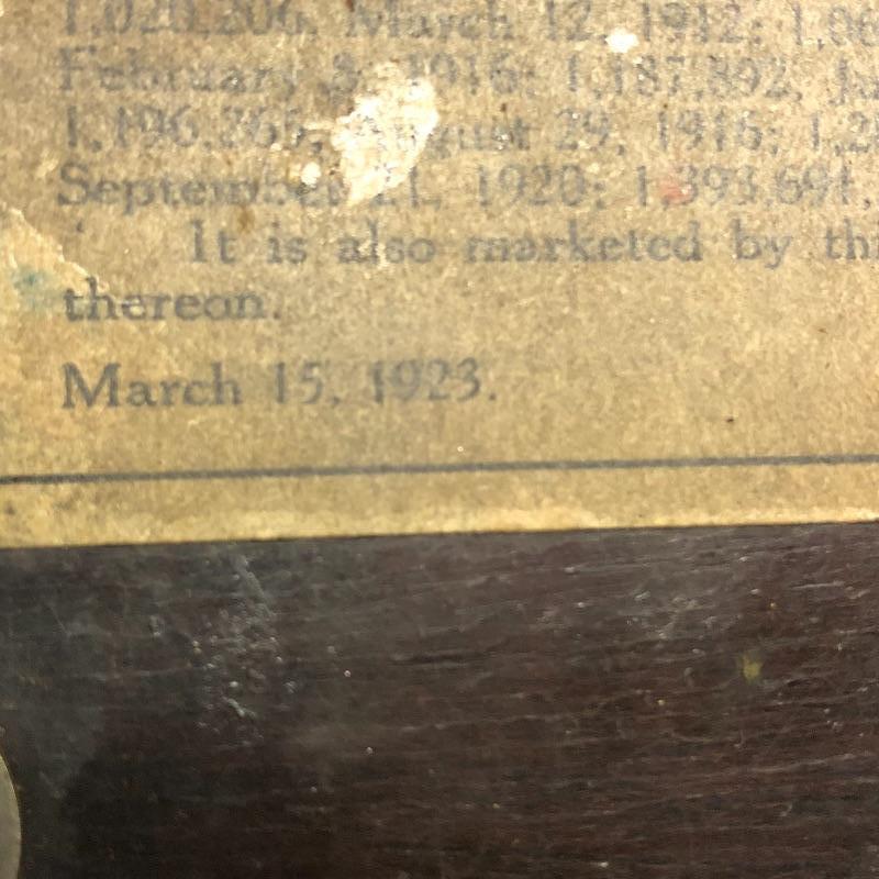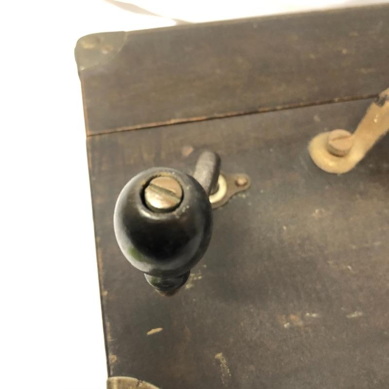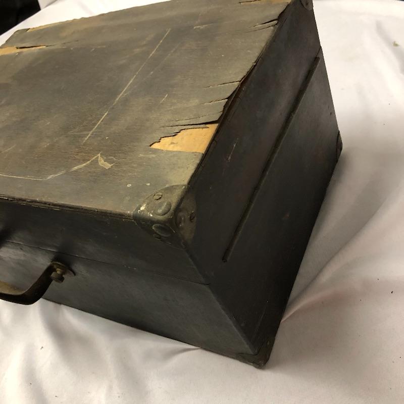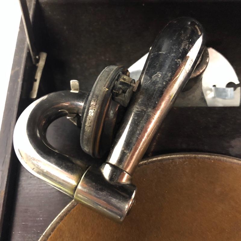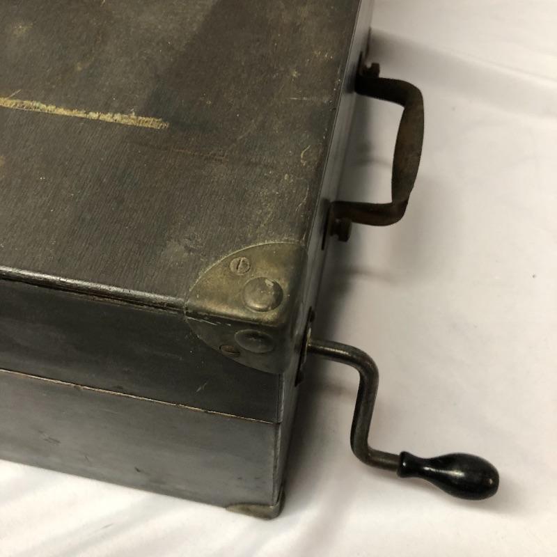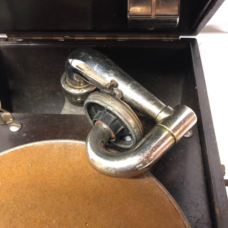 This phonograph is a Victrola 50/Victor Talking Machine, March 15, 1923. The case is wood and the turntable spins when cranked. This VV-50 Portable Record Player was considered one of the first "Suitcase" models by this company. The lot also includes a label for a VV-50 machine. We are unsure if it goes with this exact machine or not.