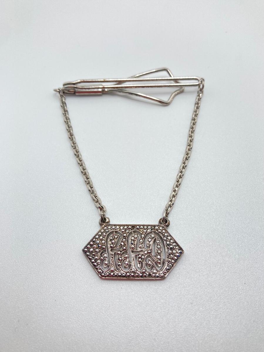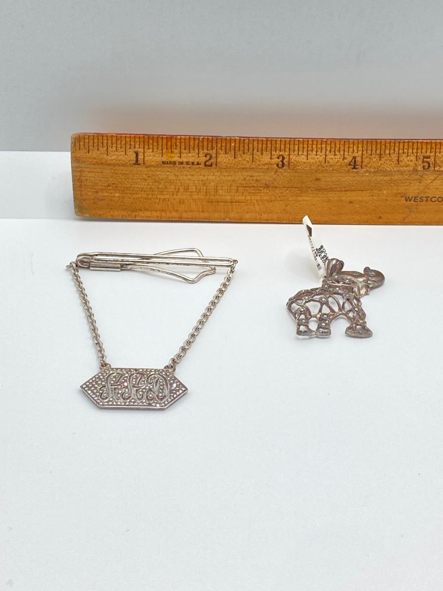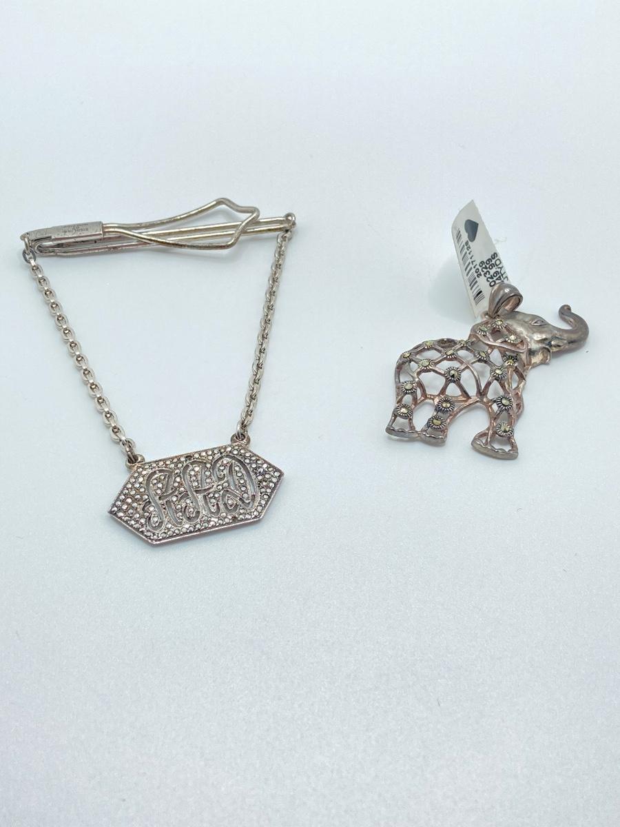 LOT 312: Sterling Silver and Marcasite Jewelry - Elephant Pendant Tw 6.71g and Manleigh Monogrammed Tie Clip