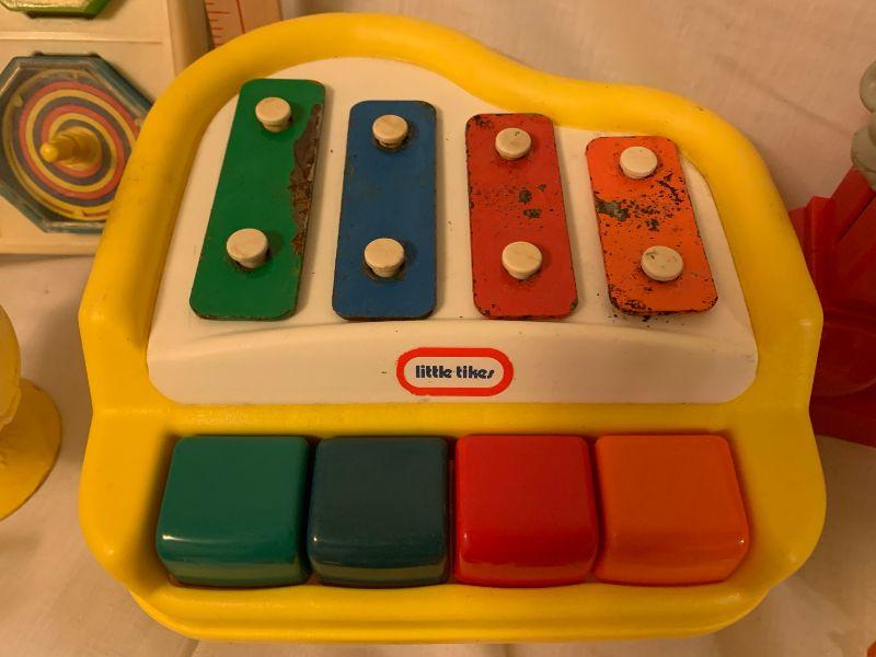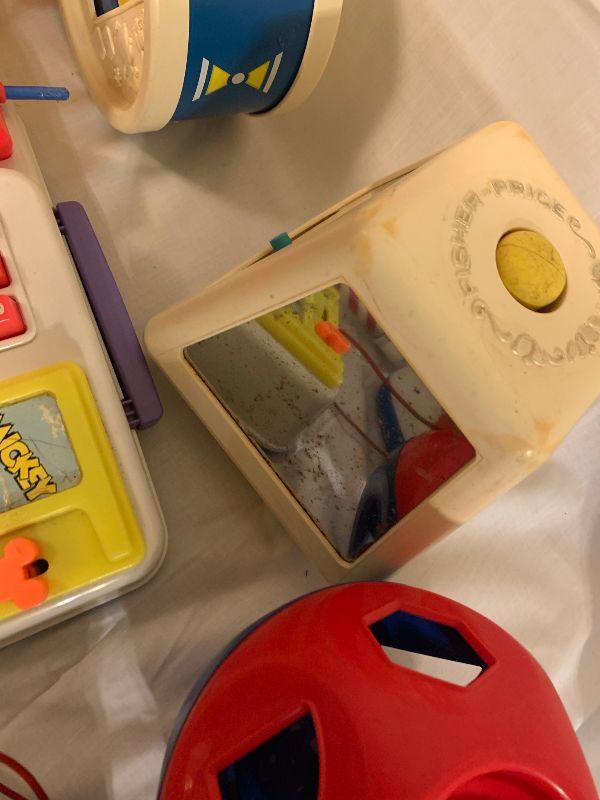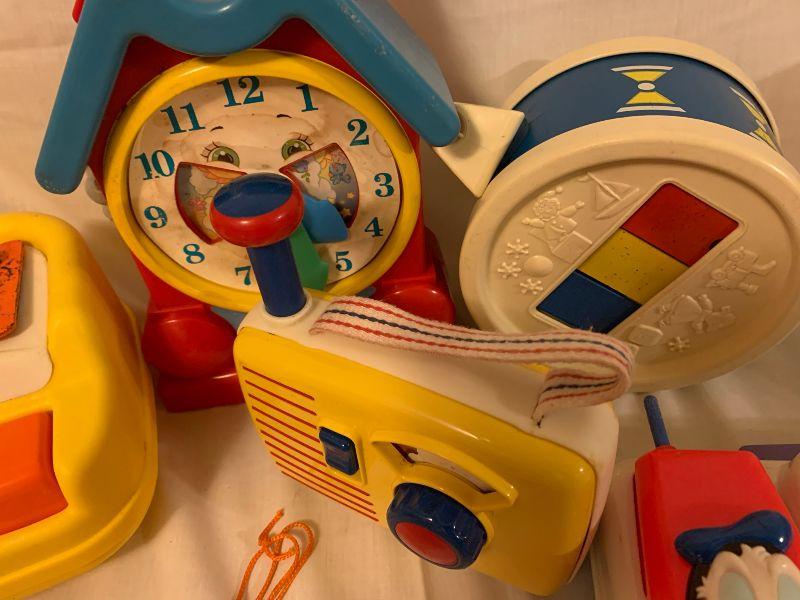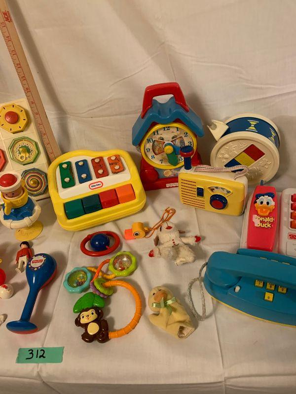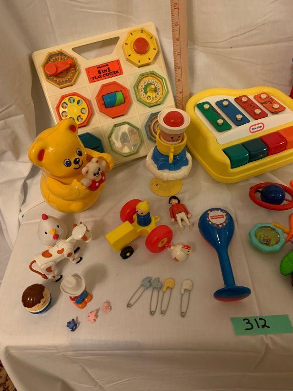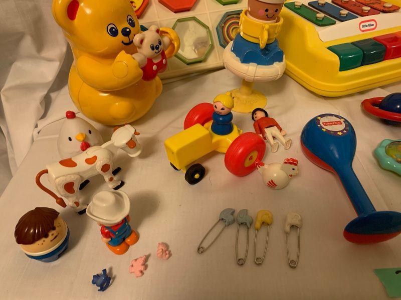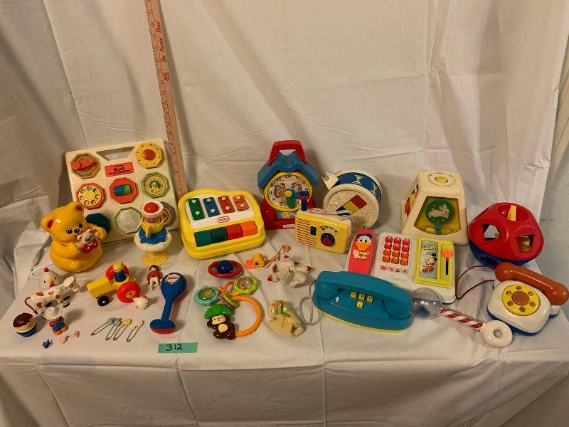 Vintage Baby Toys: Fisher Price Clock, Multi toy, Little Tikes, Disney Phone, Donald duck, Little People, drum missing stick as is, vintage diaper pins, rattles and more as is plus SHELCORE 8 in 1 play center
