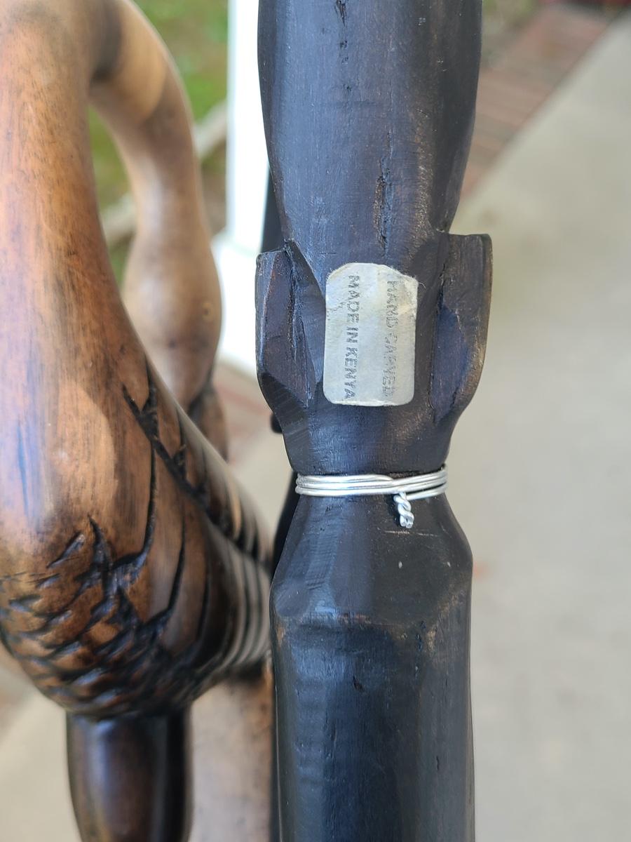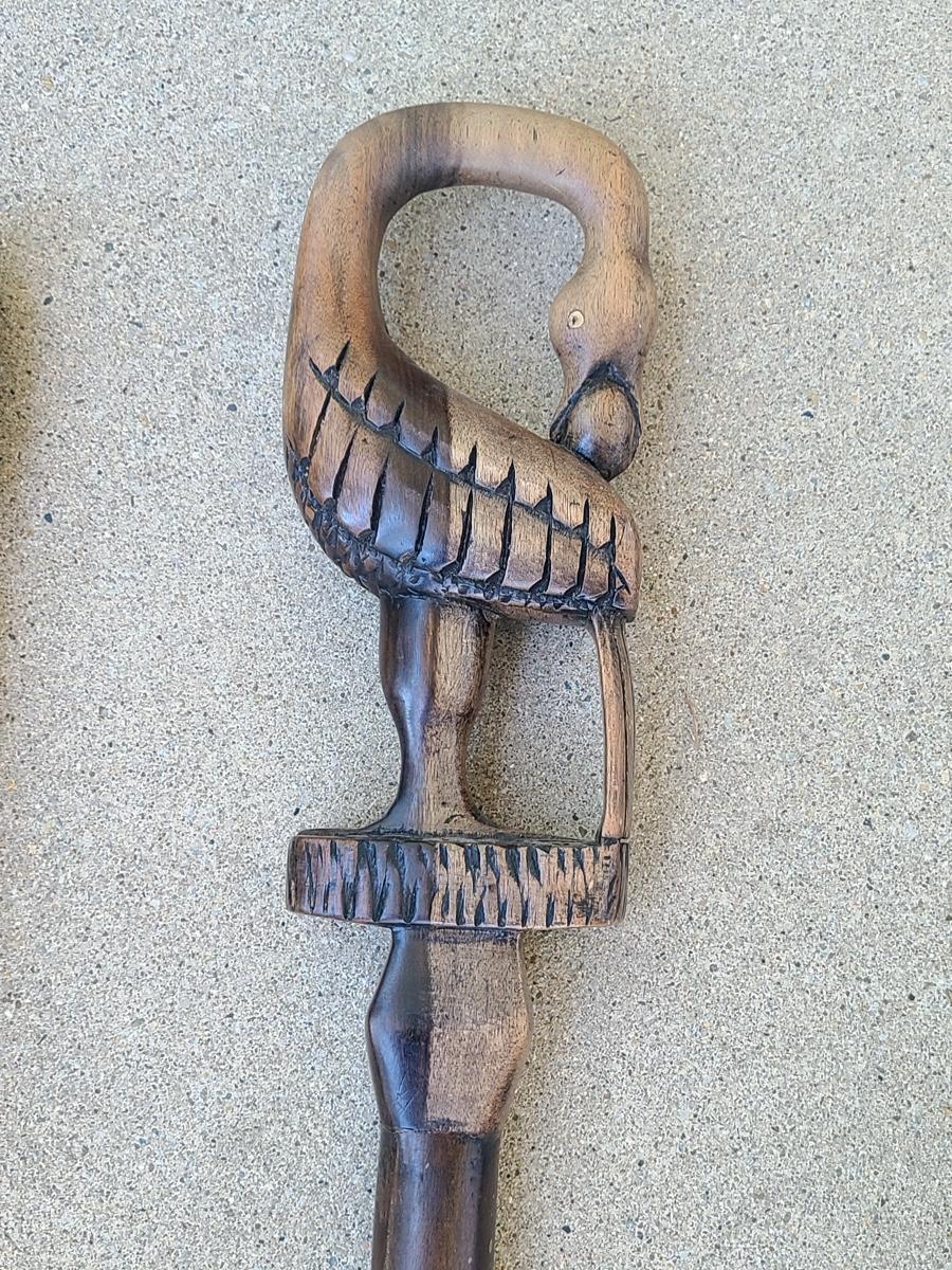 Two hand carved canes from Kenya with African men heads on top and snakes carved up sides, and the other looks like a flamingo with ball in month. These are works of functional art!