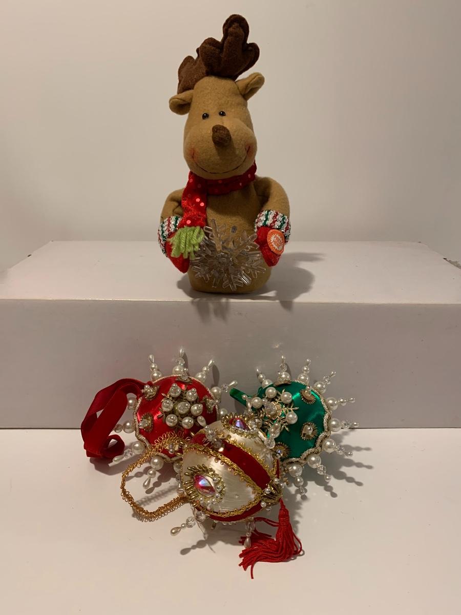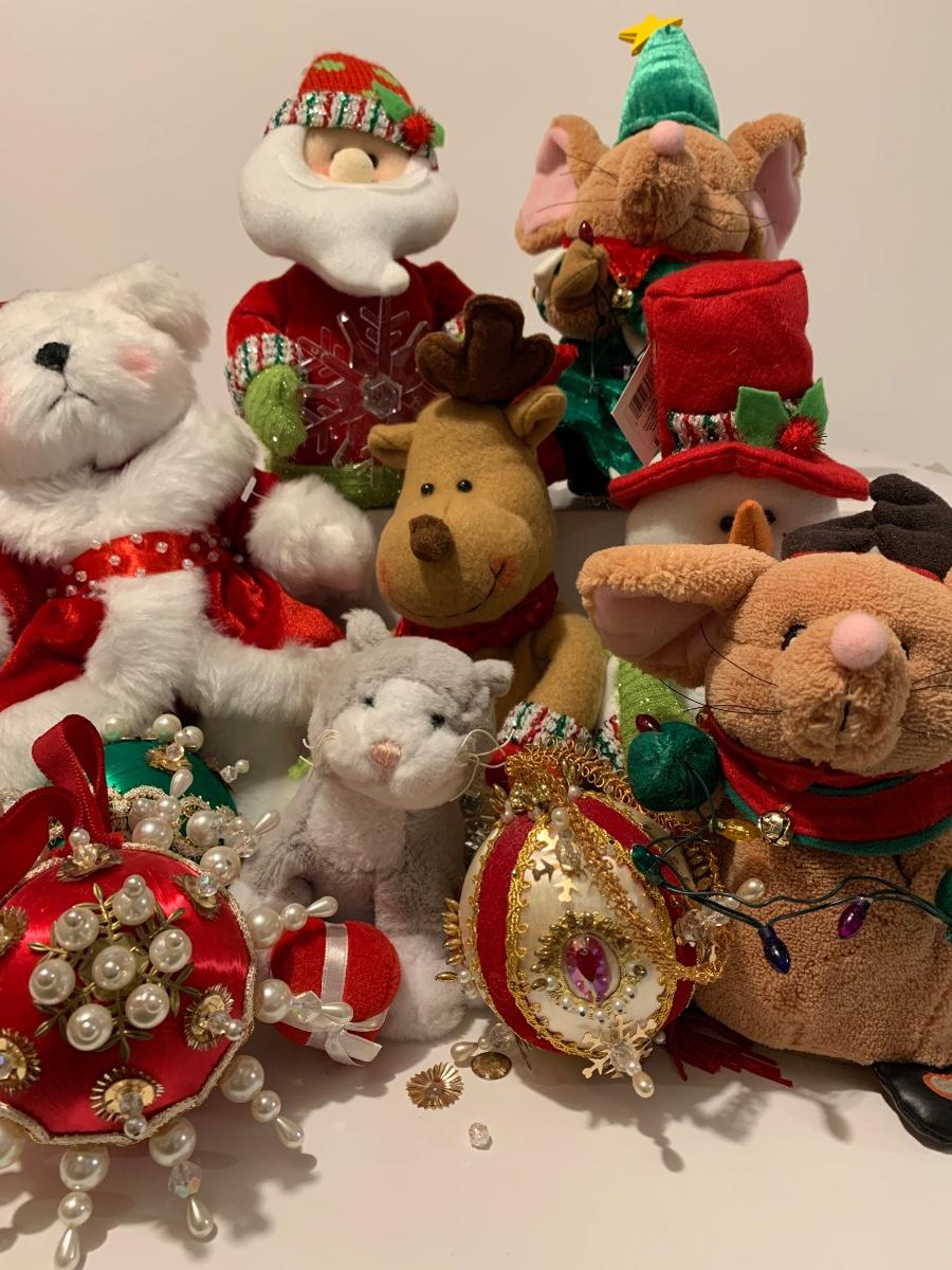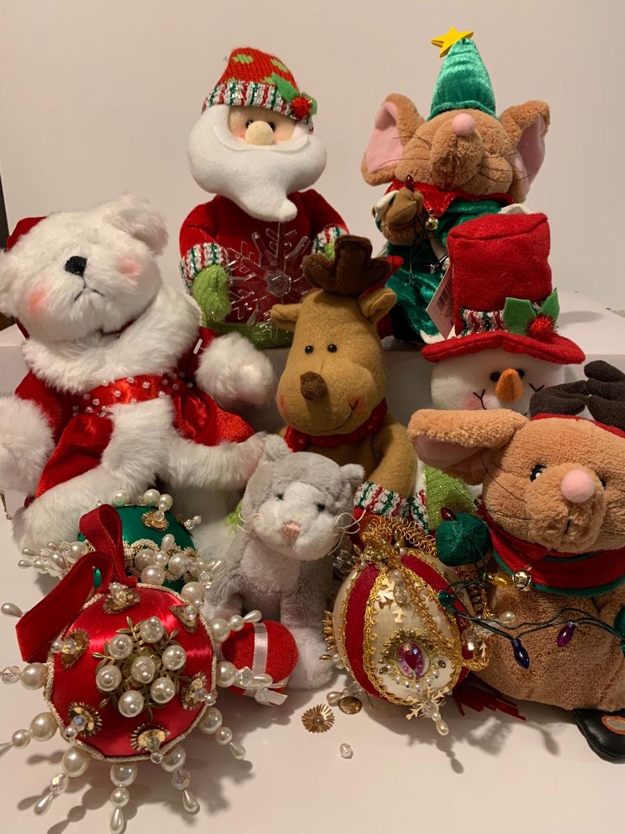 Fun lot of untested battery operated musical Christmas animals, Rockets Bear and vintage beaded handmade ornaments for gift giving or adding to your own collection.
