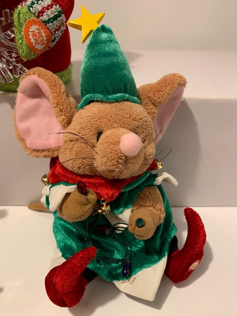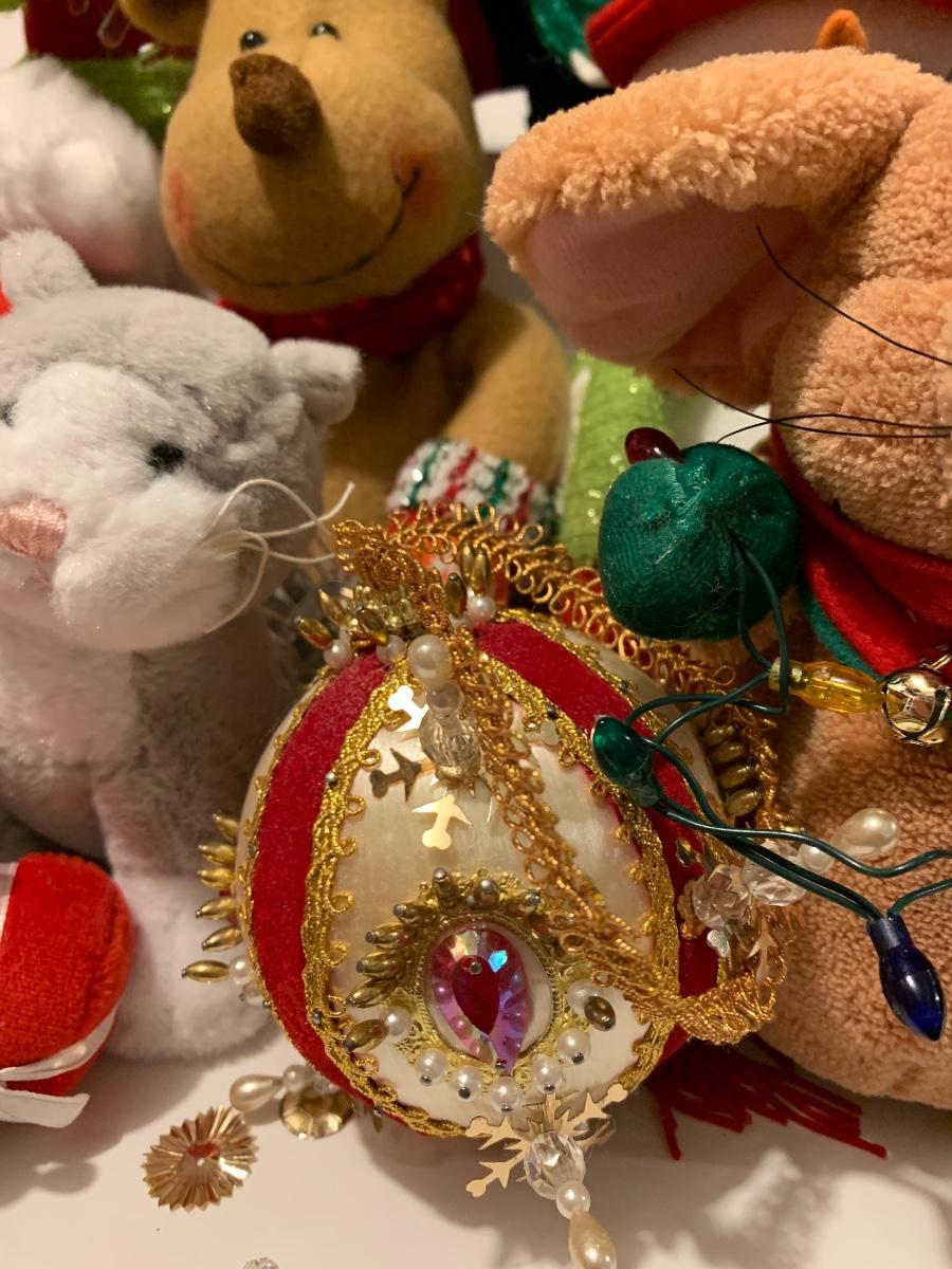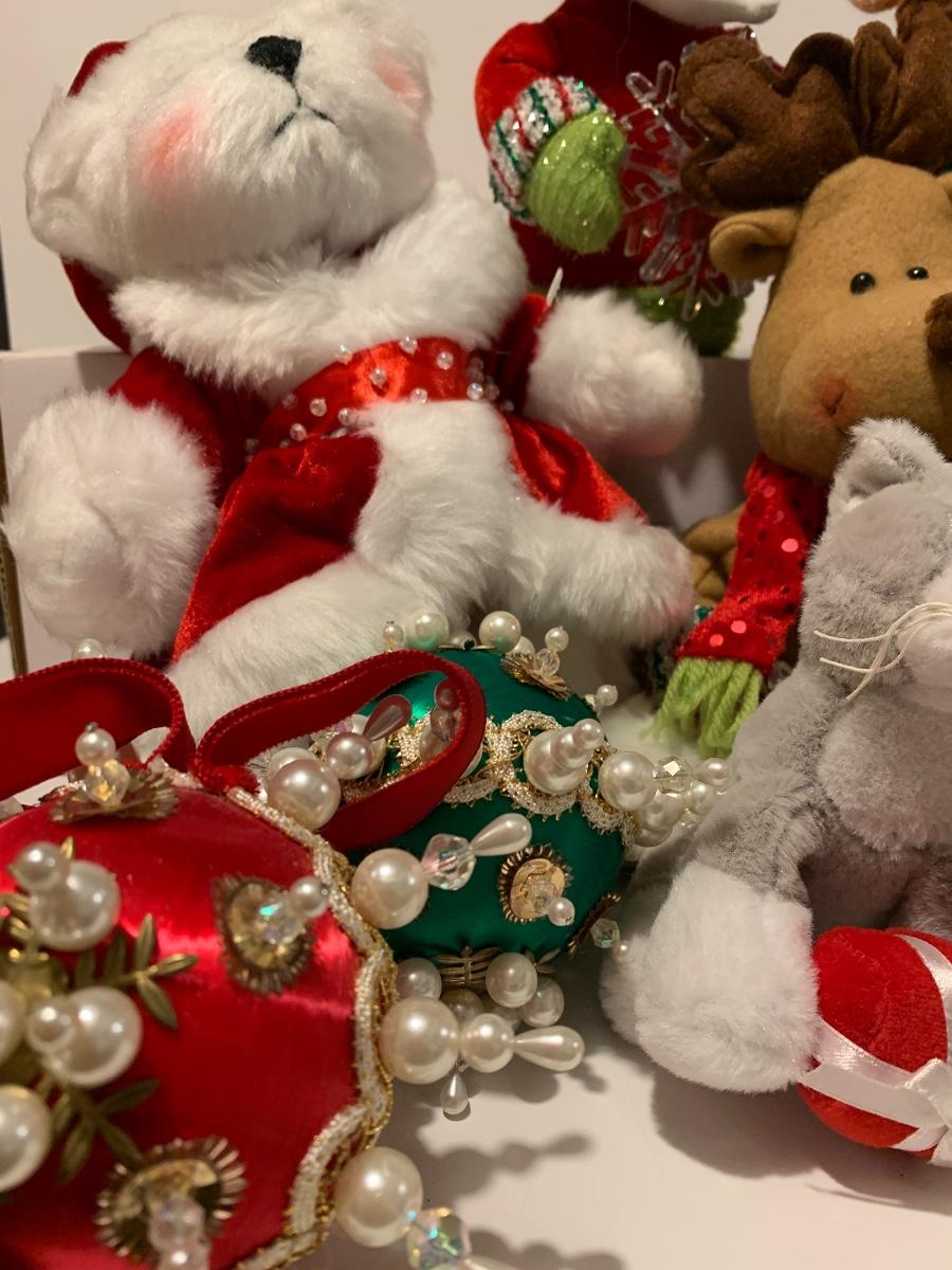 Fun lot of untested battery operated musical Christmas animals, Rockets Bear and vintage beaded handmade ornaments for gift giving or adding to your own collection.