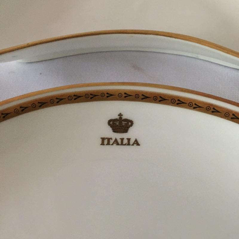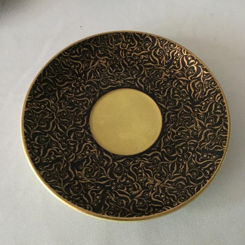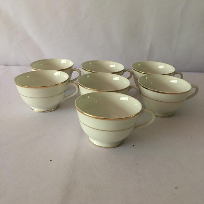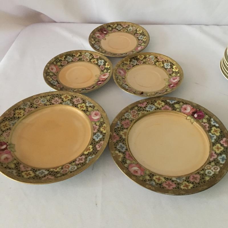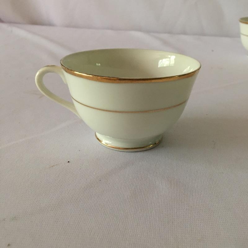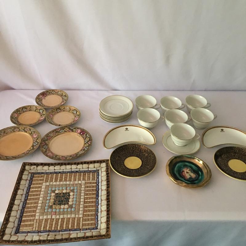 Array of gold accent dishes. Lot includes large plate that measures 12” x 12”, seven cups and saucers, two half moon dishes, three saucers and two small plates and more. Shipping available.
