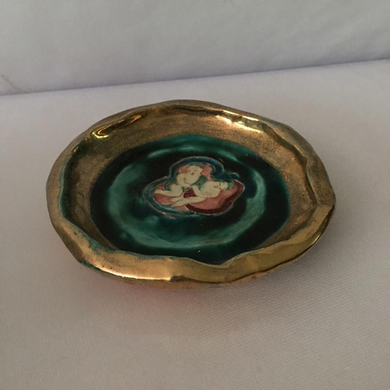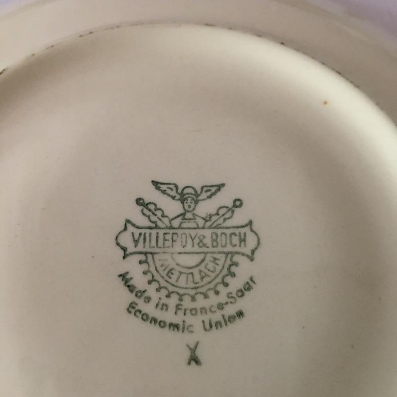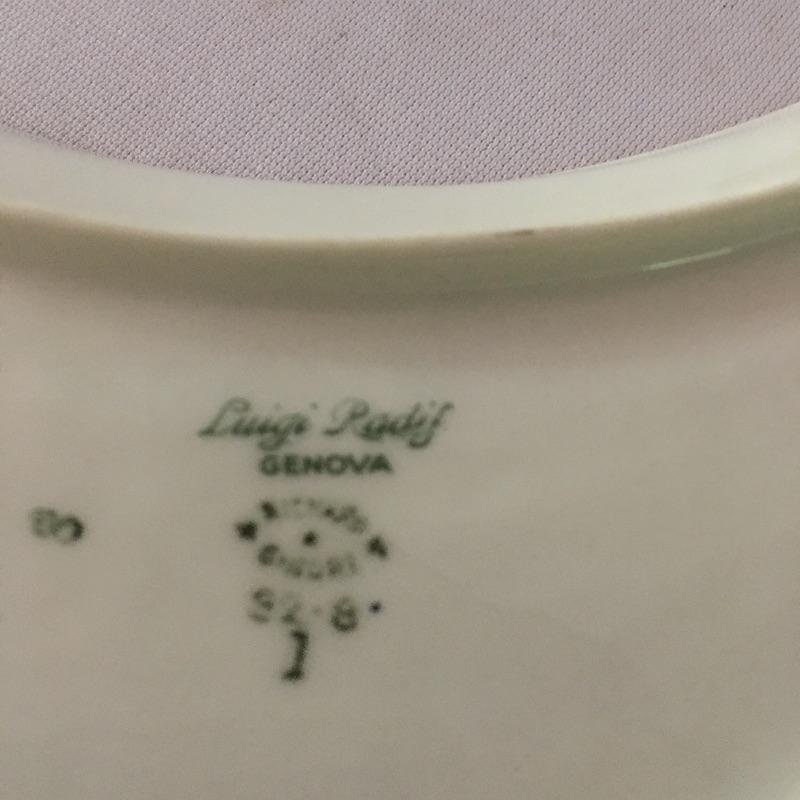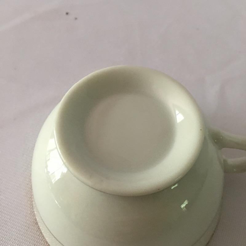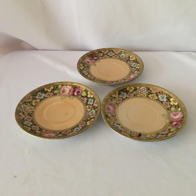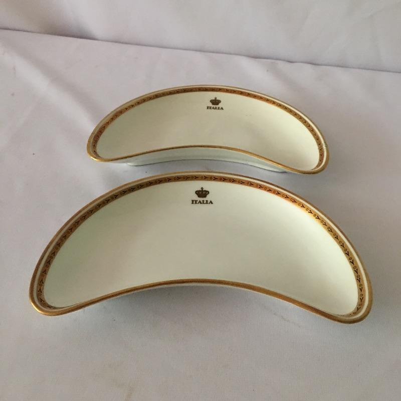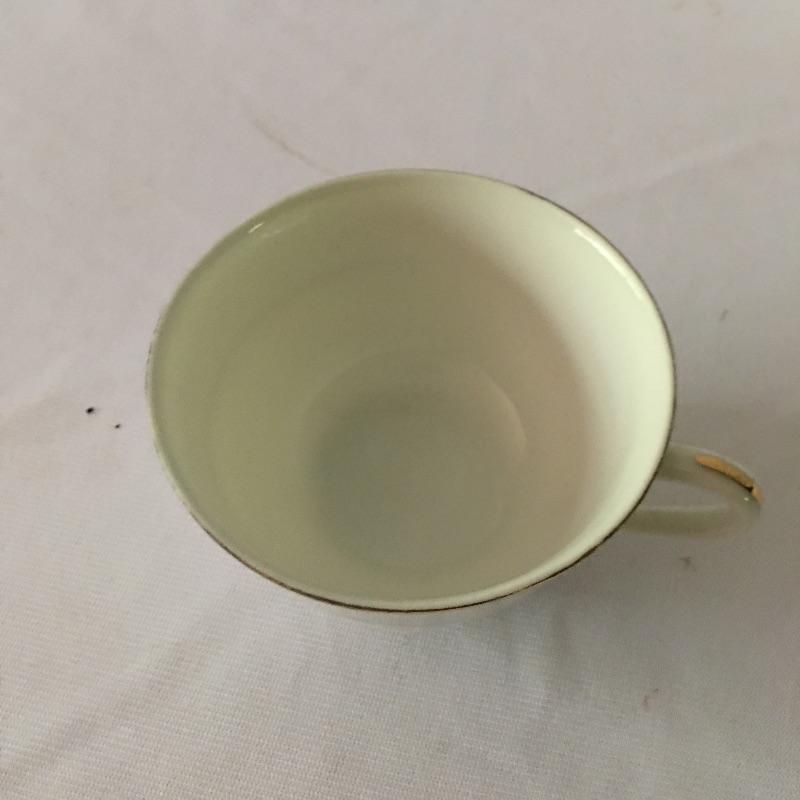Array of gold accent dishes. Lot includes large plate that measures 12” x 12”, seven cups and saucers, two half moon dishes, three saucers and two small plates and more. Shipping available.