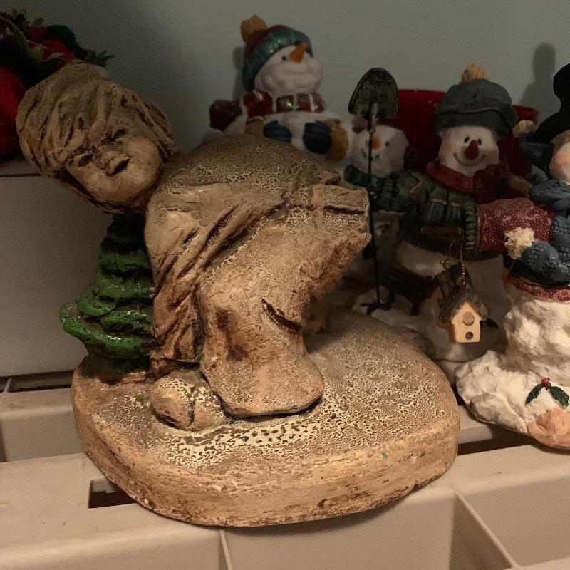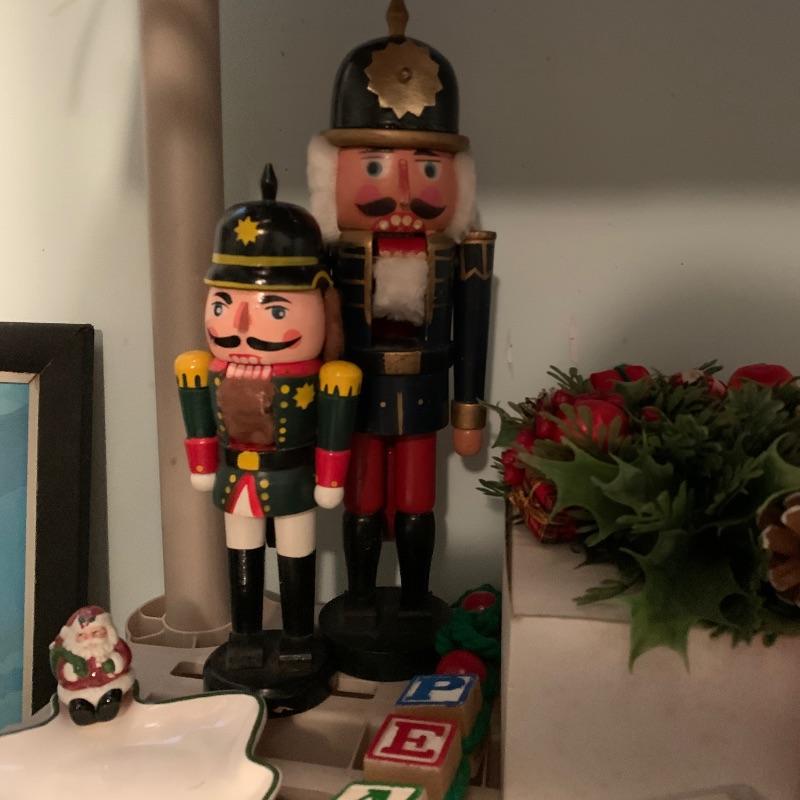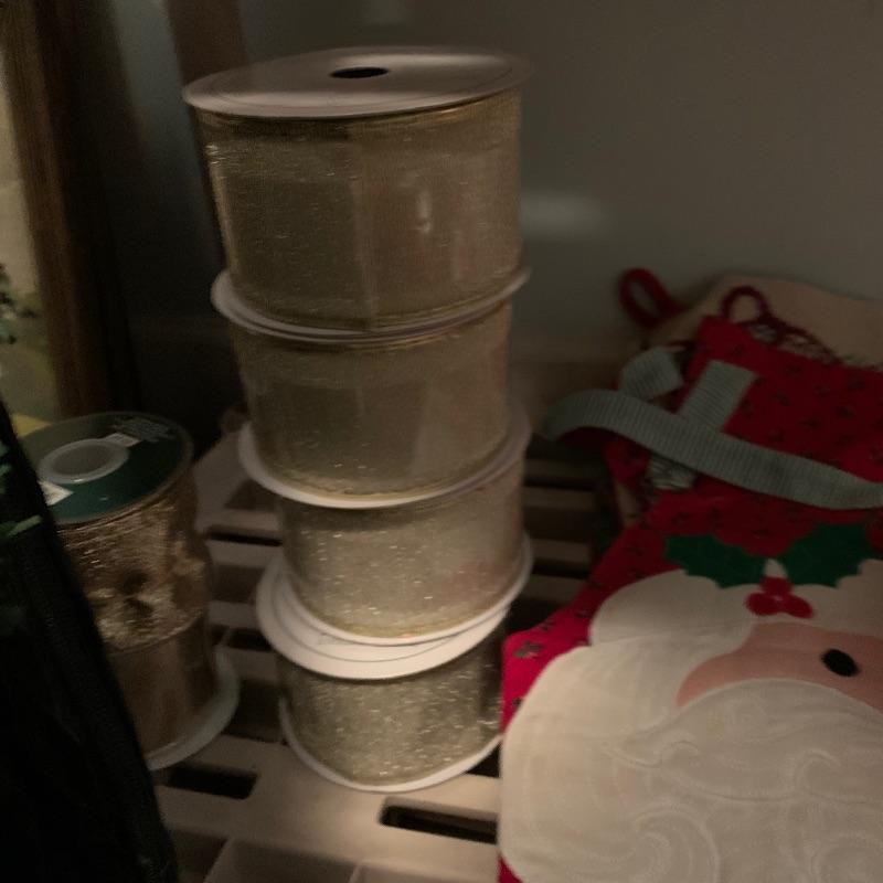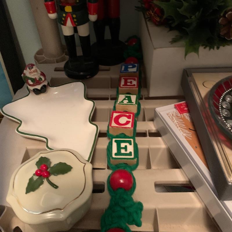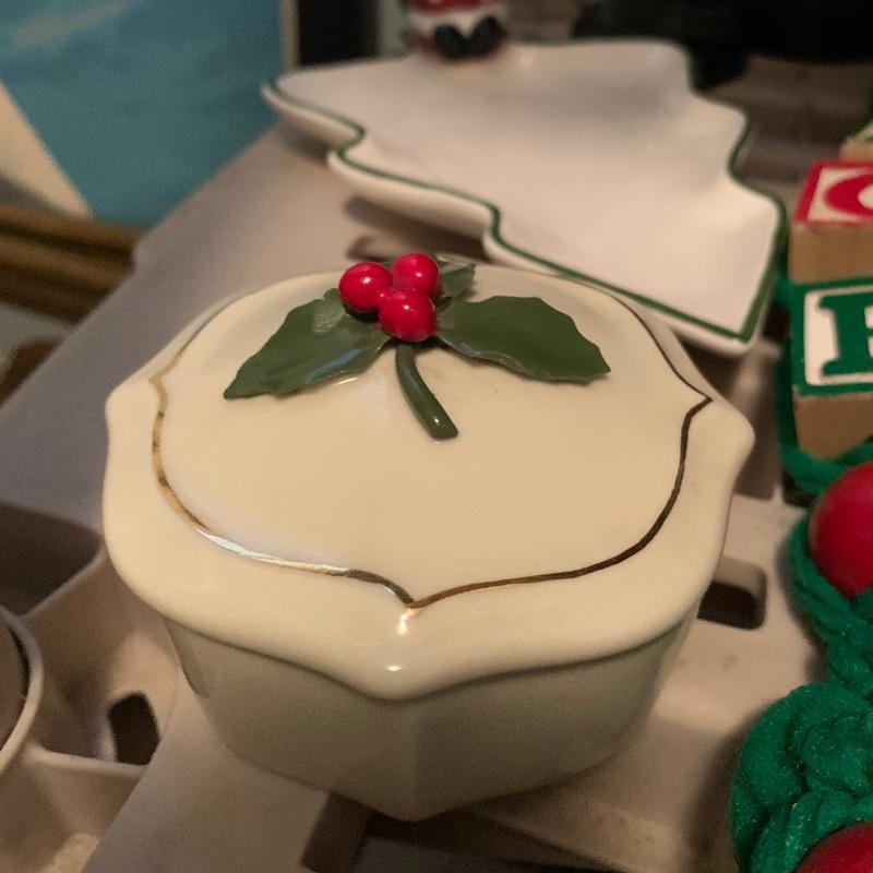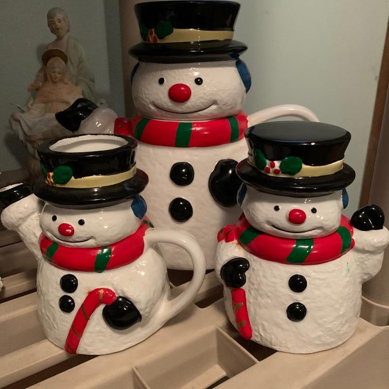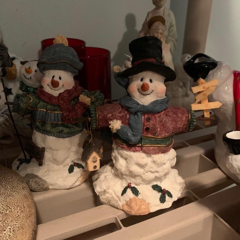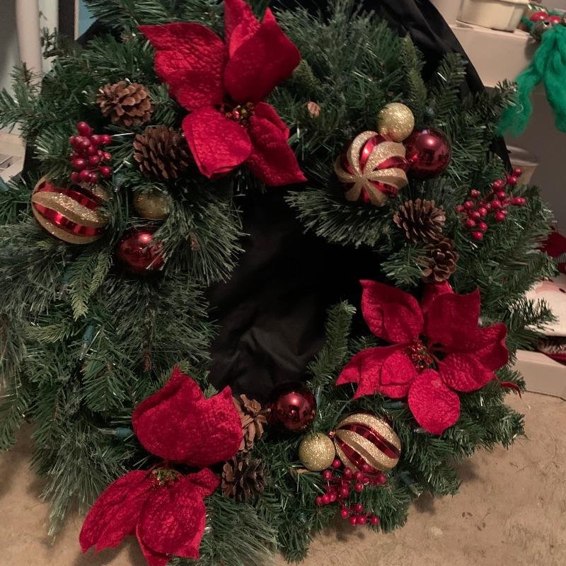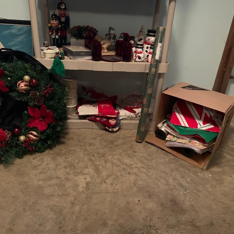 Festive decor to include, pair of nutcrackers, snowmen figurines, snowman teapot with matching cream and sugar and large,like new door wreath that measures 25”. Lot also includes wrapping supplies with lovely ribbon, some linens and serving pieces and nine ruby red glasses, perfect for your eggnog. Local pick up only.