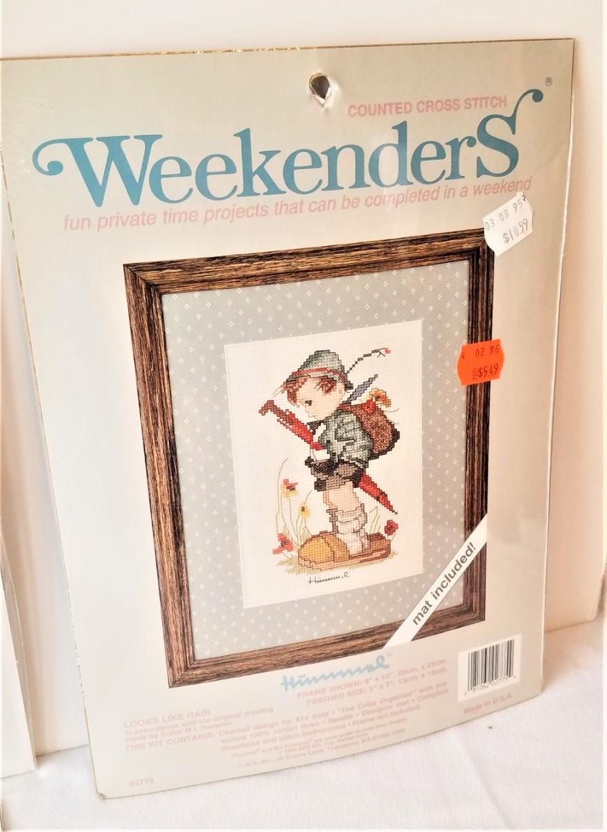 These four 1990's Complete in a Weekend counted cross stitch kits are new and unopened - they each feature a Hummel illustration. 2 are alike "Looks Like Rain" - the others are "Not for You" and "Sleepy Time."