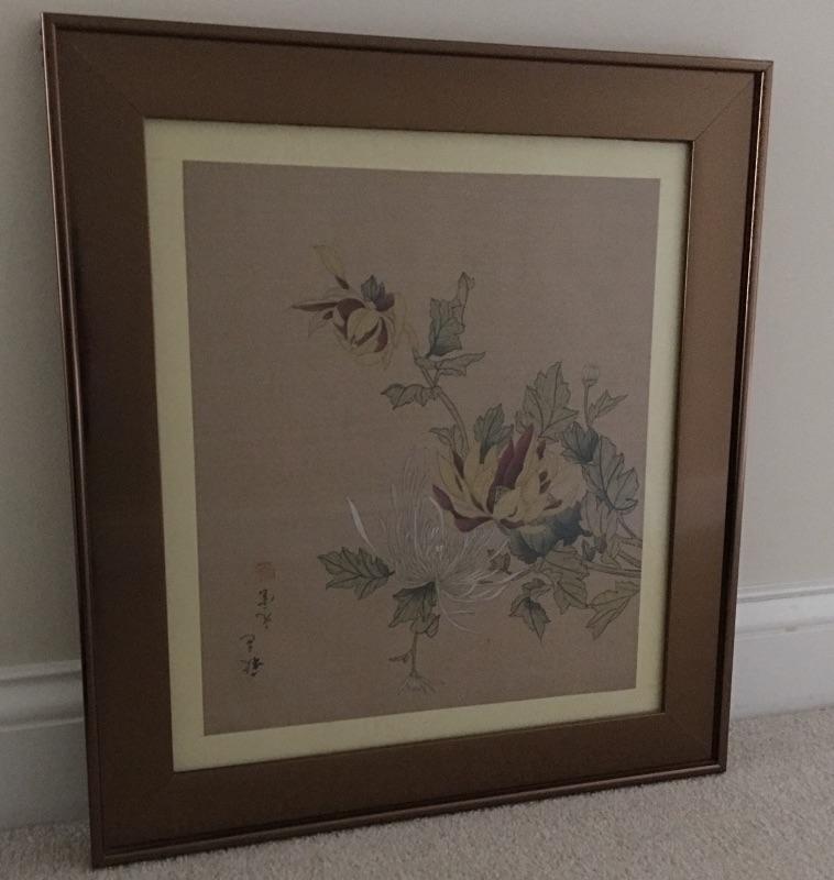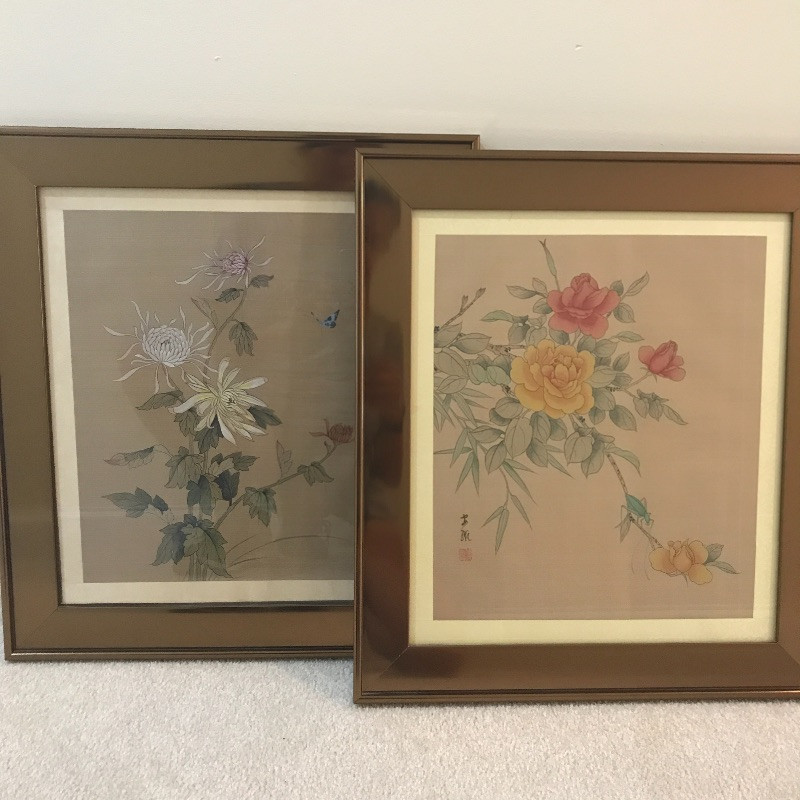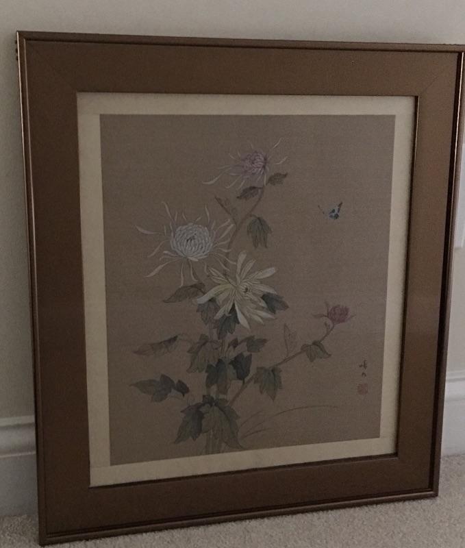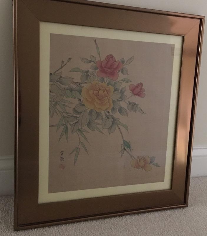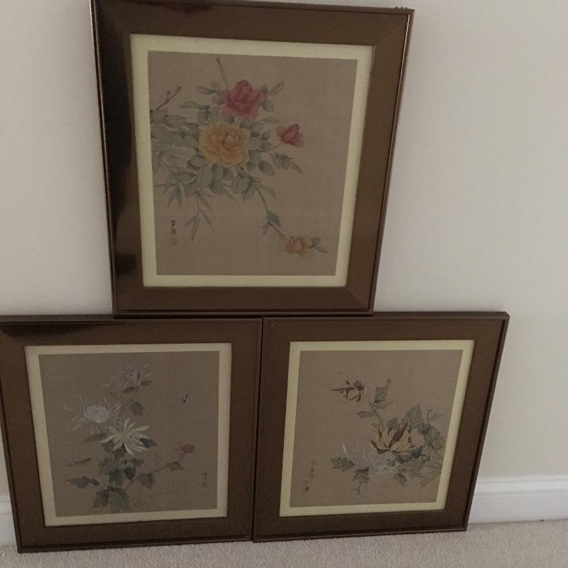 Gorgeous trio of framed Asian artwork in matching bronze colored frames. Each piece depicts a delicate depiction of a flower. Frames measure 17.5” x 20”.