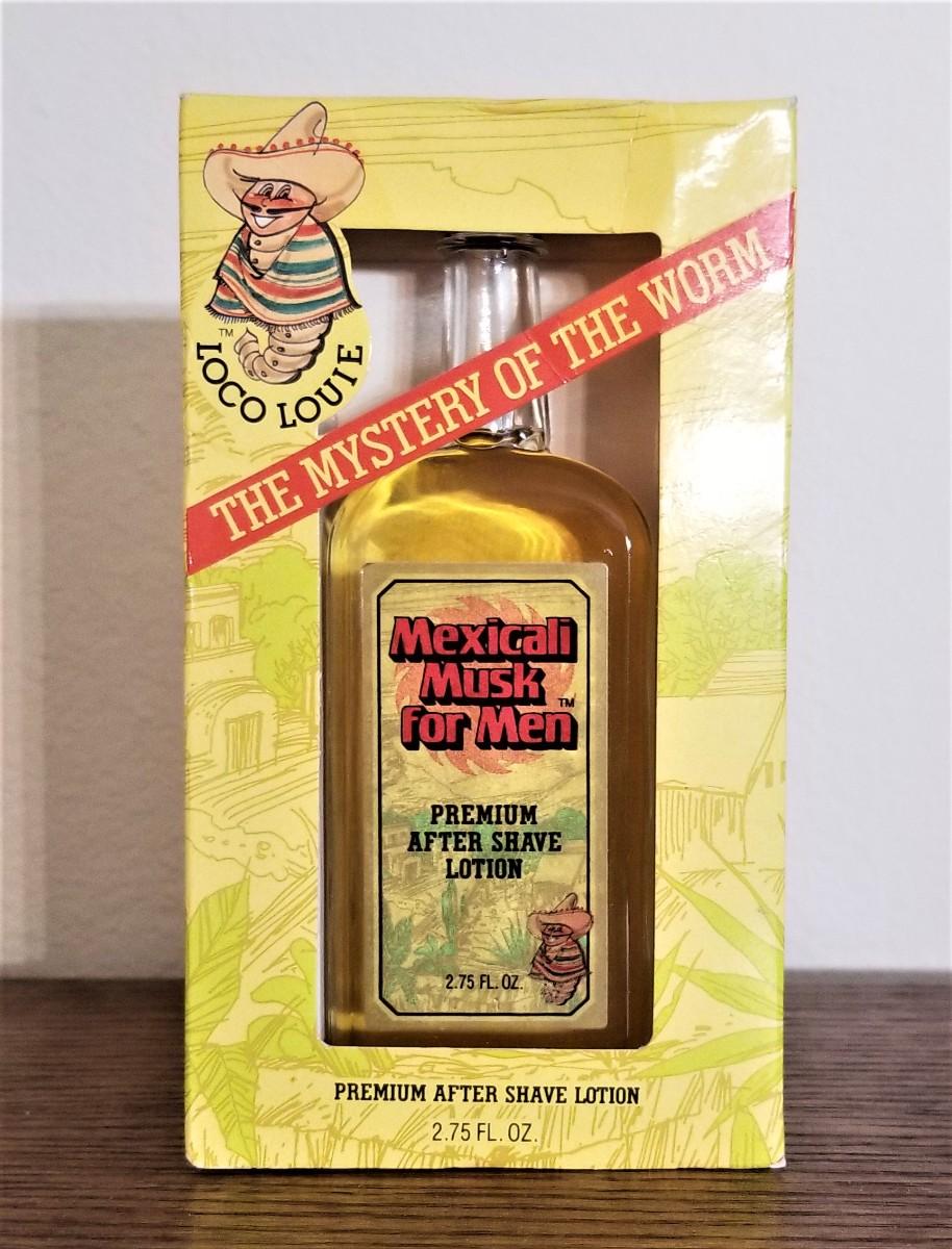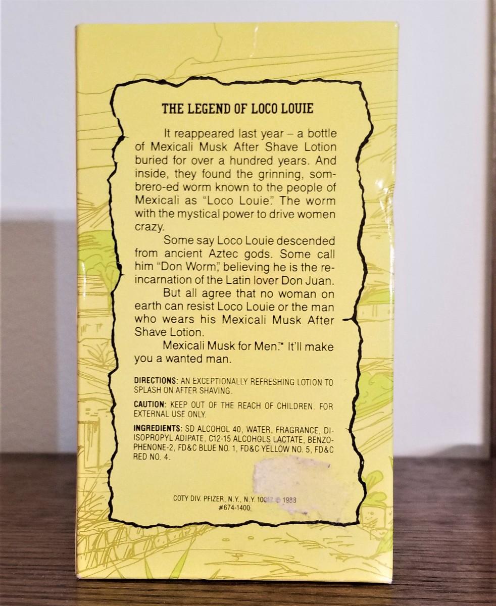 Their slogan is "It'll make you a wanted man....." Explore the so-called "Mystery of the Worm" with this scarce unopened bottle of Loco Louie's Mexicali Musk for Men." Made 1988 by Coty. Premium Aftershave. 2.75 fluid ounces.