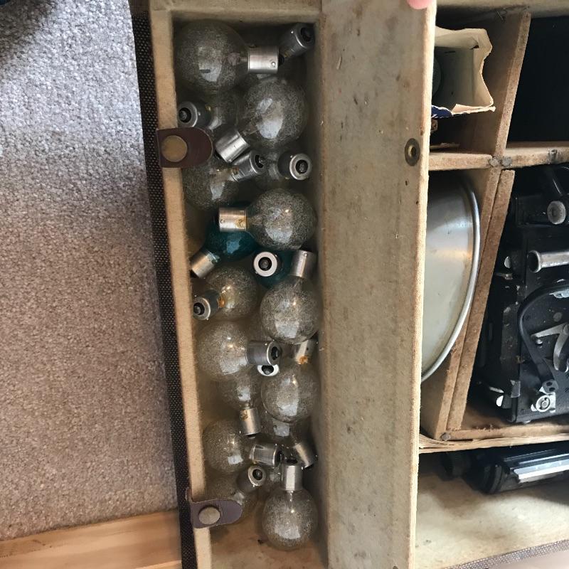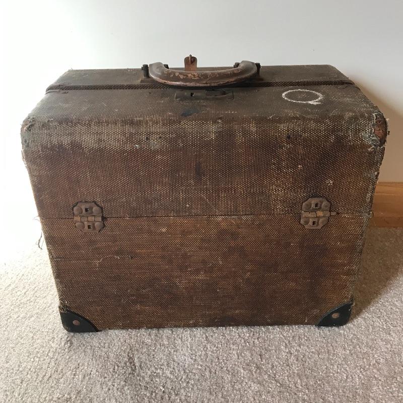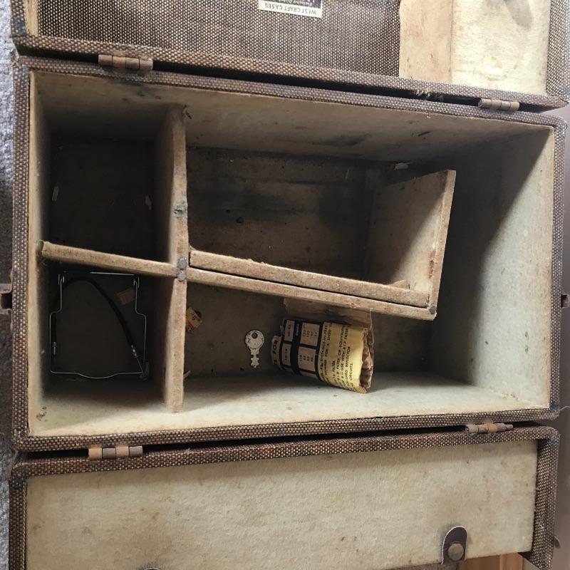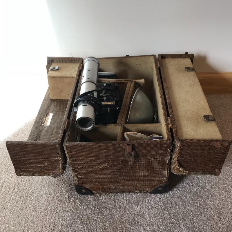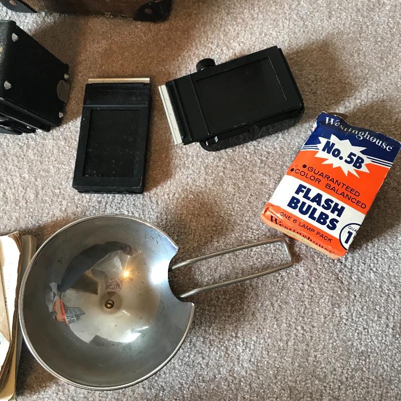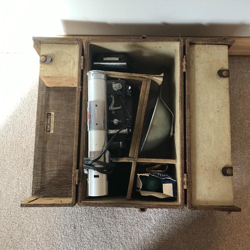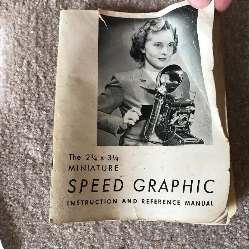 Vintage Speed Graphic camera housing in its old fashioned case will make for fine vintage decor! The camera itself is missing and the electric cord seems to be dry rotting. This would be an ideal find for the vintage camera aficionado or hobbyist to restore, as it comes with its manual, a 5” reflector and a bunch of bulbs! The case is a combination of canvas, leather and metal. It’s sturdy and we found a key inside that may work, but the lock appears rusted and we didn’t test it. Case measures approximately 14” x 8” x 12”. Shipping available.