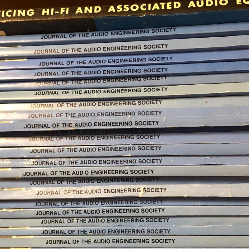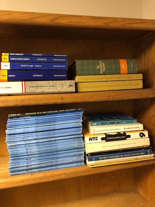 This lot contains about ten books/manuals on semiconductors, thirty-six “Journal Of The Audio Engineering Society” and more.
