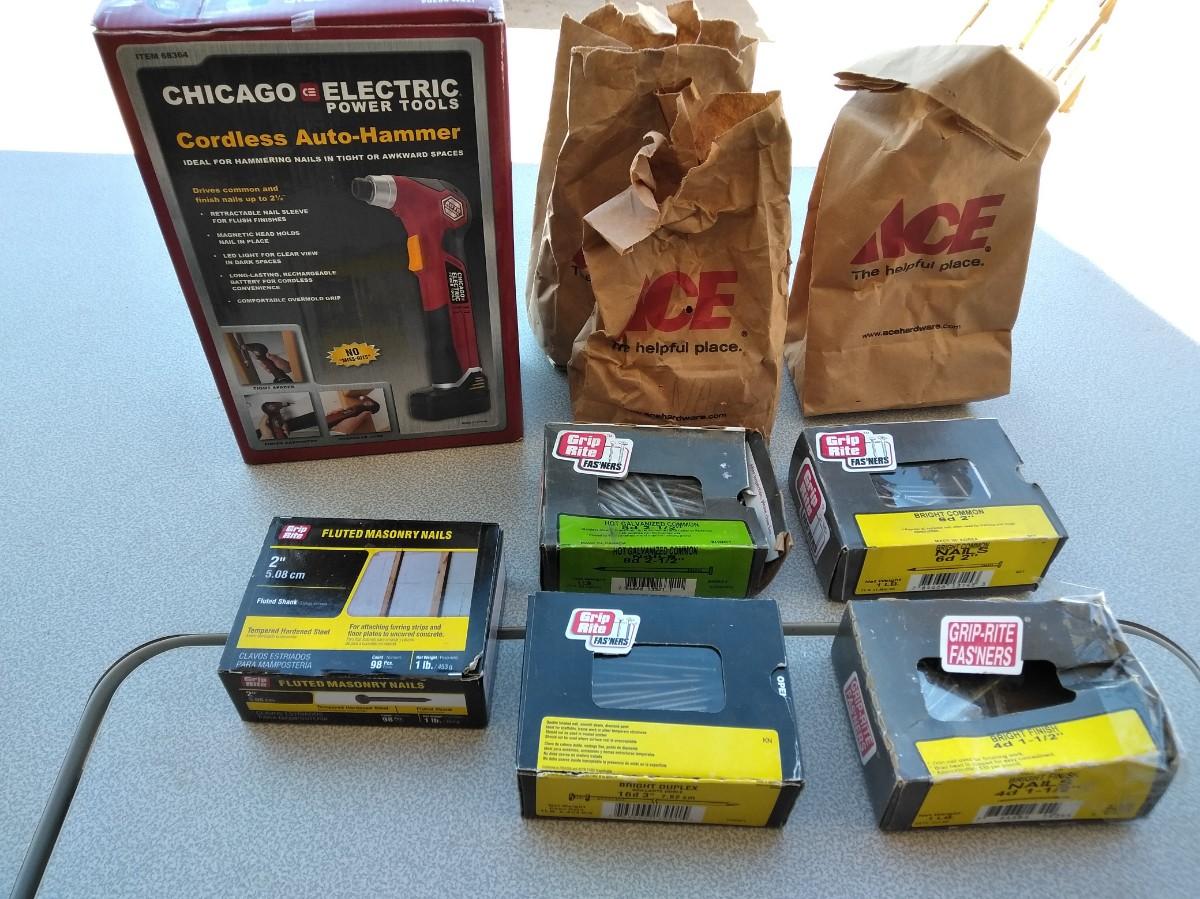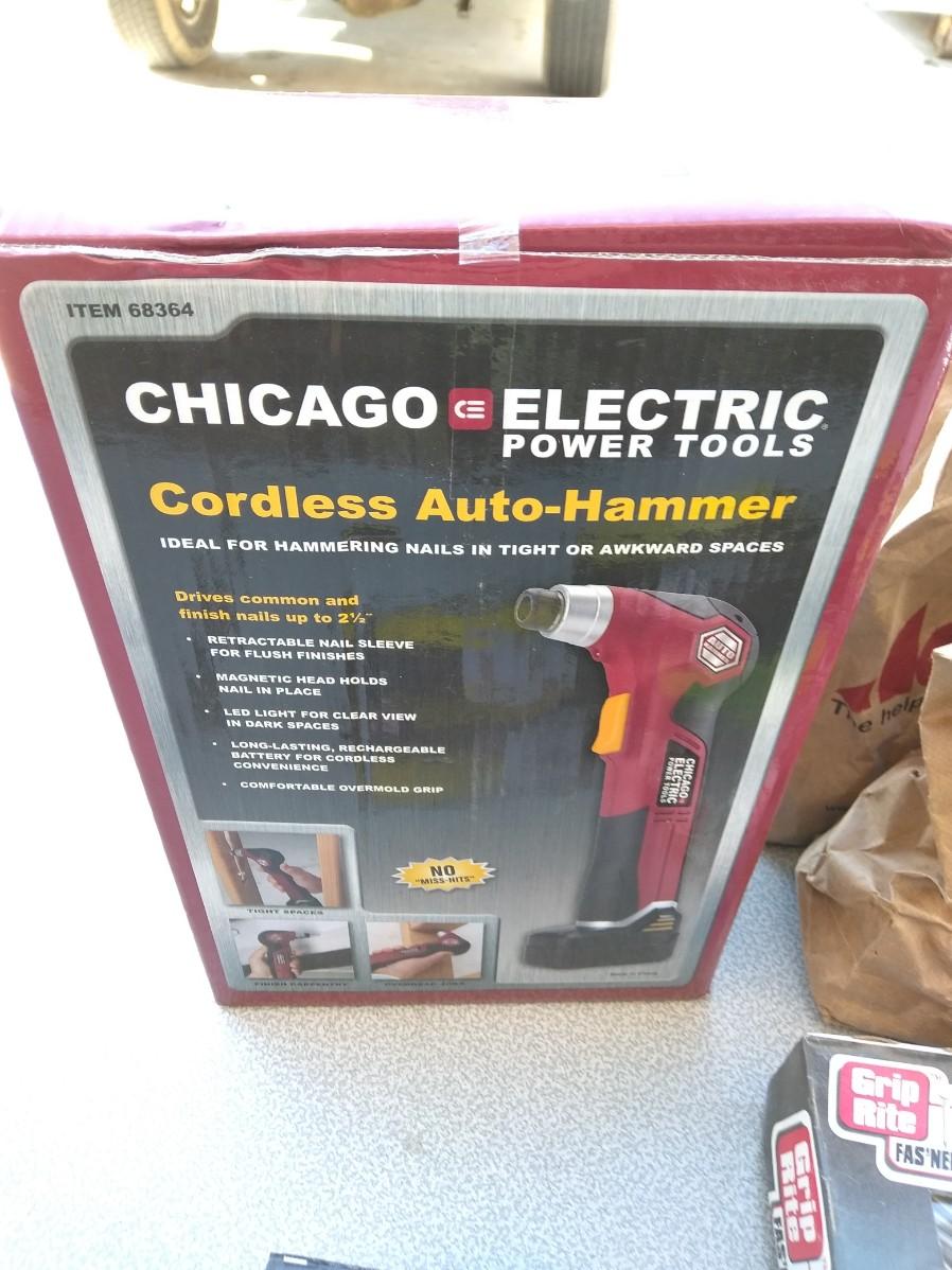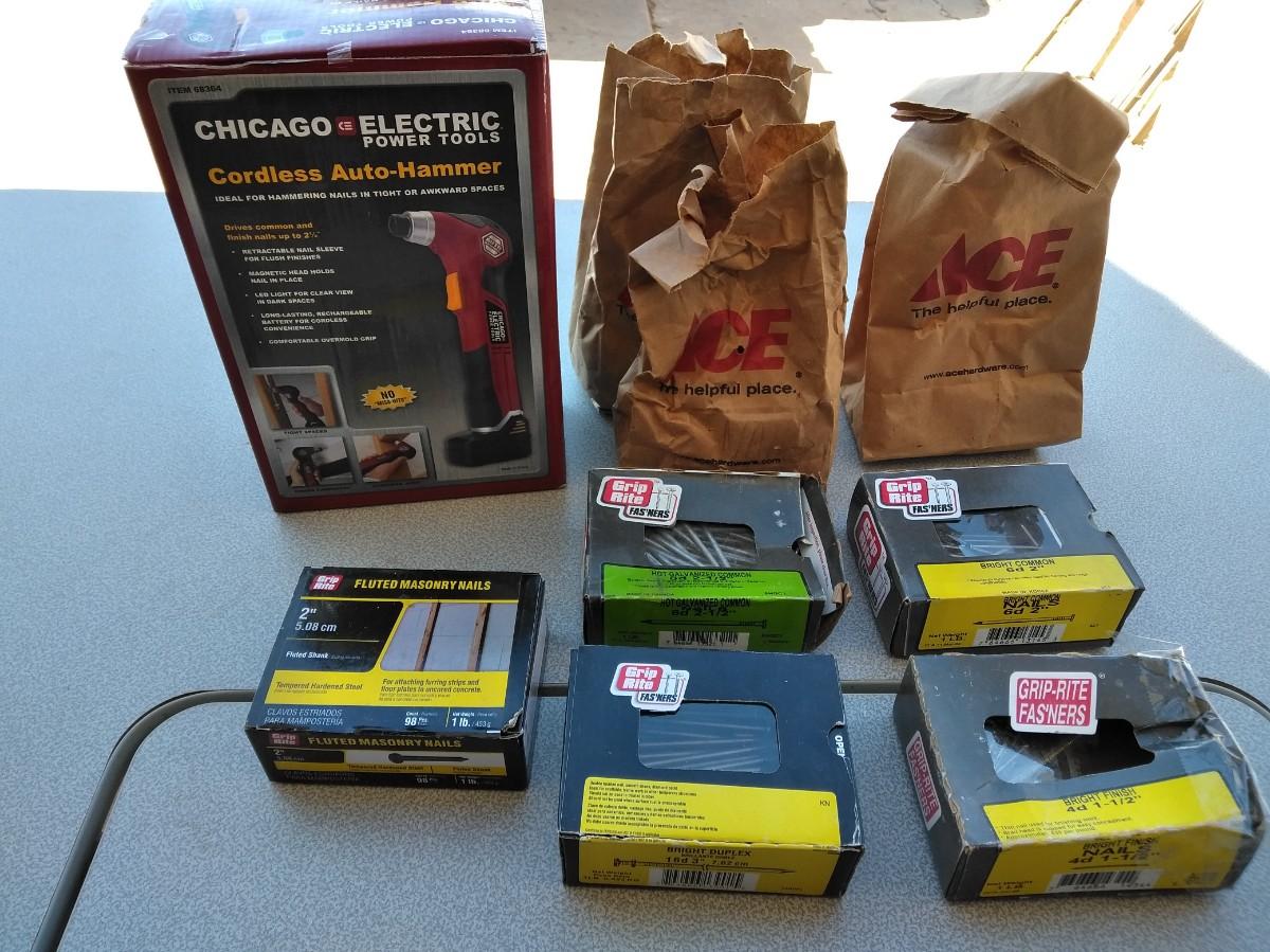CHICAGO ELECTRIC CORDLESS AUTO-HAMMER AND VARIETY OF HARDWARE