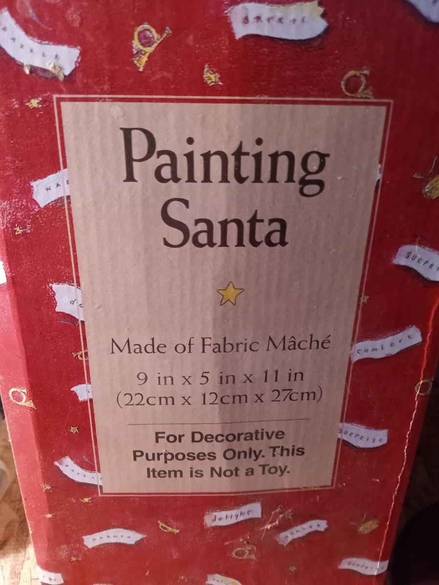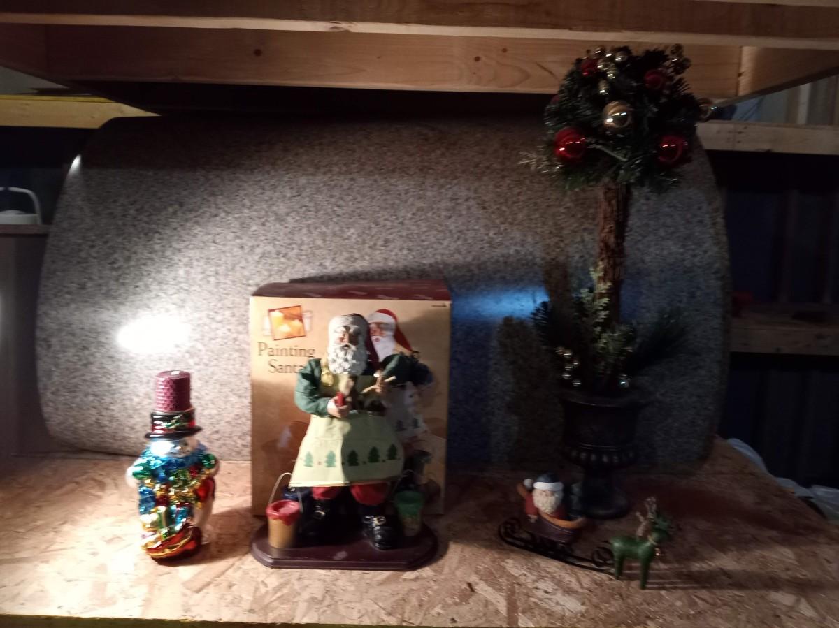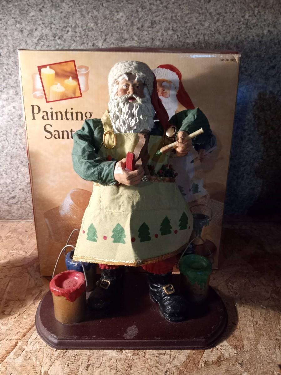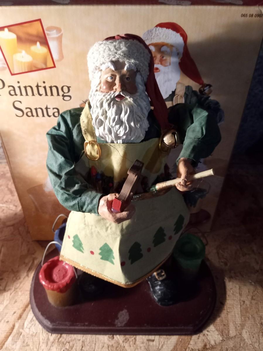 A PAPER MACHE PAINTING SANTA, SNOWMAN CANDLE HOLDER AND A FAUX PLANT IN A PLANTER