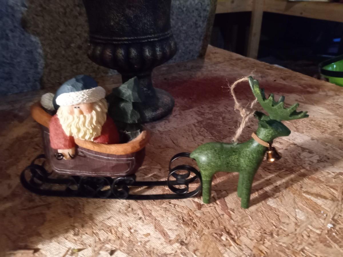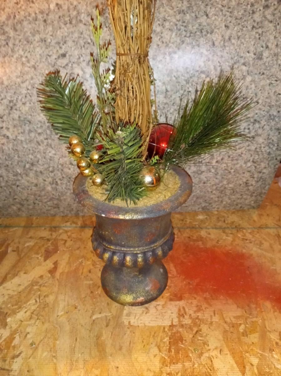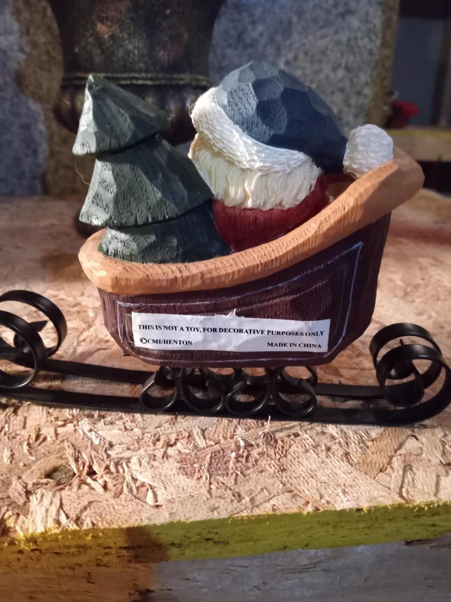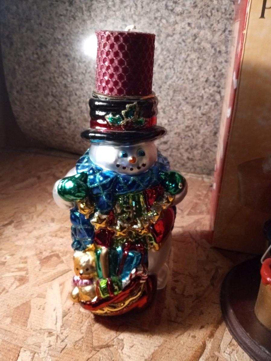 A PAPER MACHE PAINTING SANTA, SNOWMAN CANDLE HOLDER AND A FAUX PLANT IN A PLANTER
