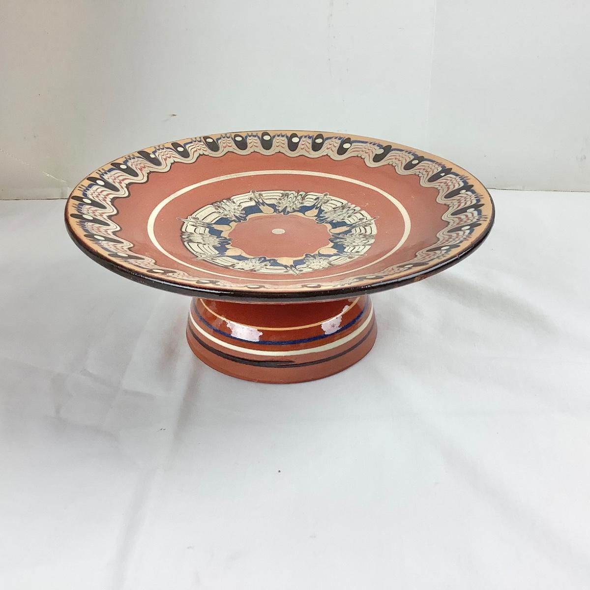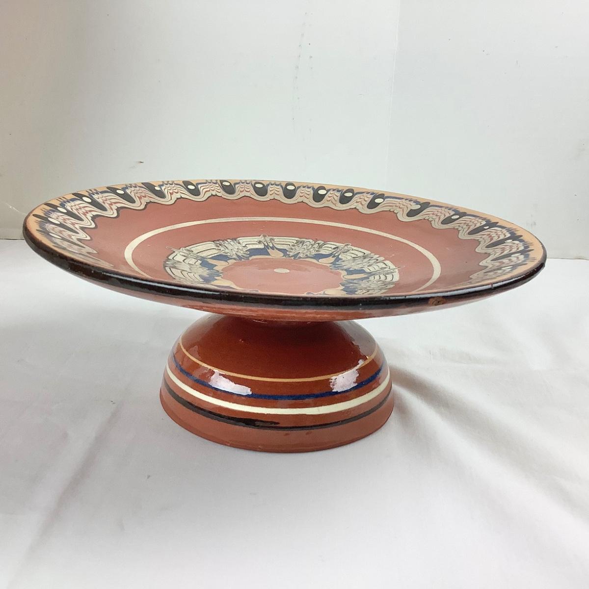 - Salt Glazed Pedestal Serving Plate, measures 3.5” High x 8.75” Round