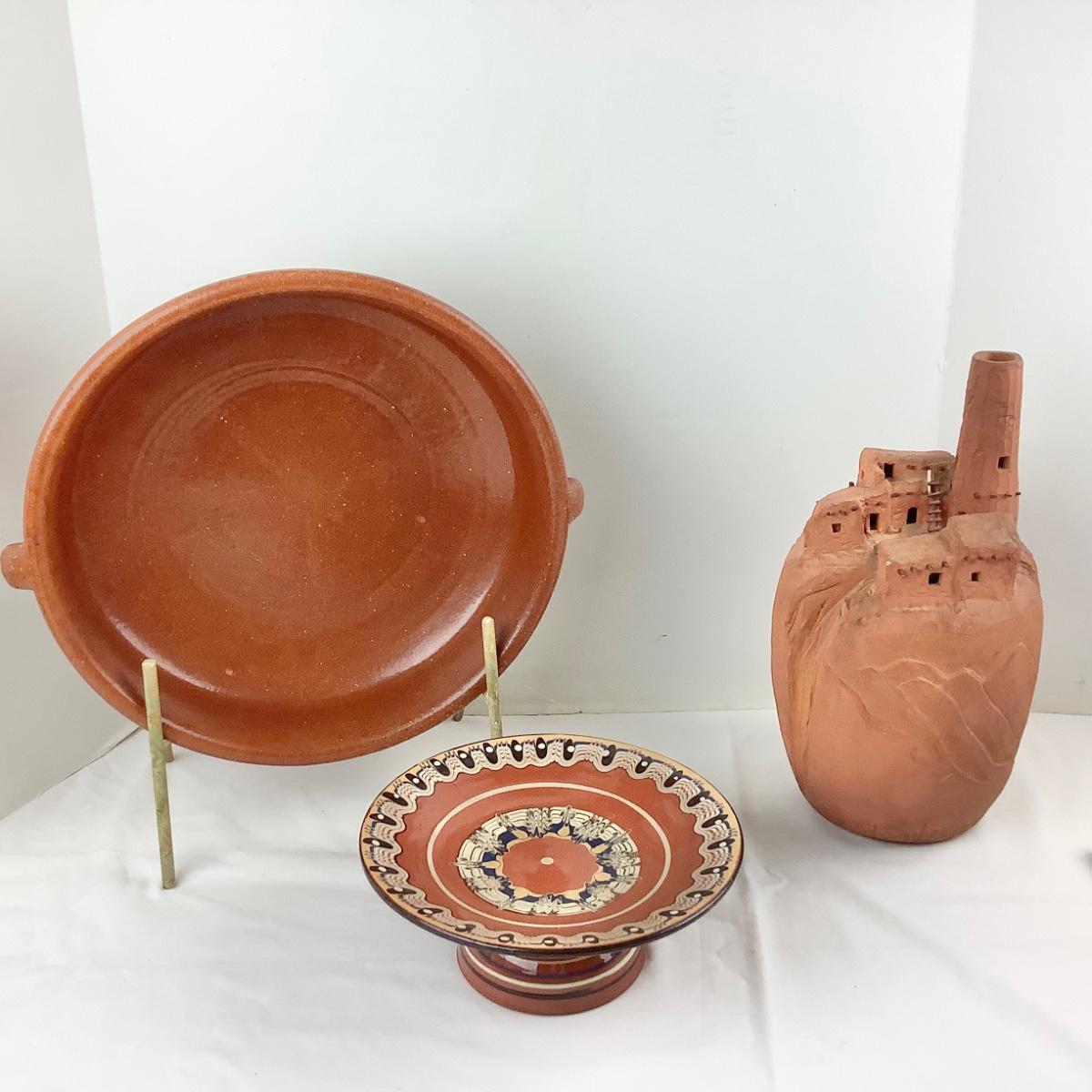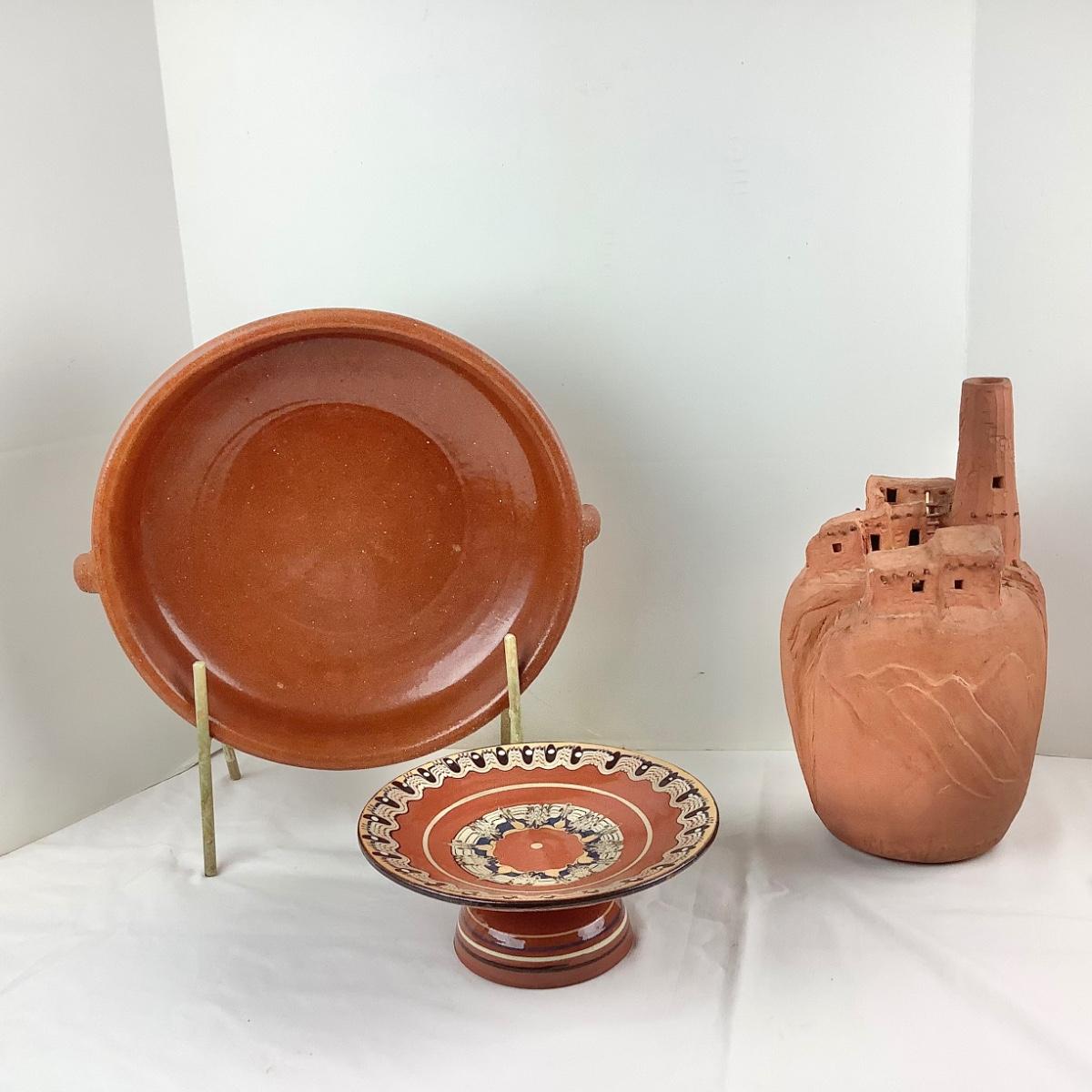 Lot 313 Artisan Signed Terracotta Sculpture & Salt Glazed Serving Dishes