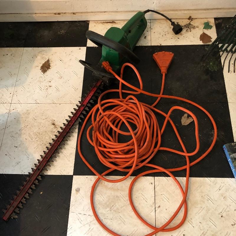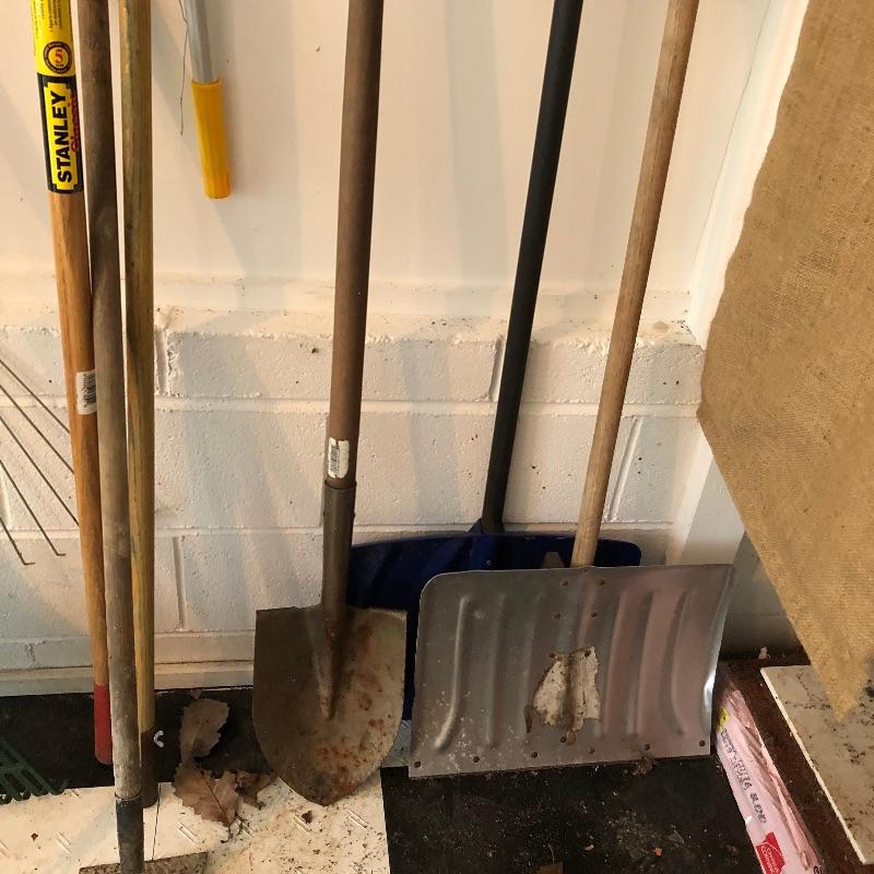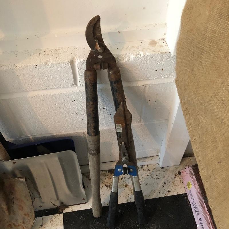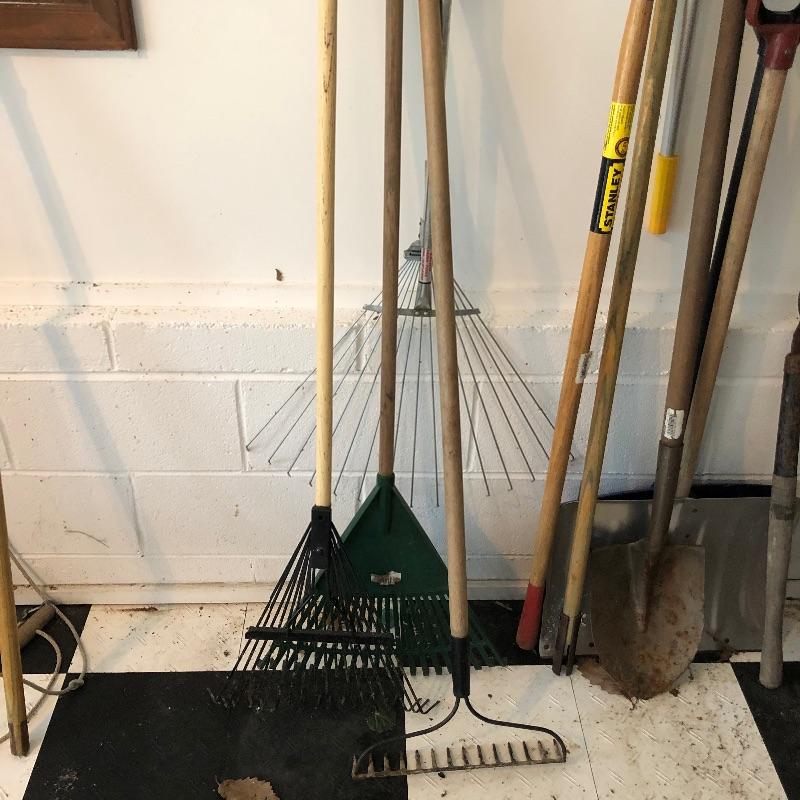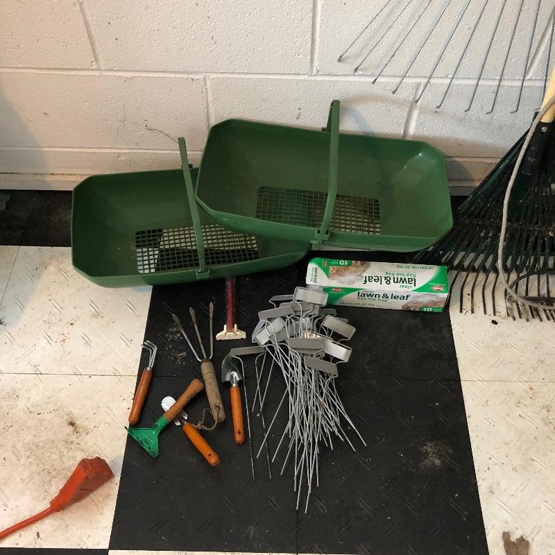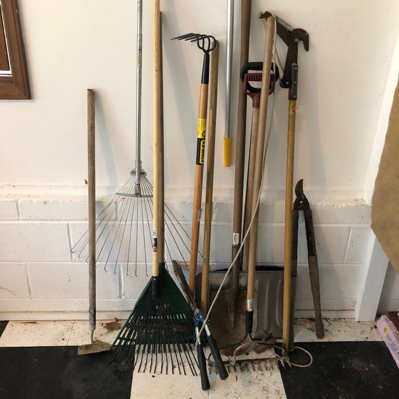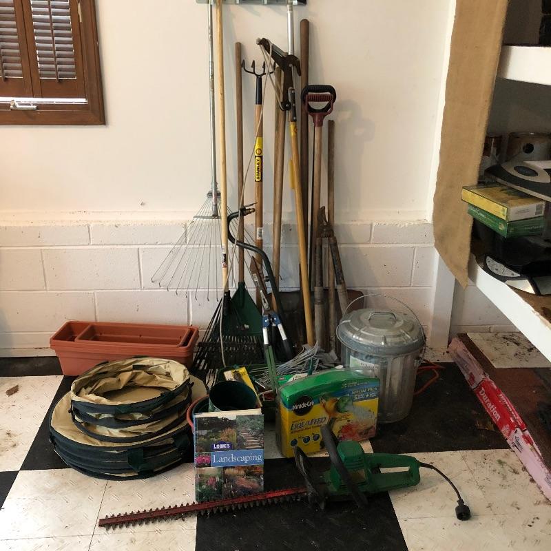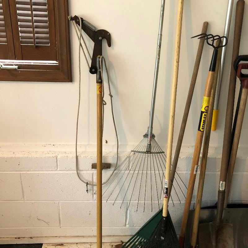 This large lot contains a great assortment of very useful gardening tools and accessories. The tools include a pole saw, a hedge trimmer, multiple rakes, snow shovel, hoe, shears, shovel and more.