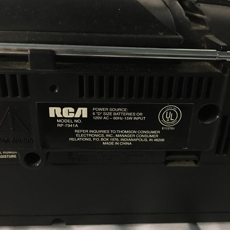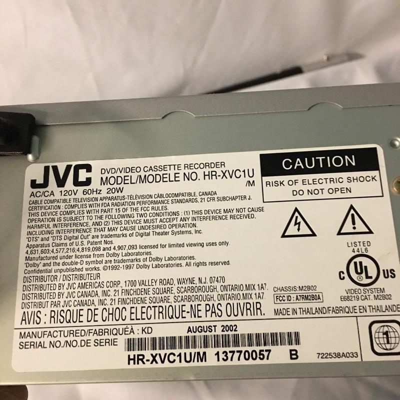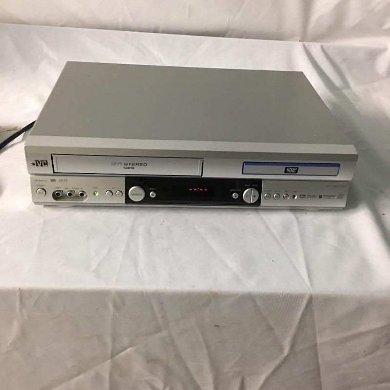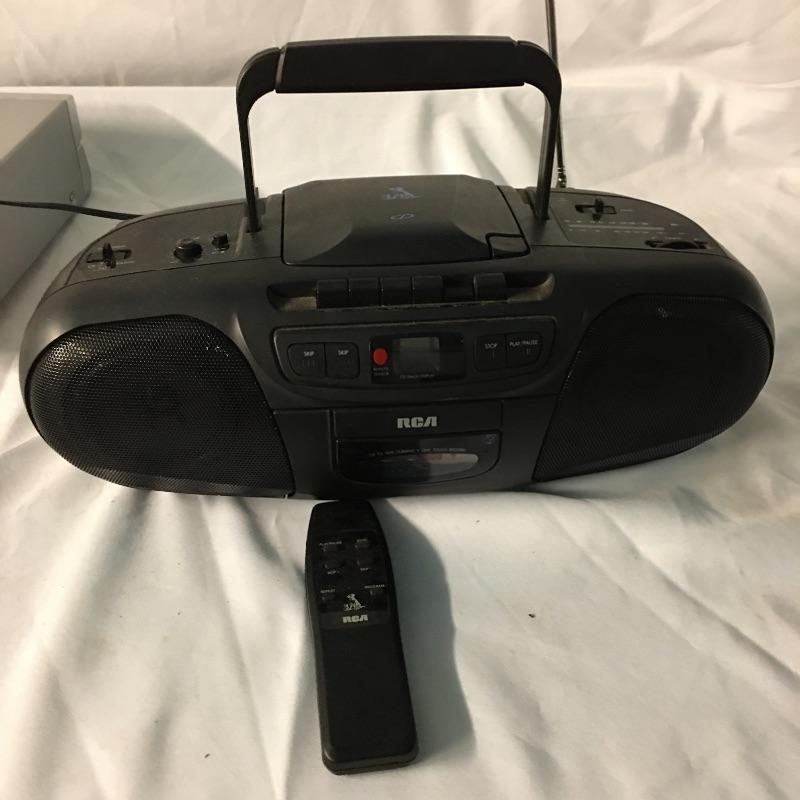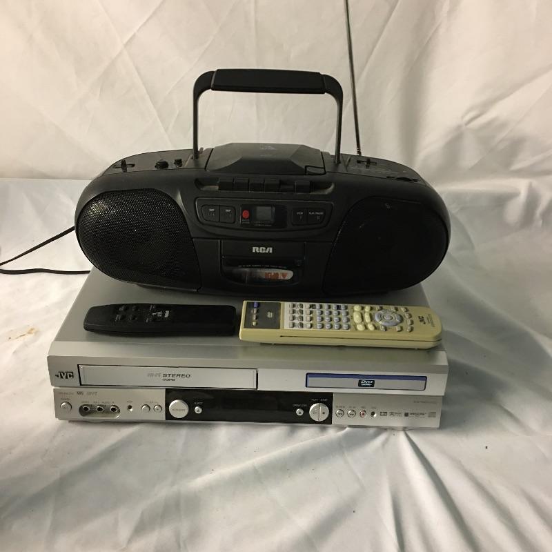Jam out like it’s 1980 with this boom box and VHS player. JVC VCR and DVD player model # HR-XVC1U with remote and a RCA Boombox with CD and cassette player and remote. Radio worked when tested and VCR /DVD powered on when tested.