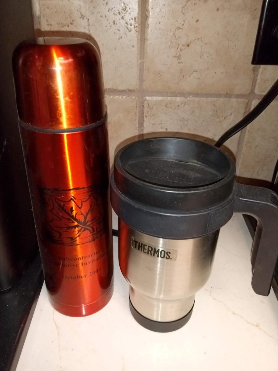 LOT 313 KEURIG SINGLE CUP COFFEE MAKER, TRAVEL MUG AND SMALL THERMOS