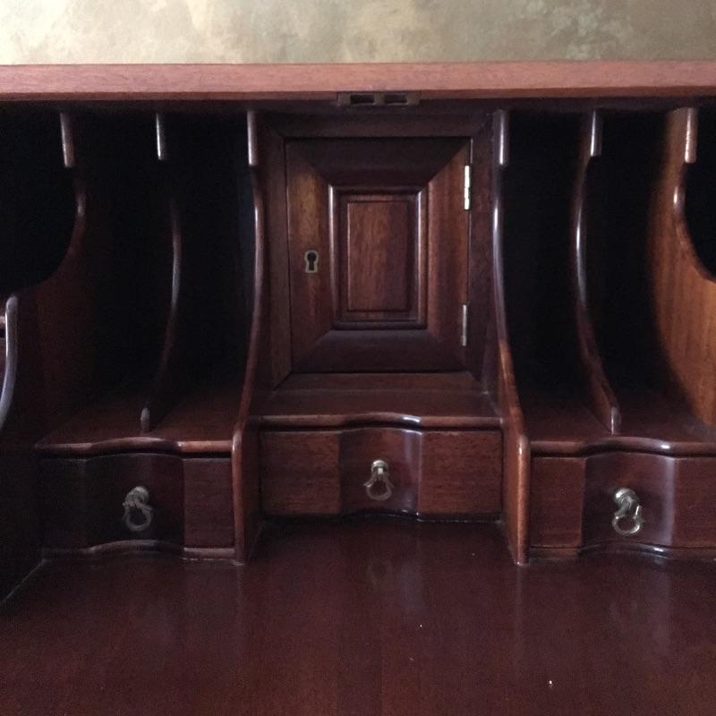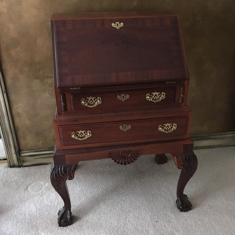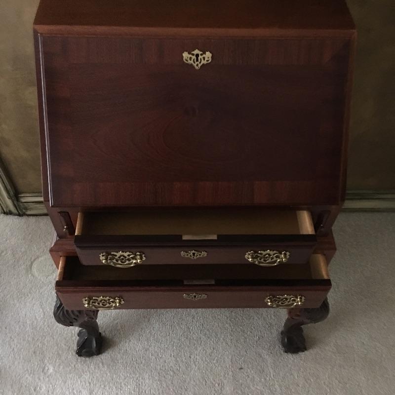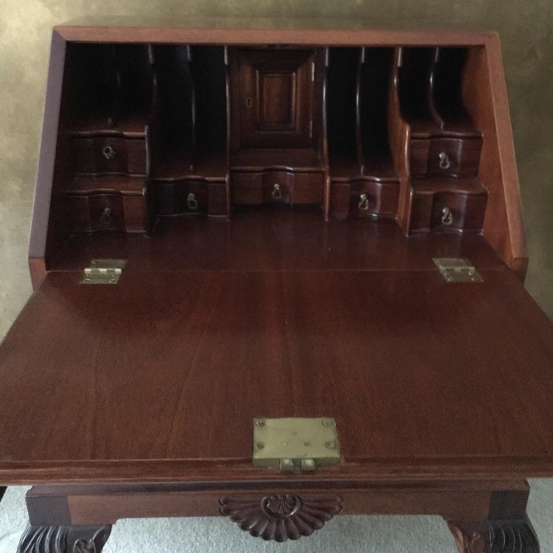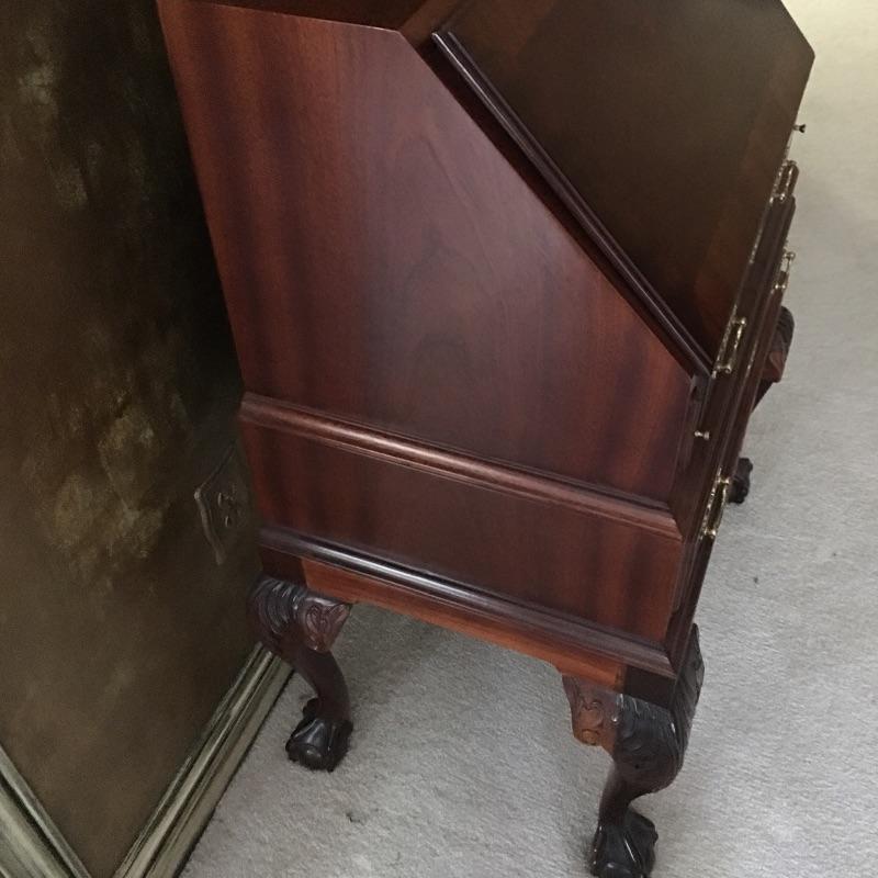 This Queen Anne style secretary desk is both quaint, elegant and useful. It has claw feet, two drawers on the bottom with seven small drawers and eight letter slots and a compartment on top. Both keys are included.