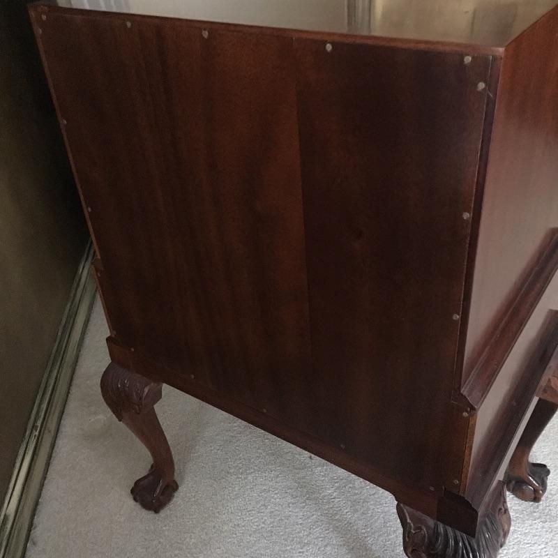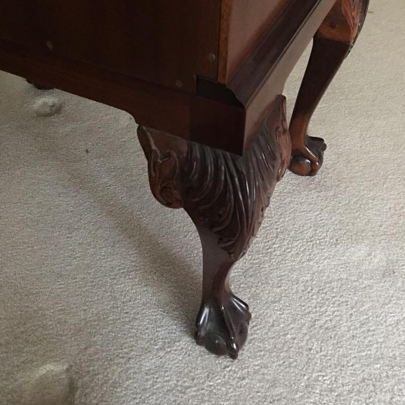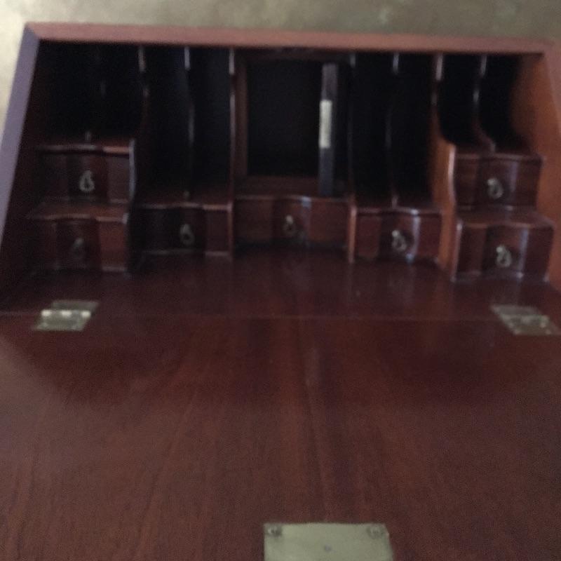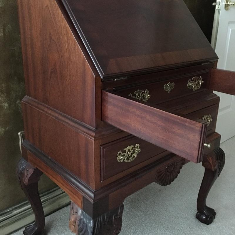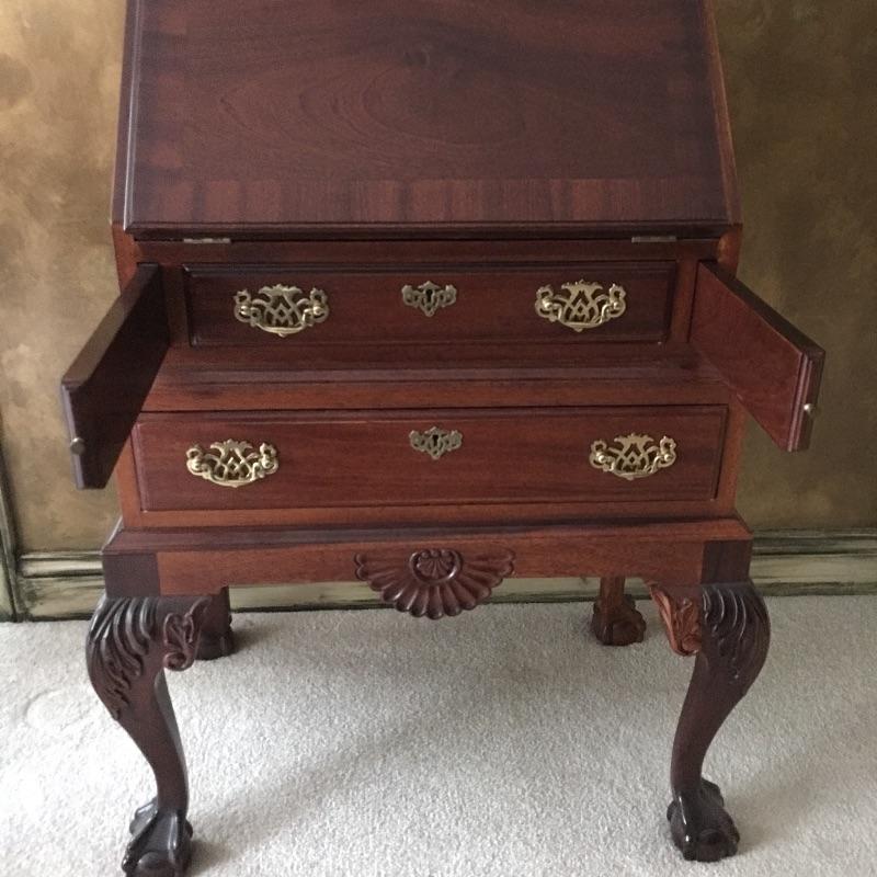 This Queen Anne style secretary desk is both quaint, elegant and useful. It has claw feet, two drawers on the bottom with seven small drawers and eight letter slots and a compartment on top. Both keys are included.