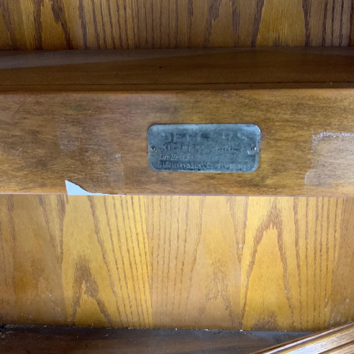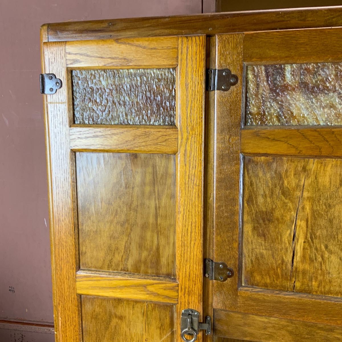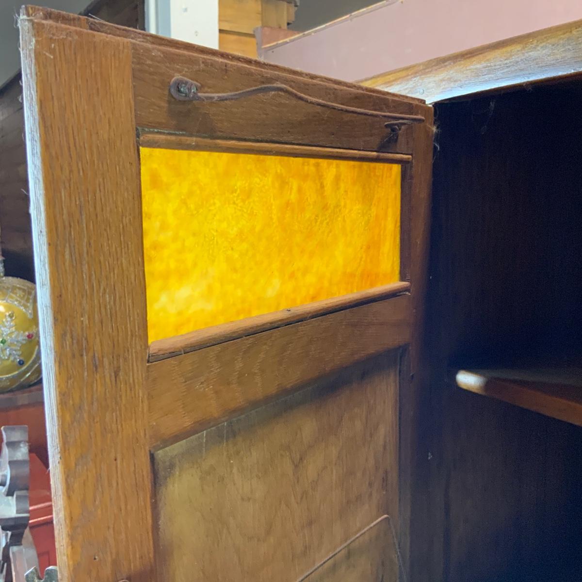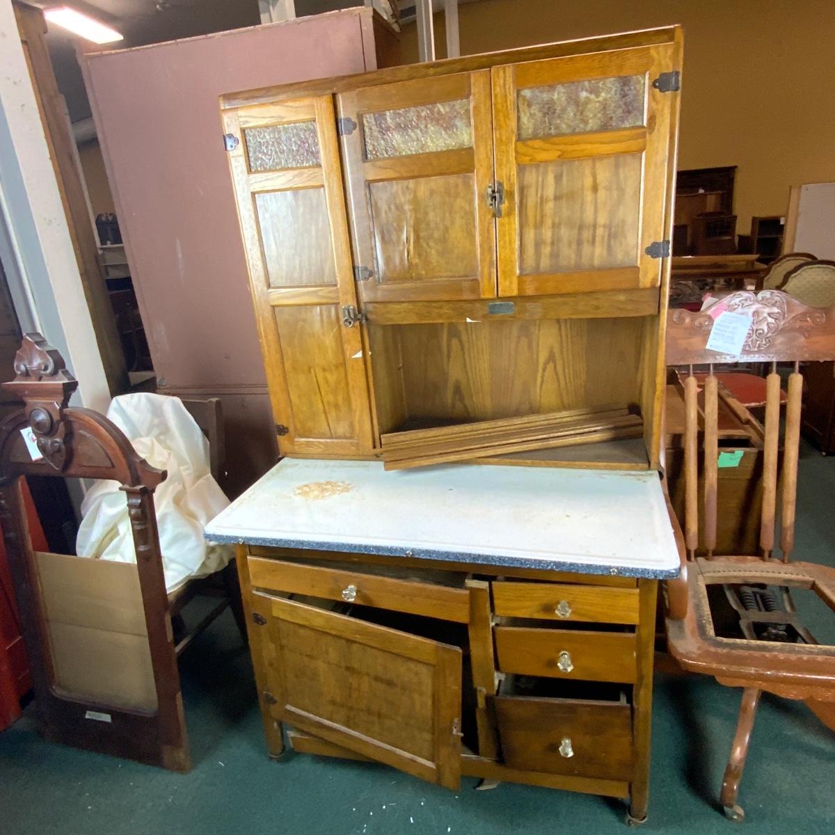SELLERS Birch and Oak Hoosier. Counter pulls out, but needs some oil. Nice flour dispenser. Slag glass inserts in the doors. //::\\ Please see photos for details and condition. No attempt has been made to hide any imperfections. All items listed in this auction are warehouse items, and need to be cleaned. A majority of the items need restoration as well. All items are sold AS IS and WITHOUT GUARANTEE. If you are uncertain about an item, DO NOT BID. Due to the nature of this online auction in-person inspection is HIGHLY recommended. All Sales are FINAL. Pick Up Times are FIRM. Please confirm with your own schedule that you can pick up in the scheduled times listed in the Terms and Conditions. Any questions please message the auctioneer. DO NOT Contact The Harp Gallery.