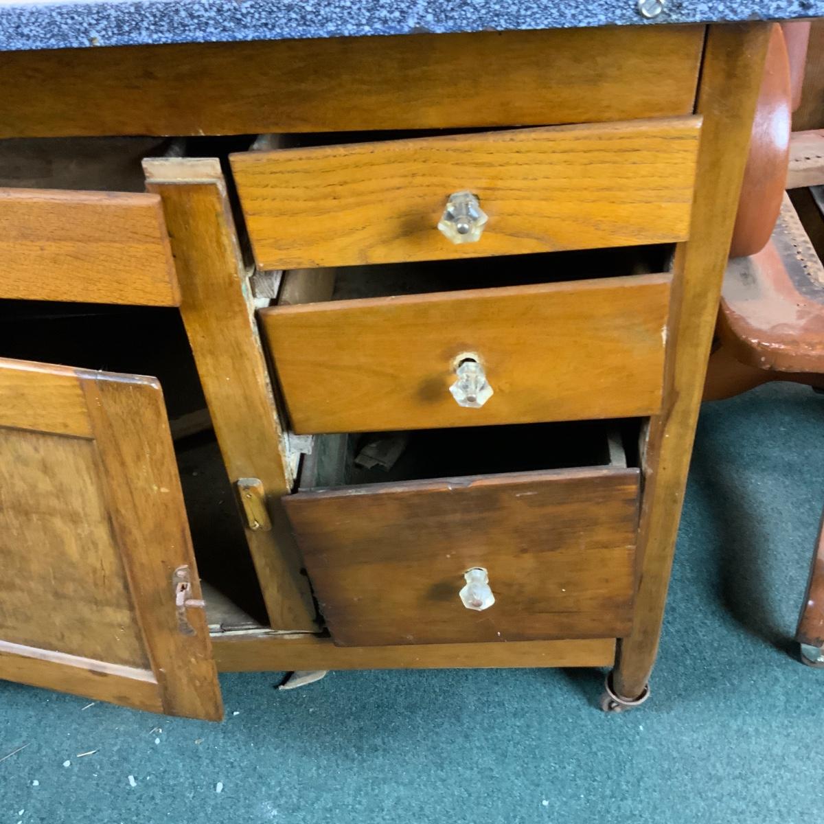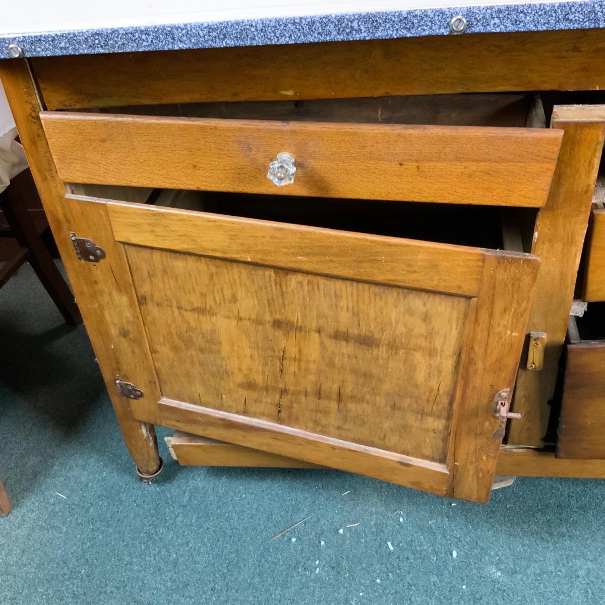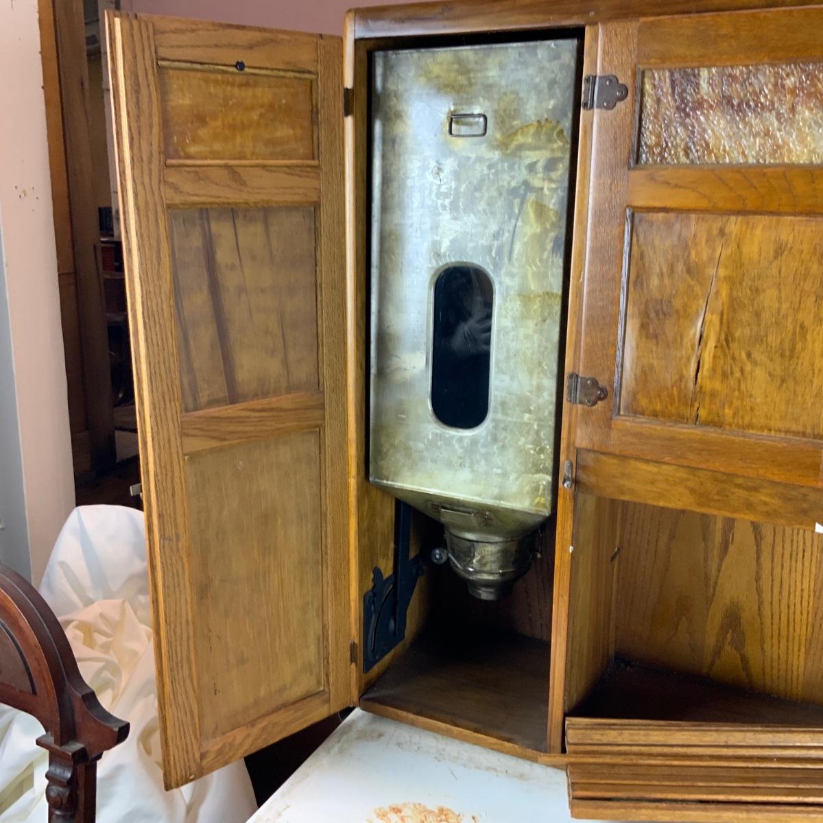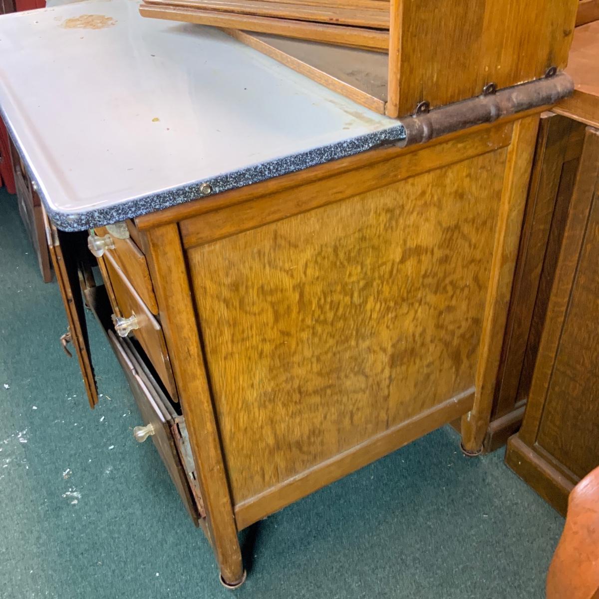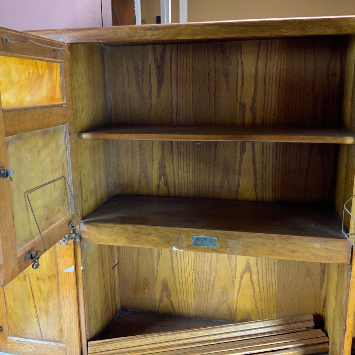 SELLERS Birch and Oak Hoosier. Counter pulls out, but needs some oil. Nice flour dispenser. Slag glass inserts in the doors. //::\\ Please see photos for details and condition. No attempt has been made to hide any imperfections. All items listed in this auction are warehouse items, and need to be cleaned. A majority of the items need restoration as well. All items are sold AS IS and WITHOUT GUARANTEE. If you are uncertain about an item, DO NOT BID. Due to the nature of this online auction in-person inspection is HIGHLY recommended. All Sales are FINAL. Pick Up Times are FIRM. Please confirm with your own schedule that you can pick up in the scheduled times listed in the Terms and Conditions. Any questions please message the auctioneer. DO NOT Contact The Harp Gallery.