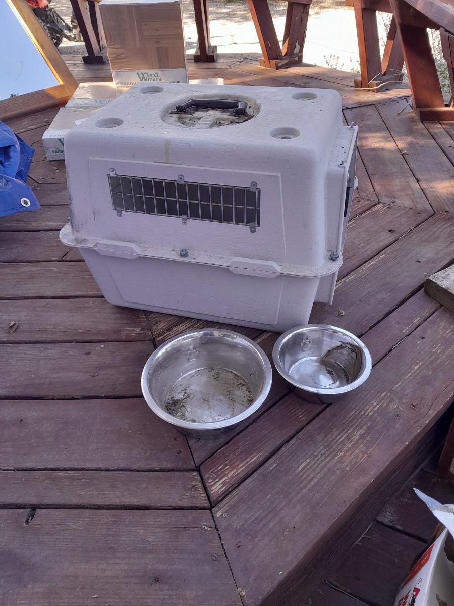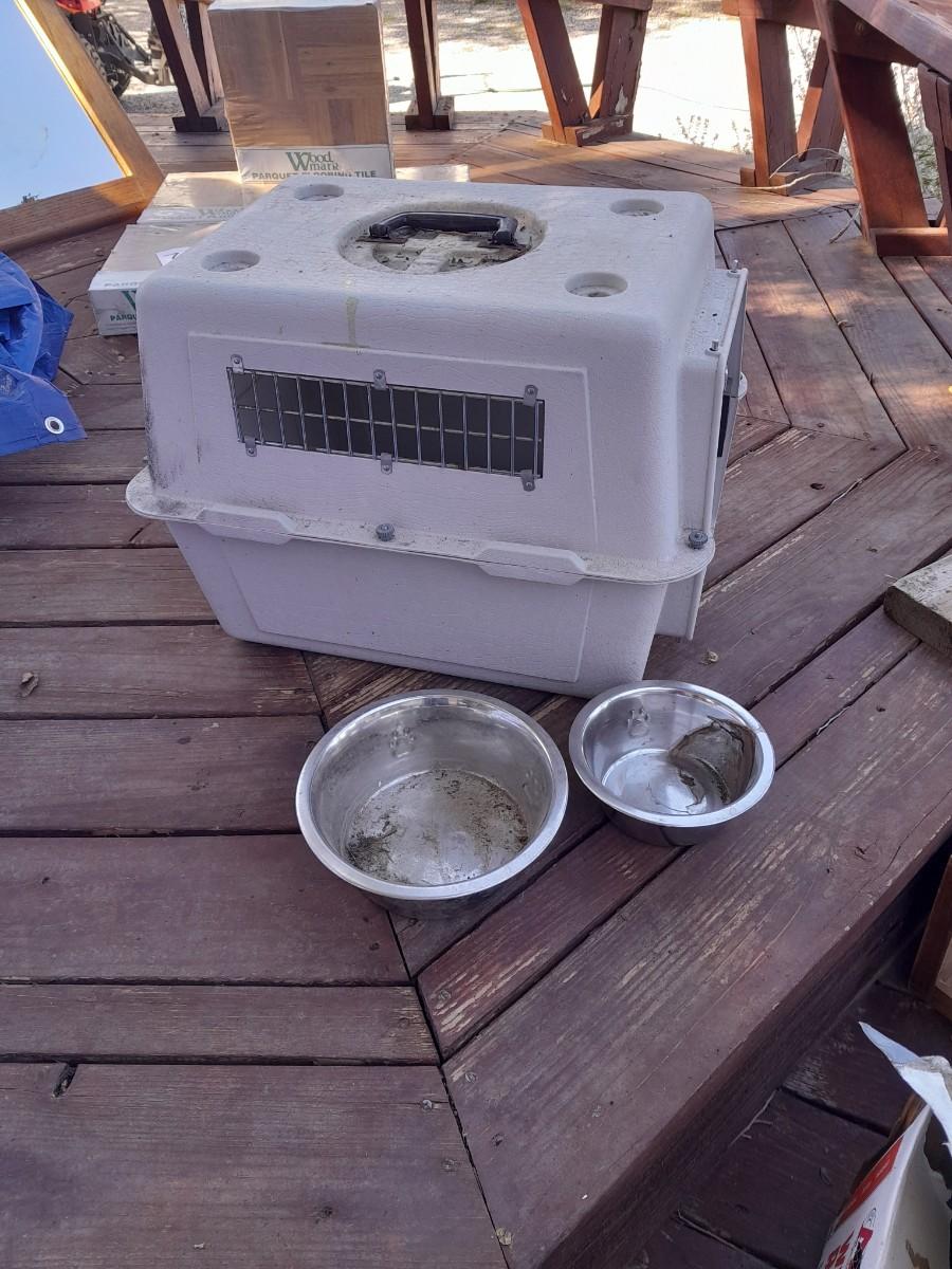 SMALL DOG KENNEL AND FOOD / WATER BOWLS