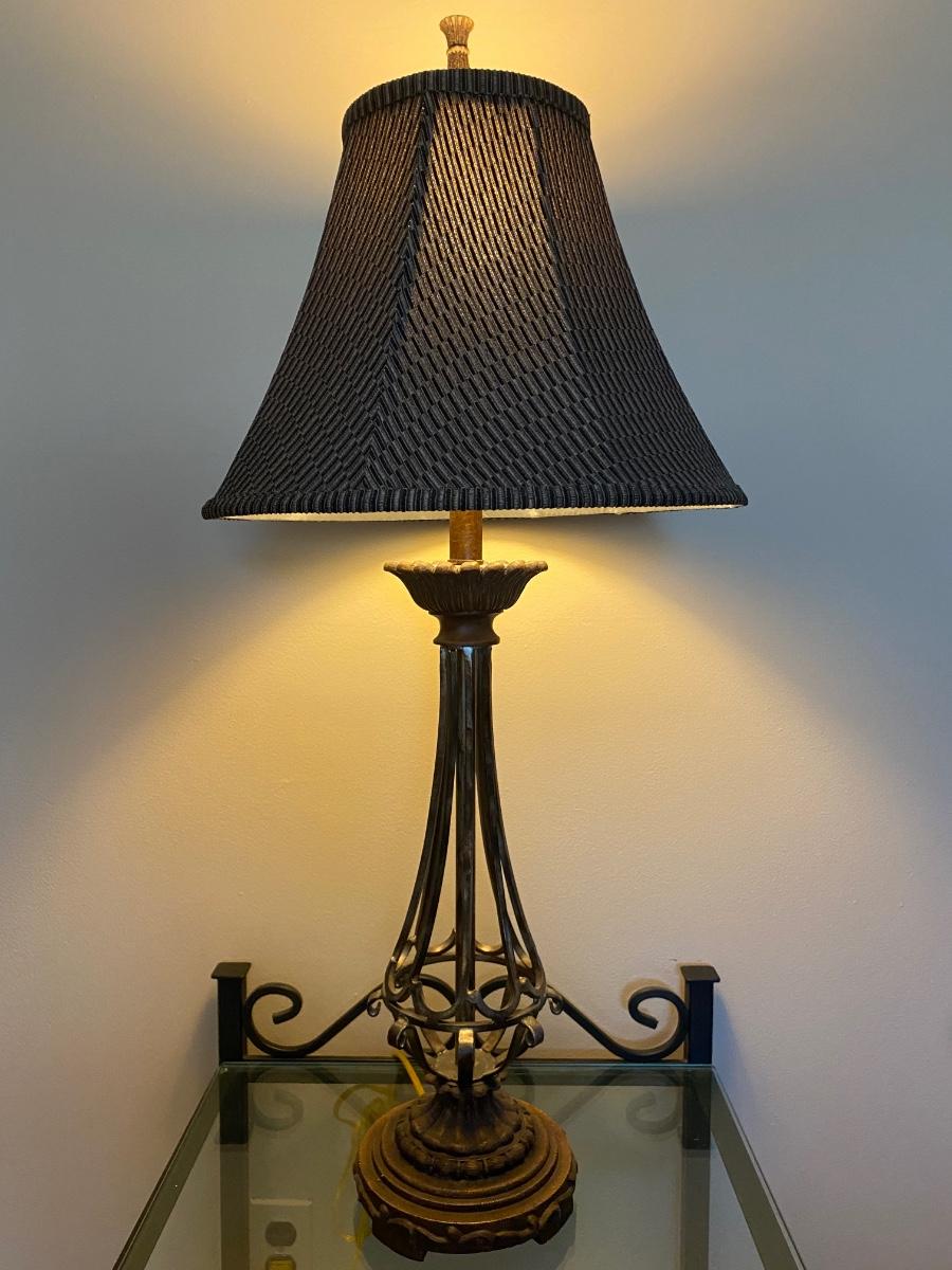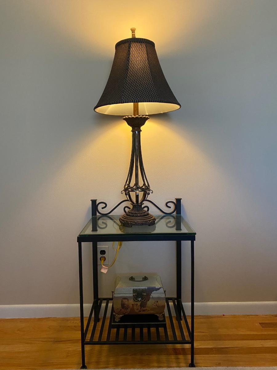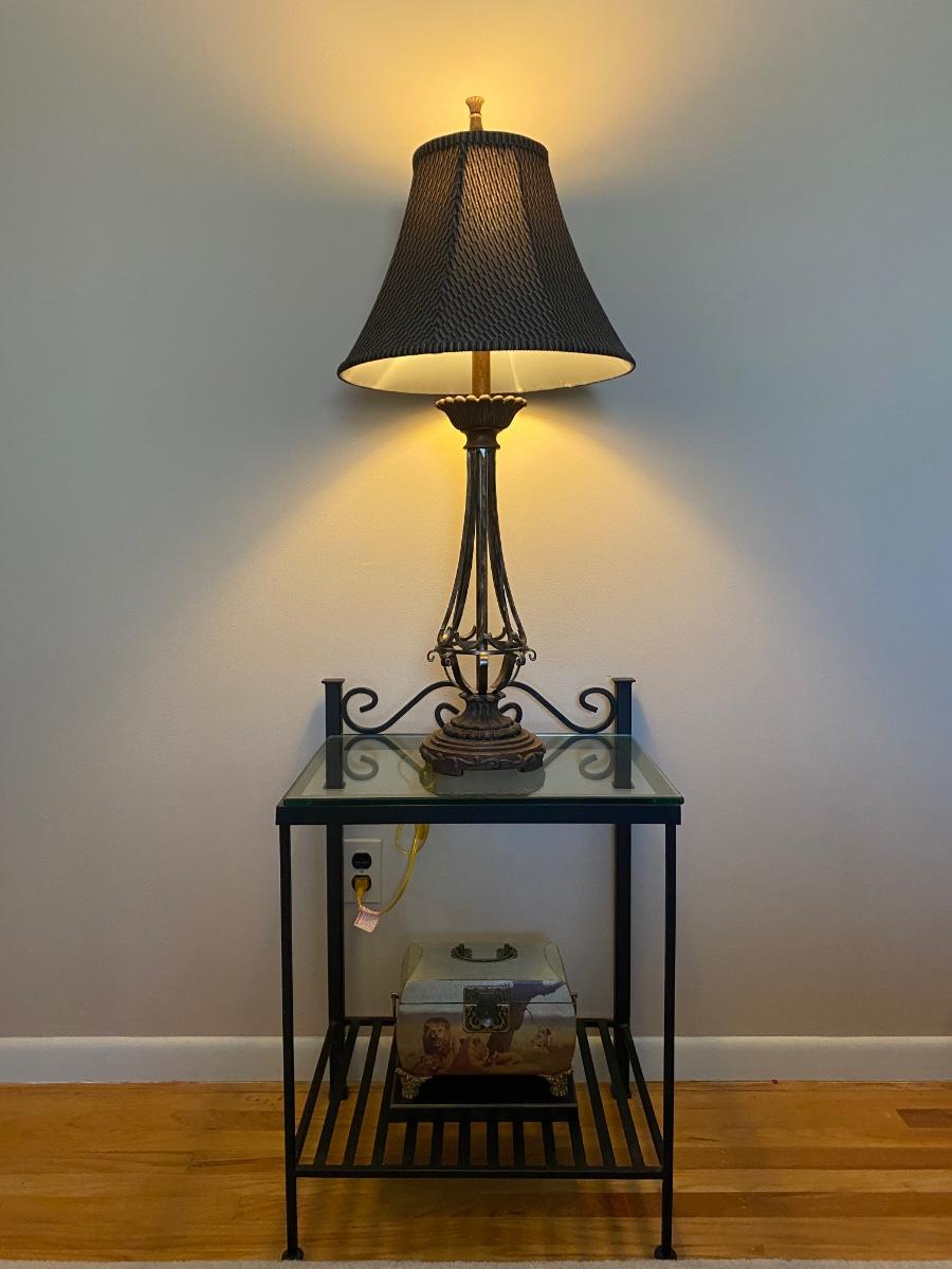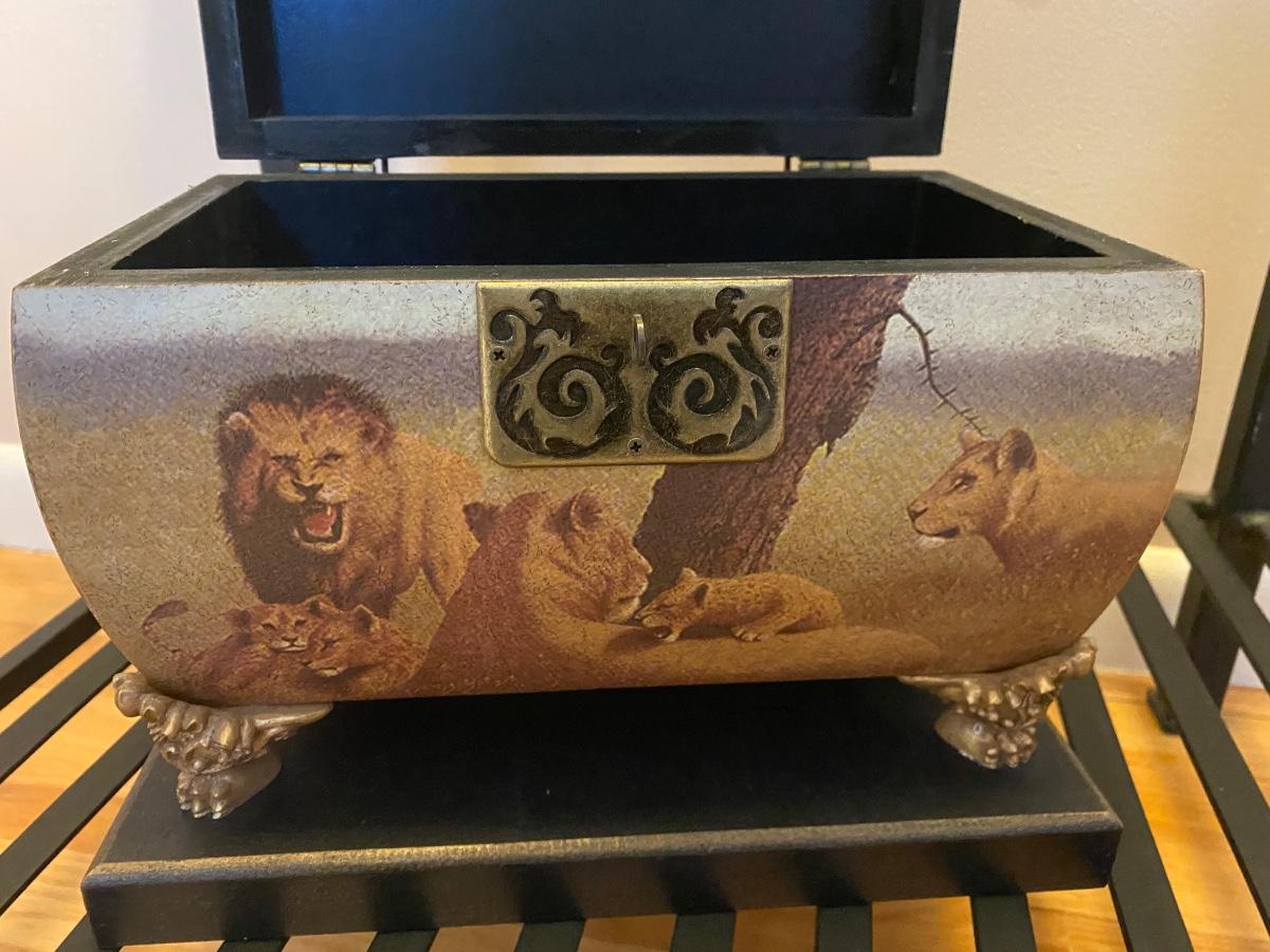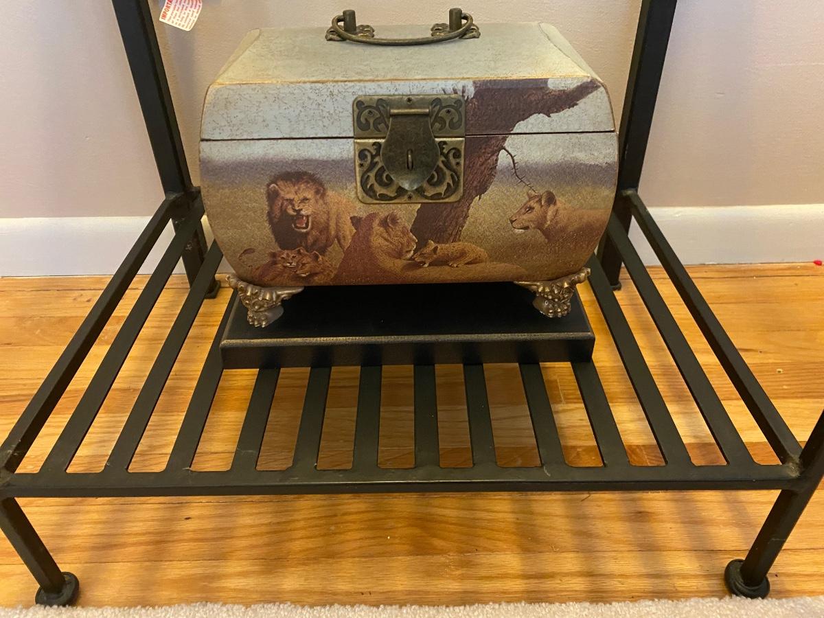 Metal lamp has black shade. Storage box has beautiful lion decor.