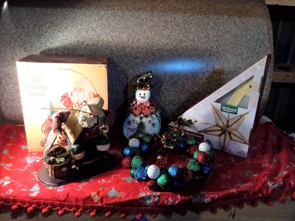 LOT 314  FISHING SANTA, BELL WREATH, METAL SNOWMAN CANDLE HOLDER AND MORE  (HD)